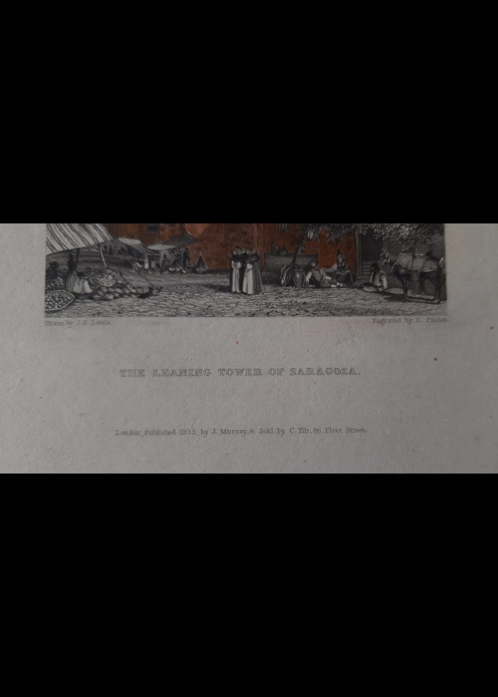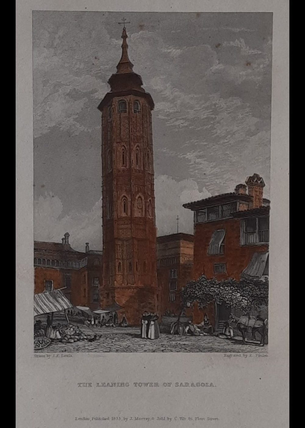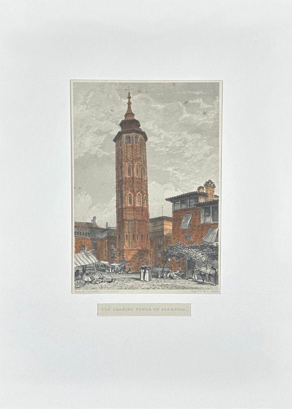 This colored engraving, drawn by J.F. Lewis and engraved by E. Finden, depicts the Leaning Tower of Zaragoza (Saragossa), Spain. The tall, intricately detailed Mudejar-style tower is shown leaning slightly, rising above a lively plaza scene with townspeople, market stalls, and surrounding buildings. Published in 1839 by J. Murray, this historical print captures both architectural beauty and the charm of daily life in 19th-century Zaragoza.