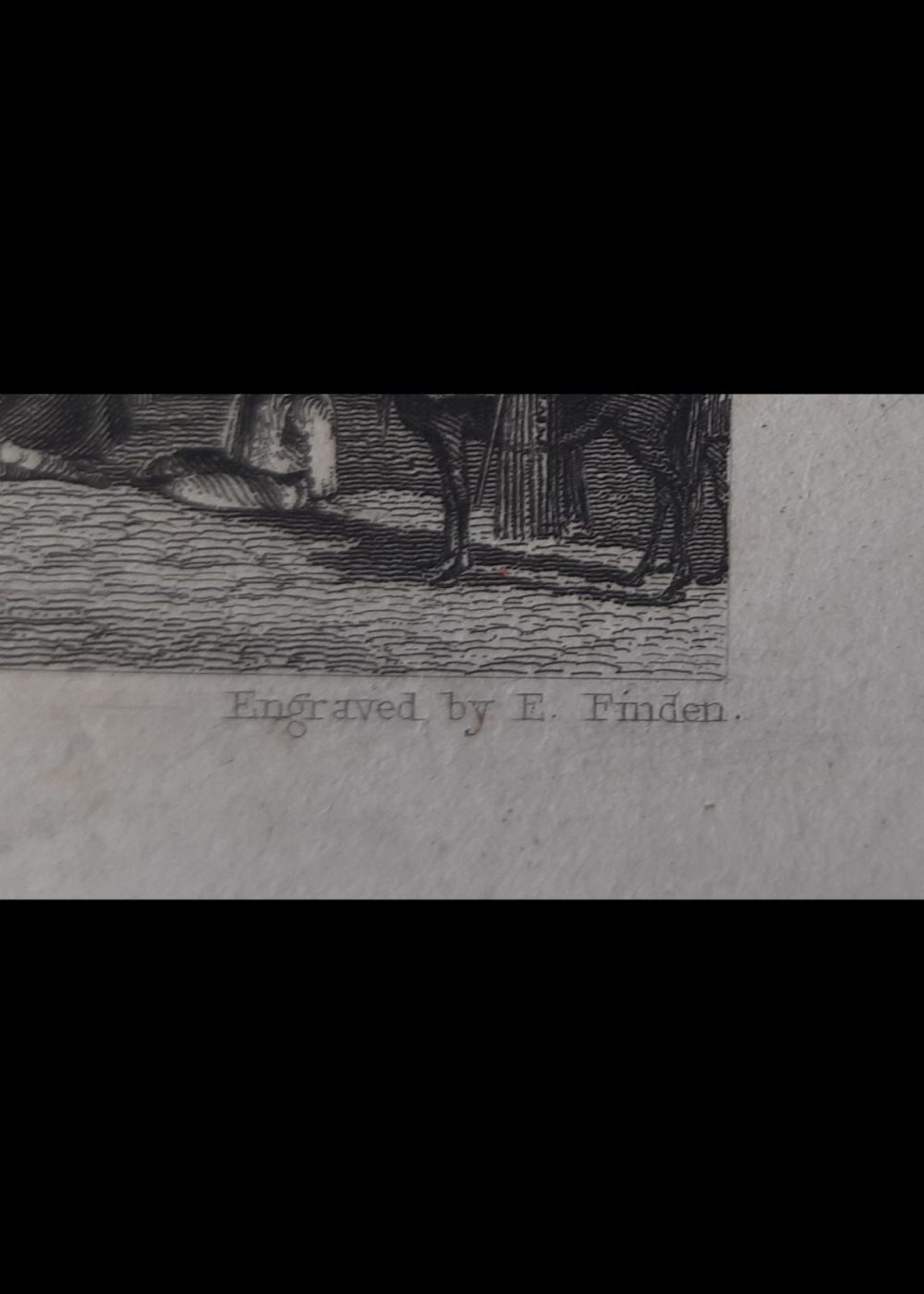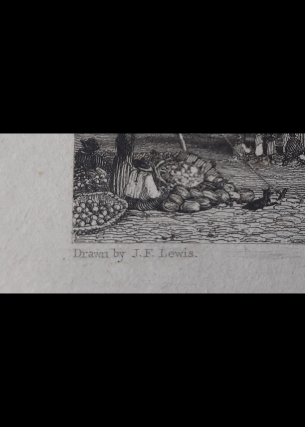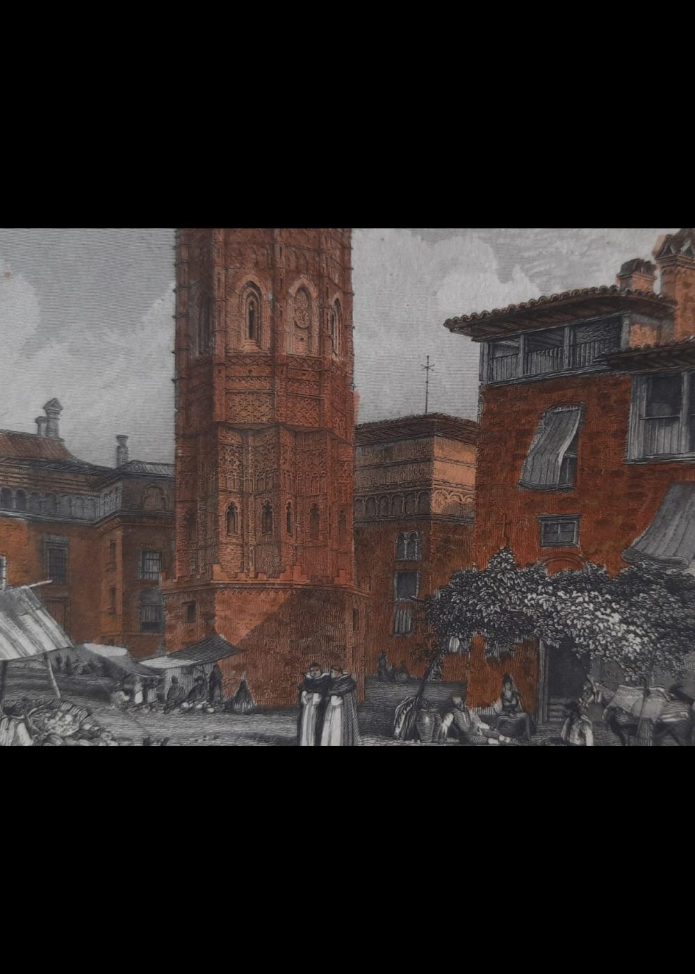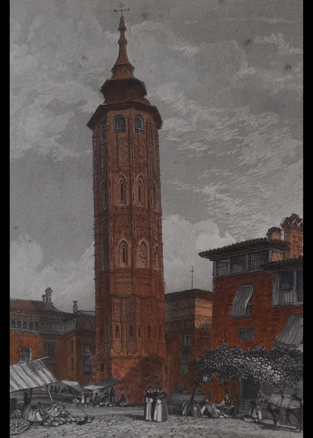This colored engraving, drawn by J.F. Lewis and engraved by E. Finden, depicts the Leaning Tower of Zaragoza (Saragossa), Spain. The tall, intricately detailed Mudejar-style tower is shown leaning slightly, rising above a lively plaza scene with townspeople, market stalls, and surrounding buildings. Published in 1839 by J. Murray, this historical print captures both architectural beauty and the charm of daily life in 19th-century Zaragoza.