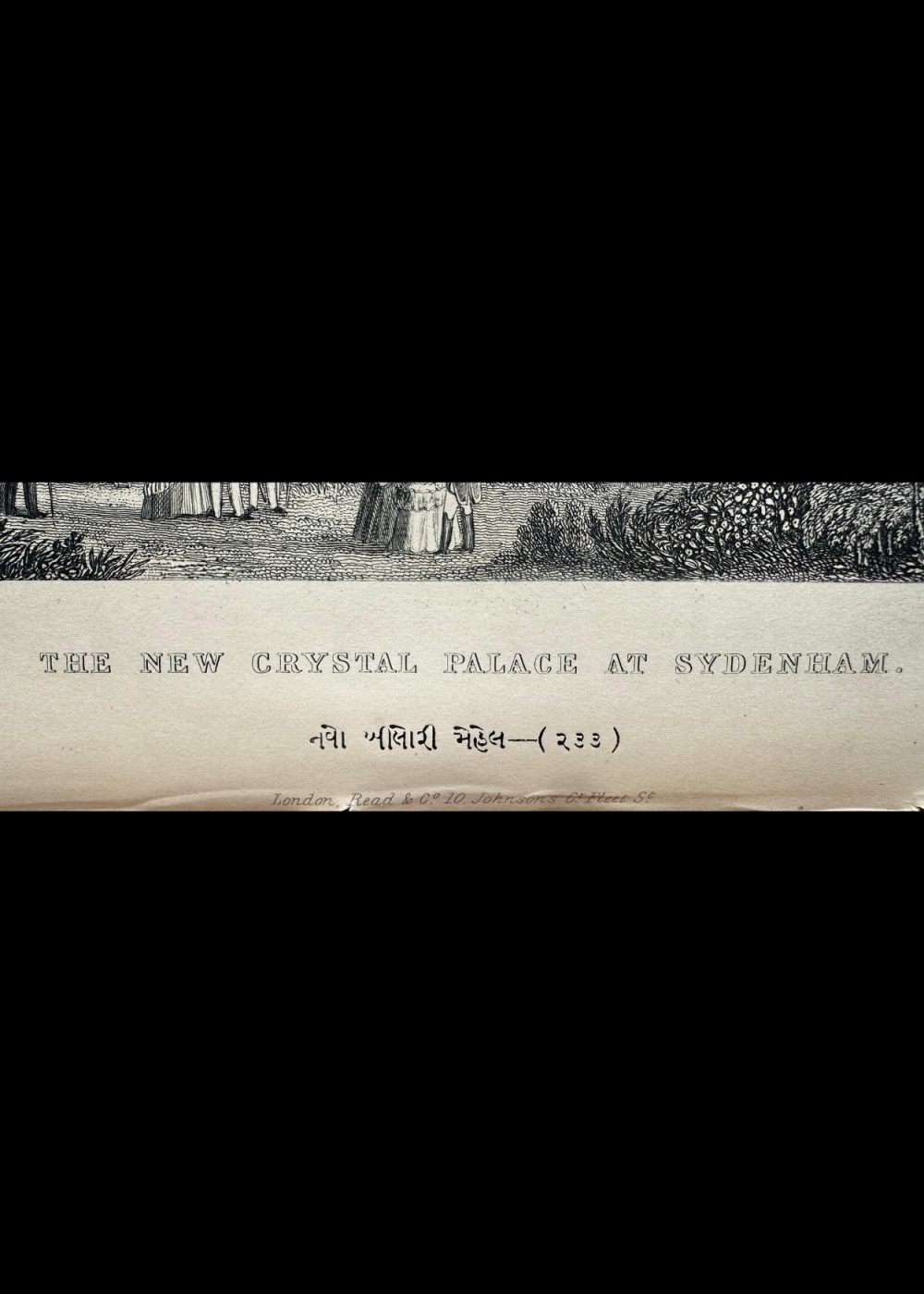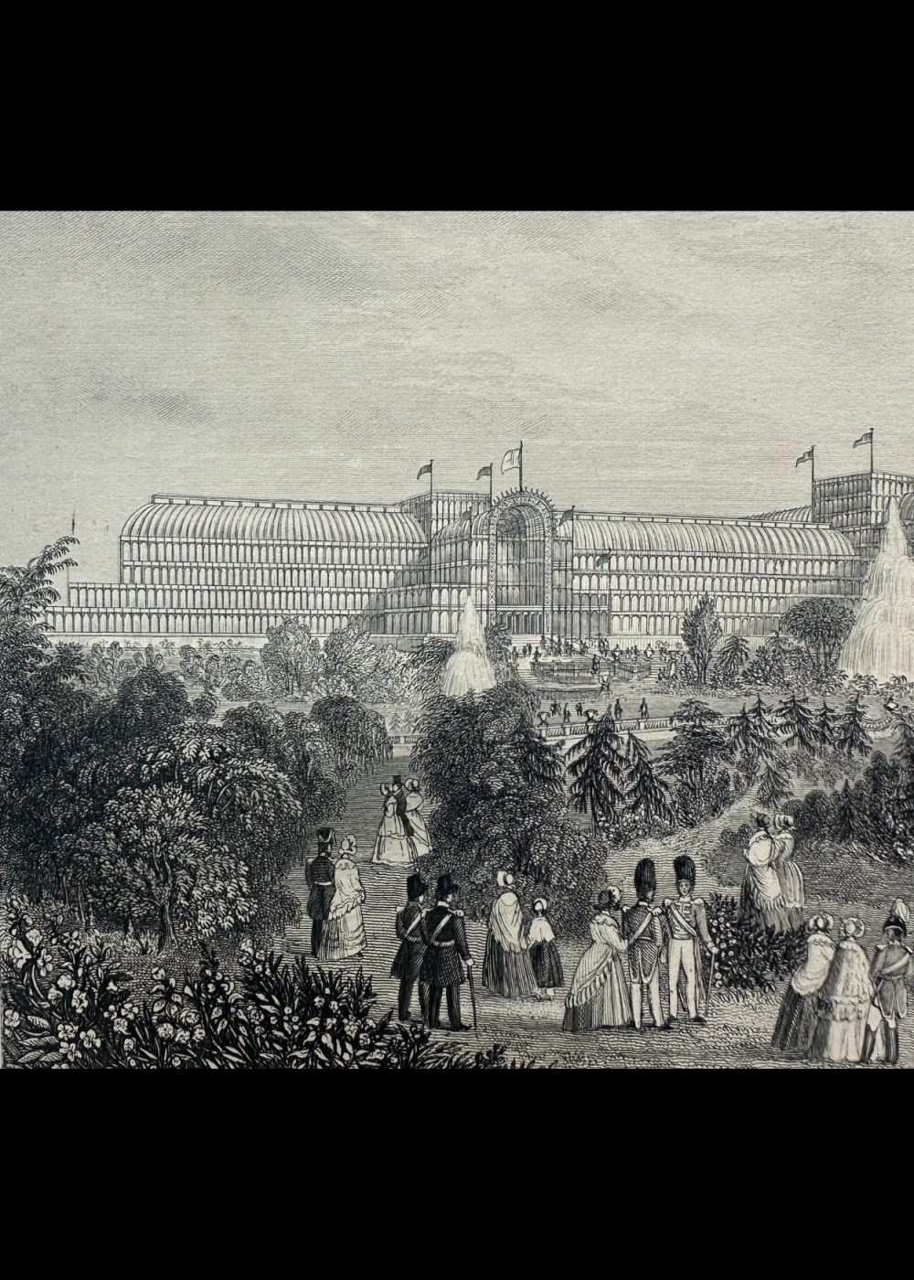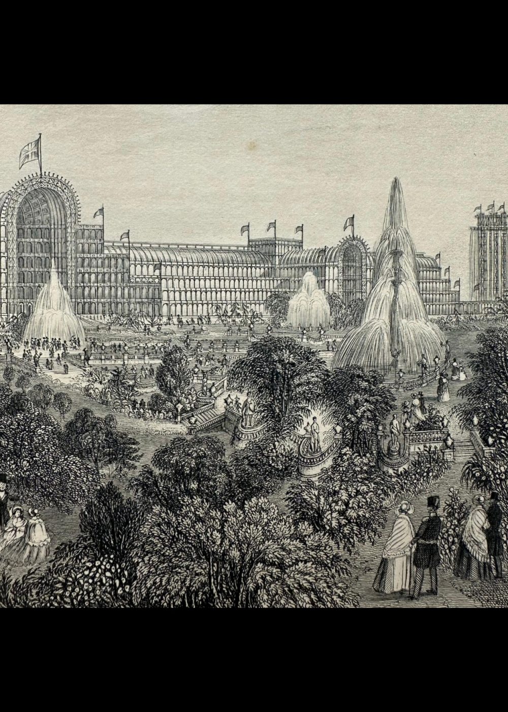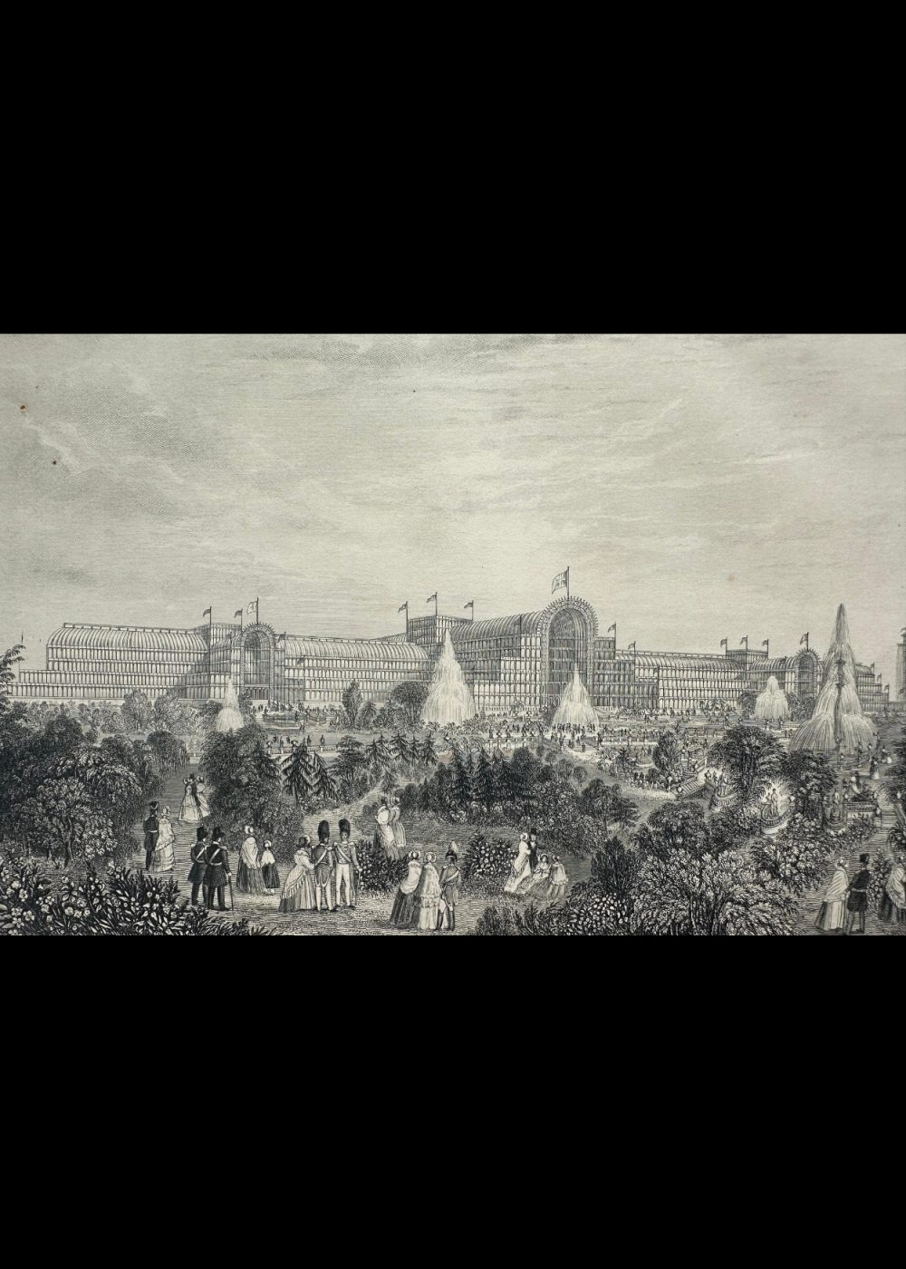 This engraving showcases the New Crystal Palace at Sydenham, located in South London, after it was relocated from Hyde Park following the 1851 Great Exhibition. The illustration depicts the grand structure surrounded by beautifully landscaped gardens, fountains, and a large crowd of visitors, including elegantly dressed people strolling through the grounds. The Crystal Palace is seen in its full glory with its glass and iron framework, topped with flags fluttering in the breeze. The image captures the architectural magnificence of the building, set against a peaceful and lush natural backdrop, emphasizing the cultural and leisure aspect of the site after its transformation into a public attraction.