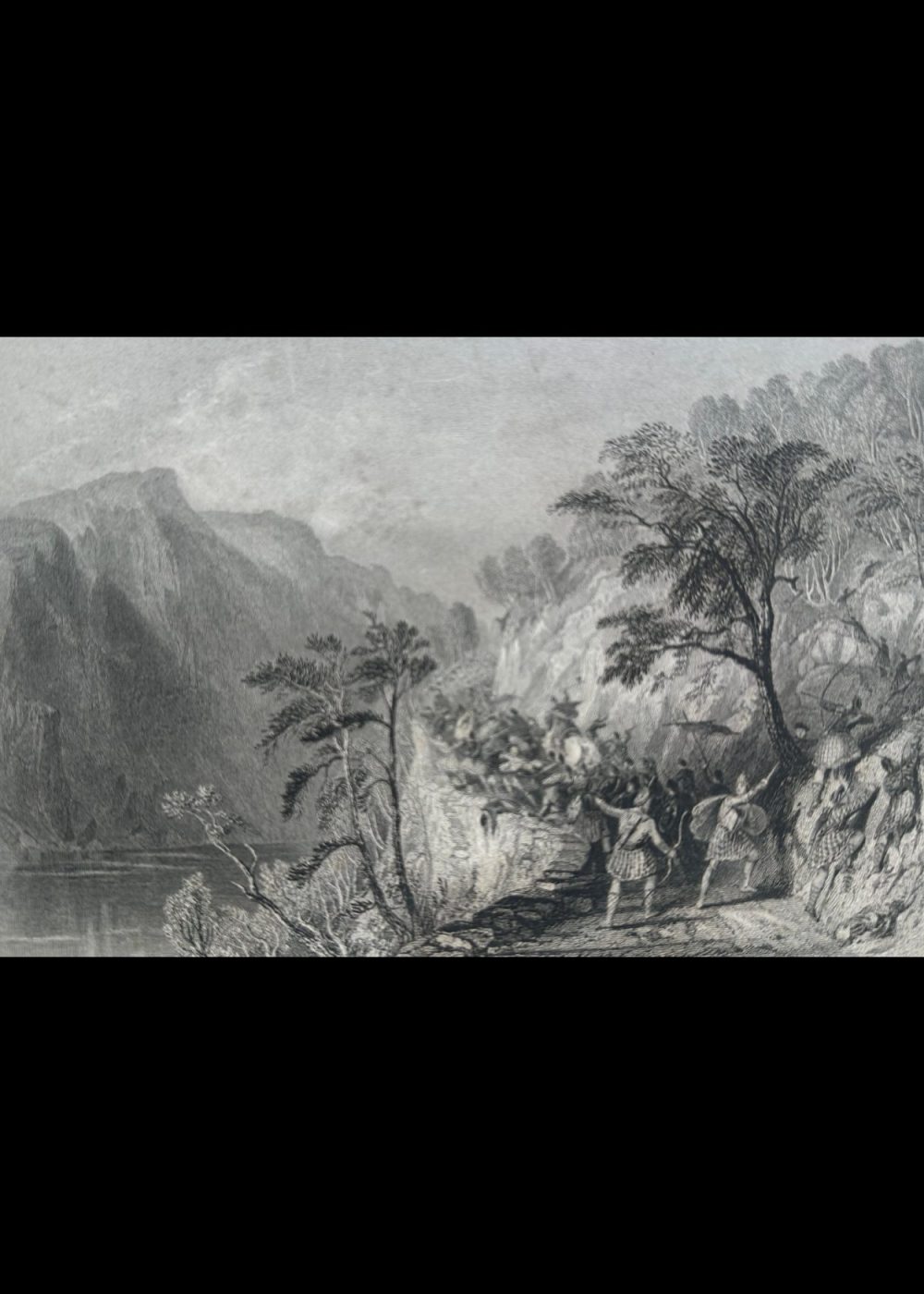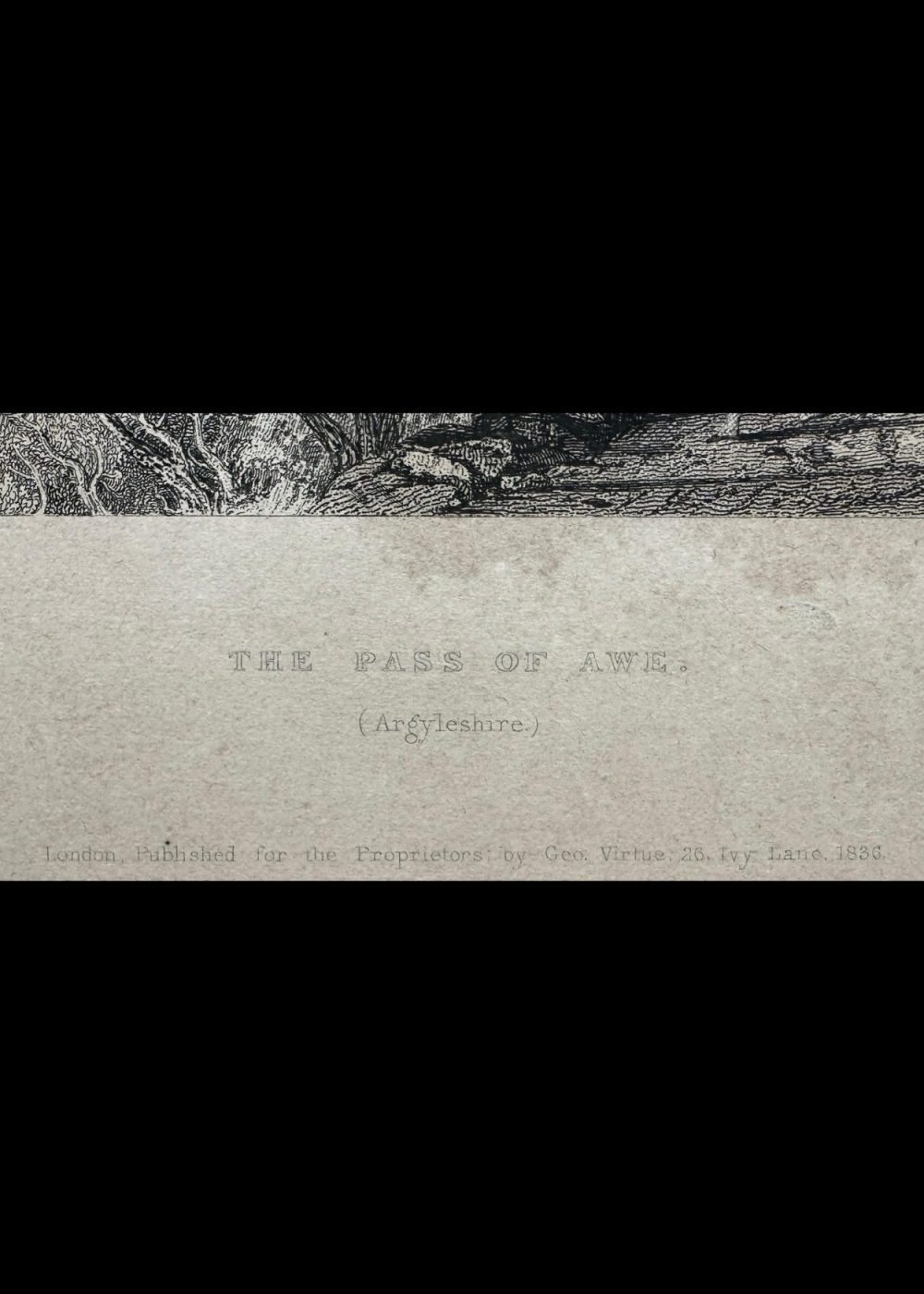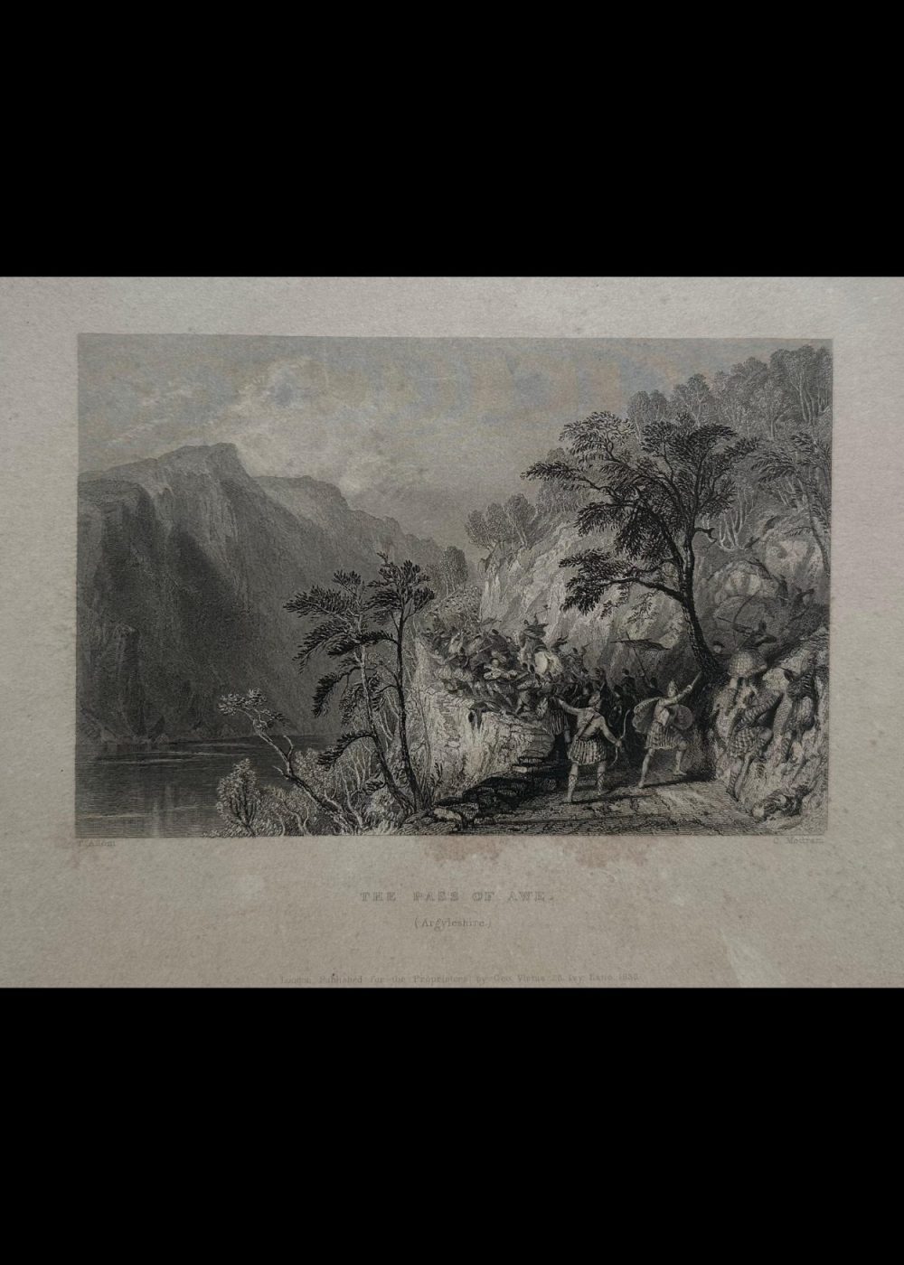 London, Published for the Proprietors, by Geo: Virtue, 26 Ivy Lane, 1836. This detailed 19th-century engraving depicts the dramatic and narrow Pass of Awe in Argyleshire, Scotland. The scene shows a winding path carved into steep, rocky cliffs, lined with Highland warriors carrying shields and spears, advancing cautiously through the wooded terrain. Towering mountains rise on the left, framing a tranquil loch below, while dense forest and rugged rocks envelop the passage. The composition highlights both the natural majesty and the strategic significance of this historic Highland route.