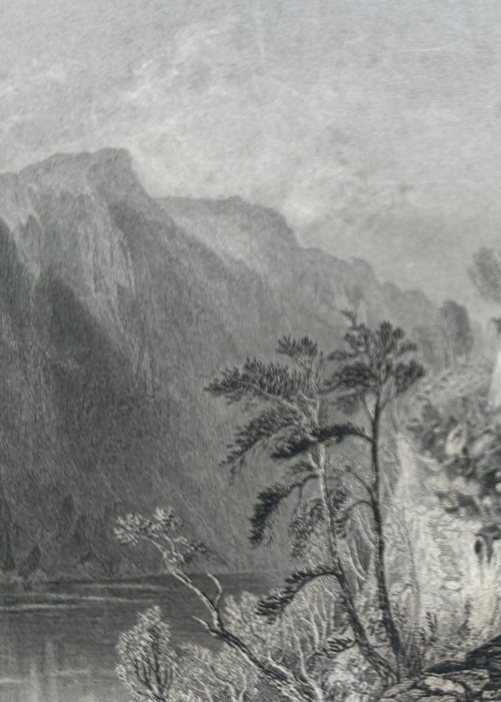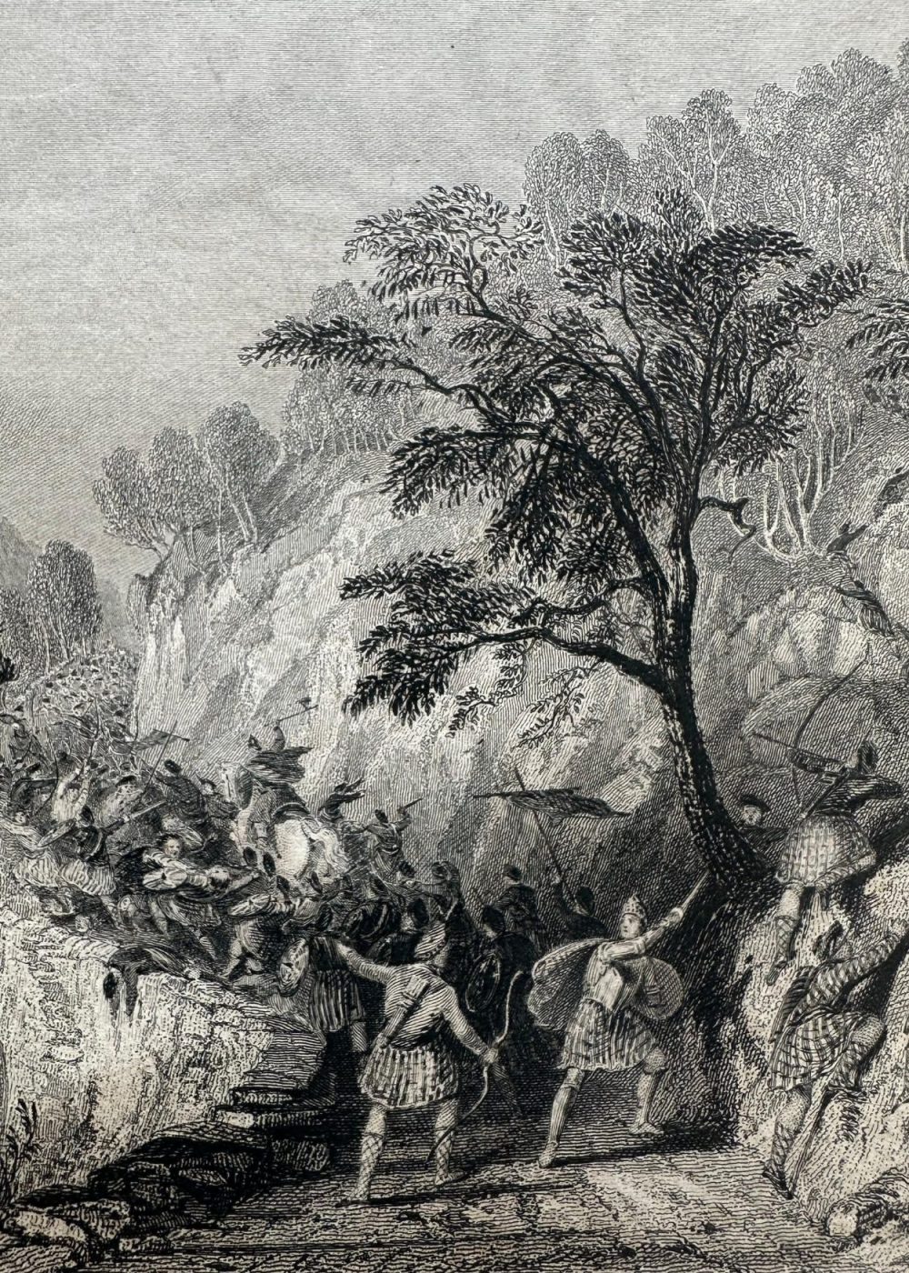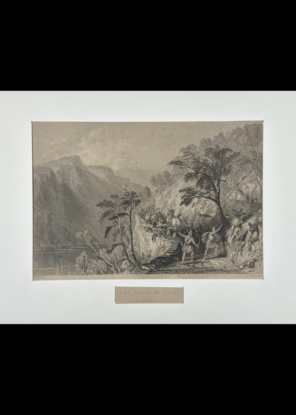 London, Published for the Proprietors, by Geo: Virtue, 26 Ivy Lane, 1836. This detailed 19th-century engraving depicts the dramatic and narrow Pass of Awe in Argyleshire, Scotland. The scene shows a winding path carved into steep, rocky cliffs, lined with Highland warriors carrying shields and spears, advancing cautiously through the wooded terrain. Towering mountains rise on the left, framing a tranquil loch below, while dense forest and rugged rocks envelop the passage. The composition highlights both the natural majesty and the strategic significance of this historic Highland route.