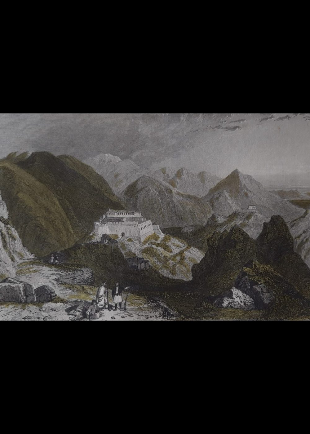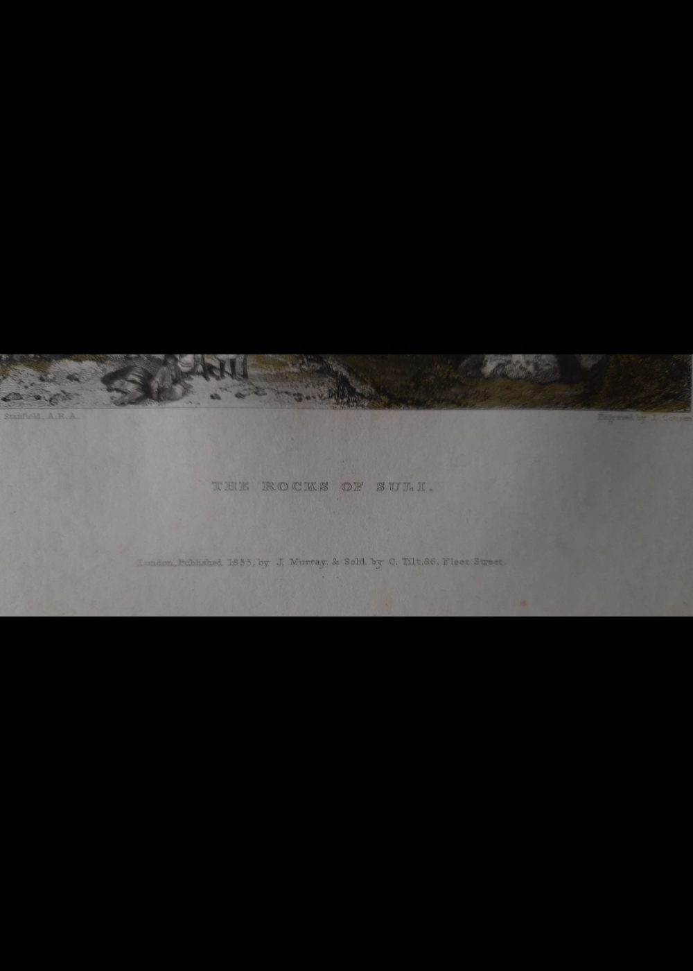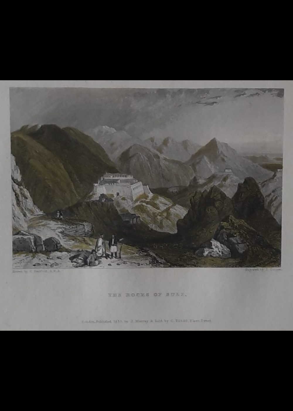 This dramatic engraving, titled The Rocks of Suli, captures a mountainous landscape dominated by craggy peaks and steep valleys. A fortress-like structure, perched prominently on a rocky slope, is surrounded by winding paths and additional watchtowers in the distance, suggesting a strategic location. In the foreground, a small group of travelers, including a reclining figure, observe the vast terrain. Drawn by C. Stanfield and engraved by J. Cousen, the print was published in 1833 by J. Murray. It vividly conveys the rugged beauty and isolation of this alpine stronghold.
