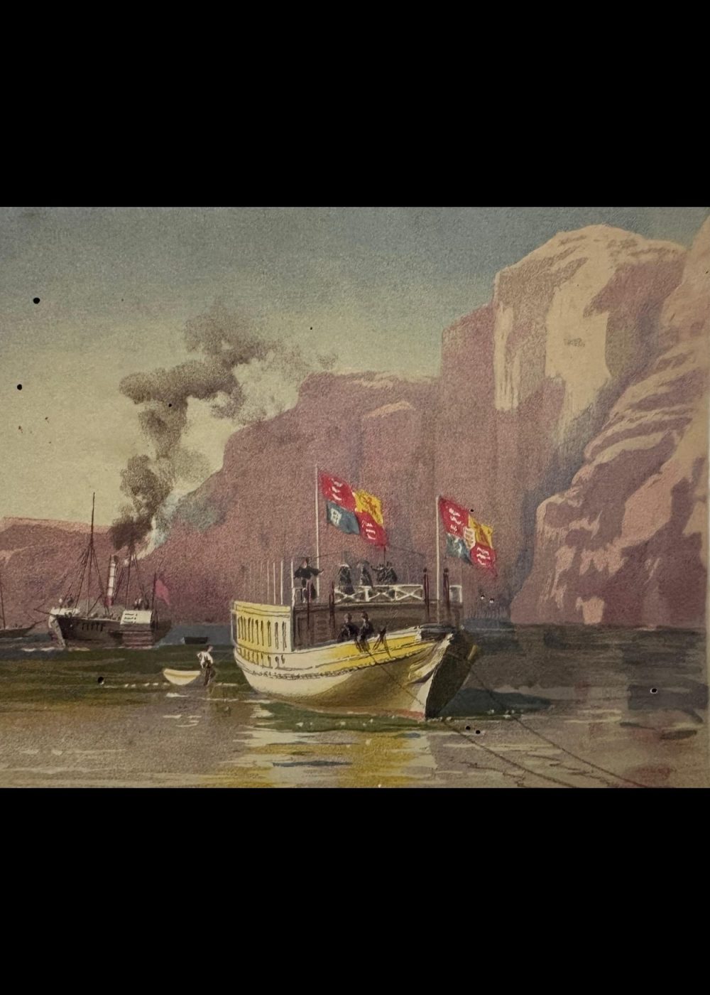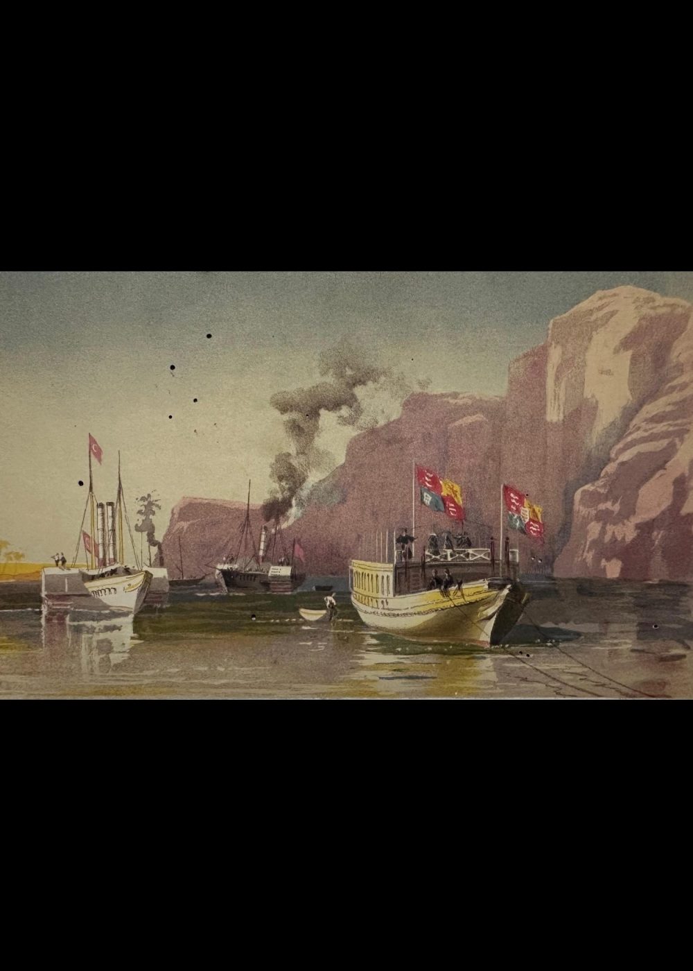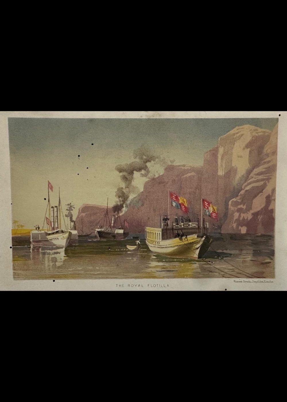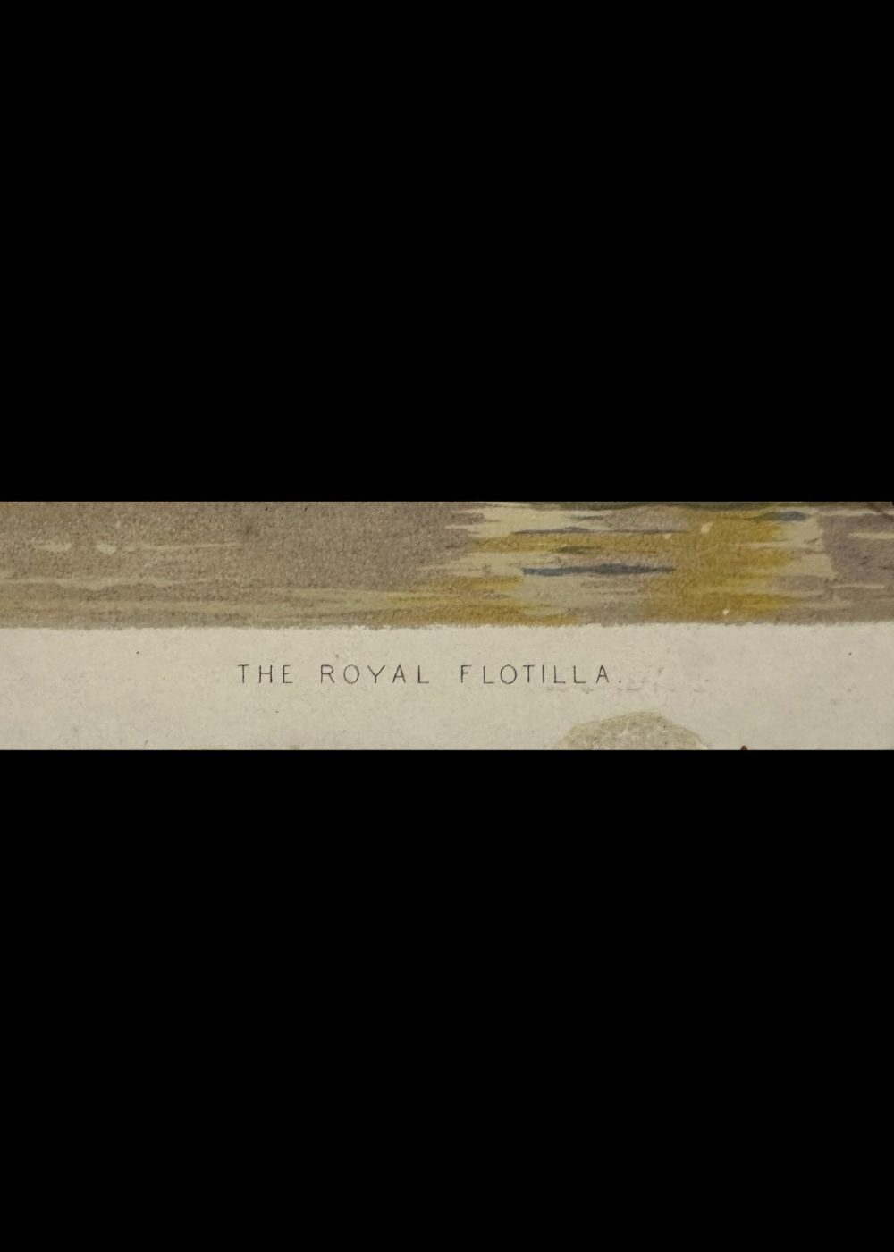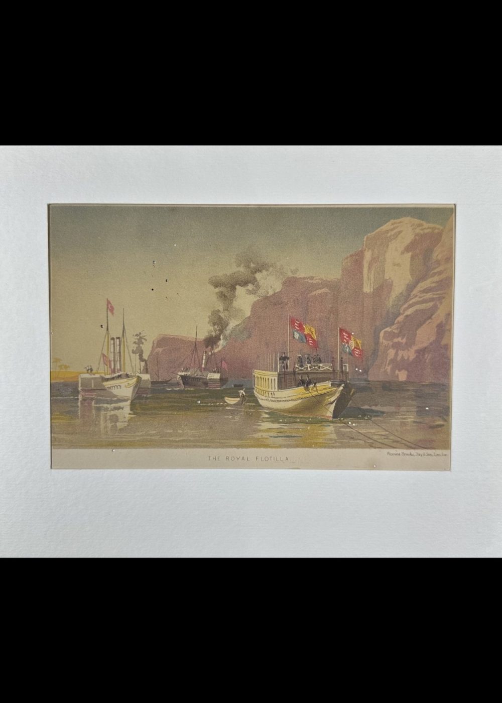 This striking 19th-century lithograph titled “The Royal Flotilla” presents a colorful and ceremonious maritime scene, likely set along the Nile or a similarly majestic waterway. At the forefront, a grand royal barge adorned with vibrant flags and ornate detailing floats calmly near a dramatic cliffside. Figures aboard the vessel appear engaged in formal duties or ceremonial activity, underscoring the flotilla’s official or regal nature.