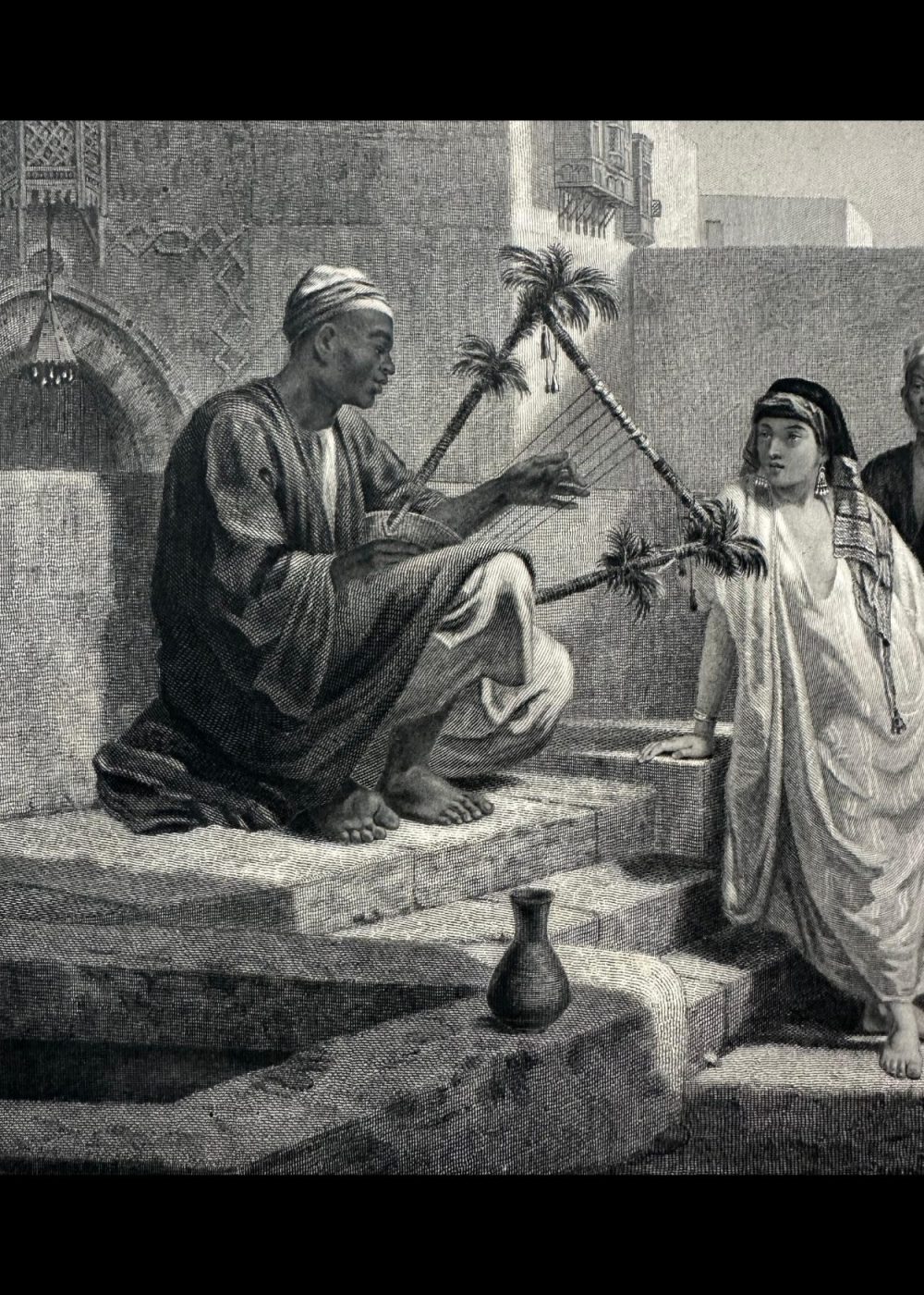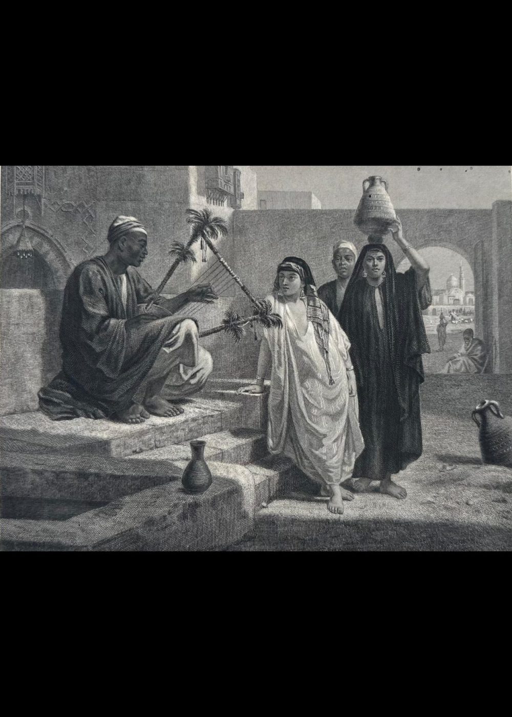 Frederick Goodall’s The Song of the Nubian Slave, masterfully engraved by William Roffe, offers a vivid Orientalist tableau infused with narrative grace and cultural richness. The scene unfolds in a sunlit courtyard or street within what appears to be an Egyptian or North African setting. A seated Nubian man plays a stringed instrument, likely singing, his posture expressive and engaged. Before him, a group of women—clad in richly textured robes and veils—listen as they pass, momentarily caught in the rhythm of his song. One woman, barefoot and with her head slightly bowed, appears particularly moved, as if the melody touches something deep within her. Another stands behind, balancing a water jar on her head, capturing the daily routines of women in the region. Architectural details, clay vessels, and a distant figure create spatial depth and a sense of community life. Goodall’s attention to costume and texture is rendered with exquisite precision by Roffe, bringing out the subtle interplay of gesture, fabric, and expression. The engraving speaks to 19th-century European fascination with the exotic and the emotional drama of everyday moments. This composition is both a cultural observation and a romanticized imagining—an evocative blend of storytelling, music, and atmosphere that allows the viewer to contemplate the intersection of art, tradition, and emotion in an unfamiliar world.