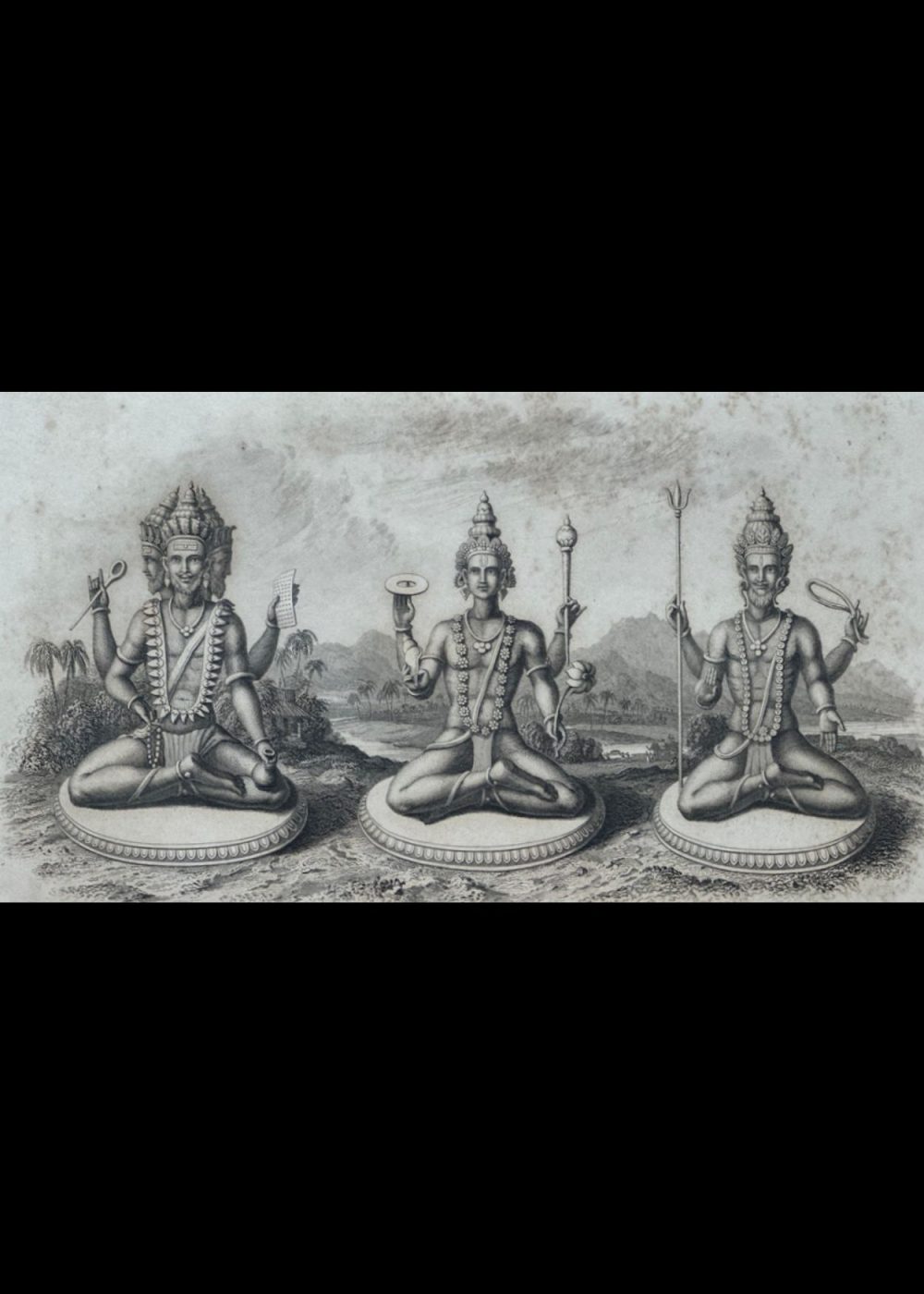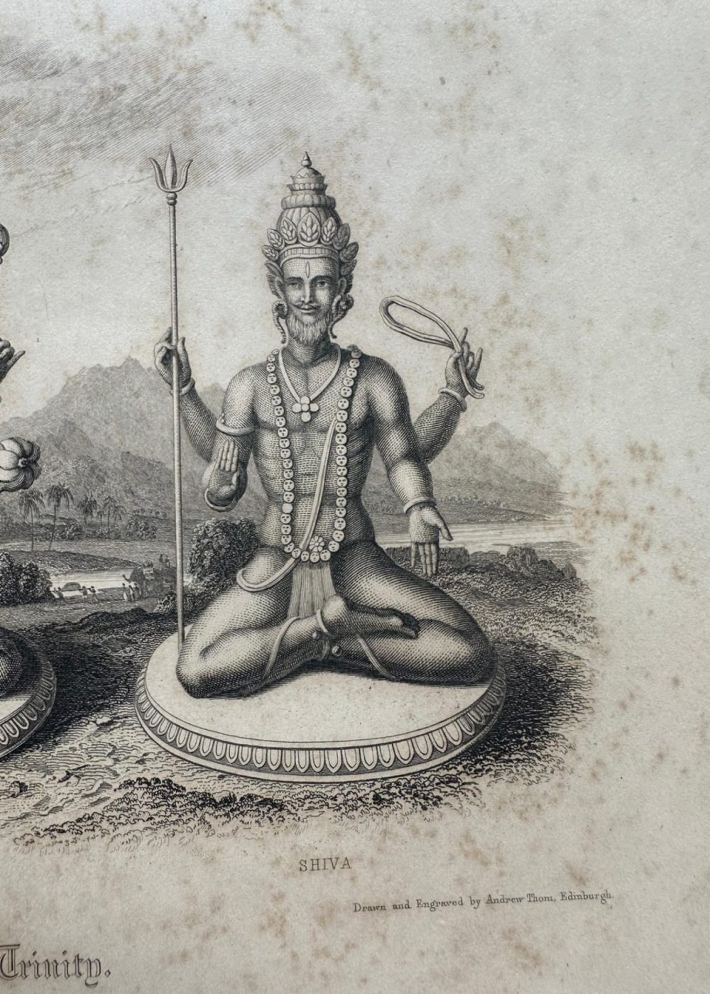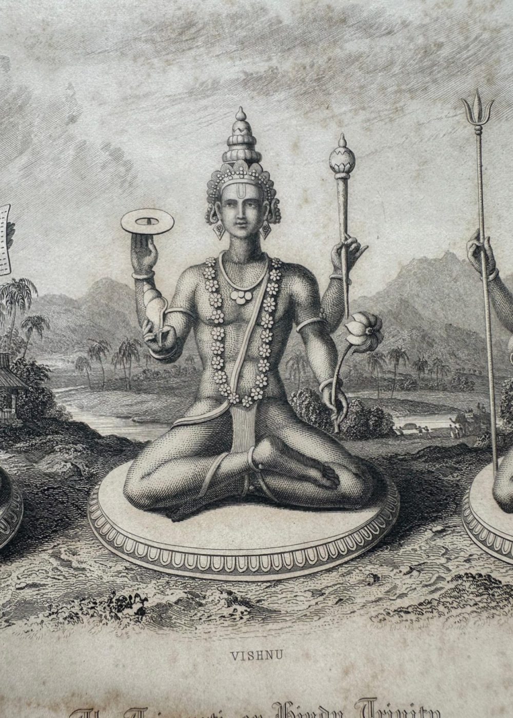“THE FAITHS IN THE WORLD”. A dictionary of all religions and their religious sects. by The Rev. James Gardner. An intricate 19th-century engraving featuring the Trimurti, or Hindu Trinity—Brahma the creator, Vishnu the preserver, and Shiva the destroyer—each seated serenely upon lotus pedestals. Symbolic attributes such as Brahma’s book and rosary, Vishnu’s conch and discus, and Shiva’s trident and drum accentuate their divine roles. Framed by a serene natural landscape, the composition embodies cosmic balance and spiritual reverence. Engraved from a drawing in the Jameson Manuscript, held by the Royal Asiatic Society, and published by Fisher, Son & Co., London & Edinburgh.