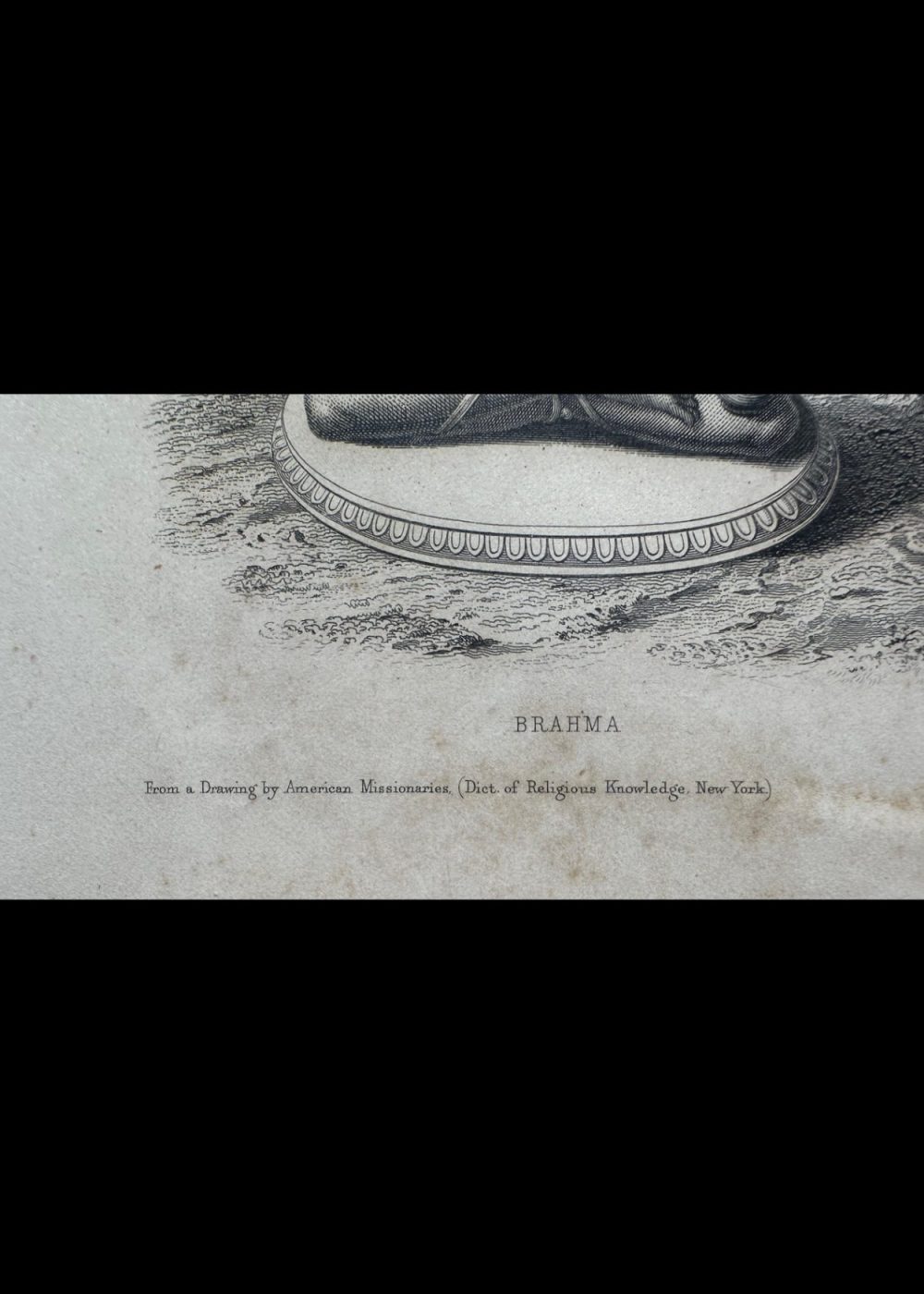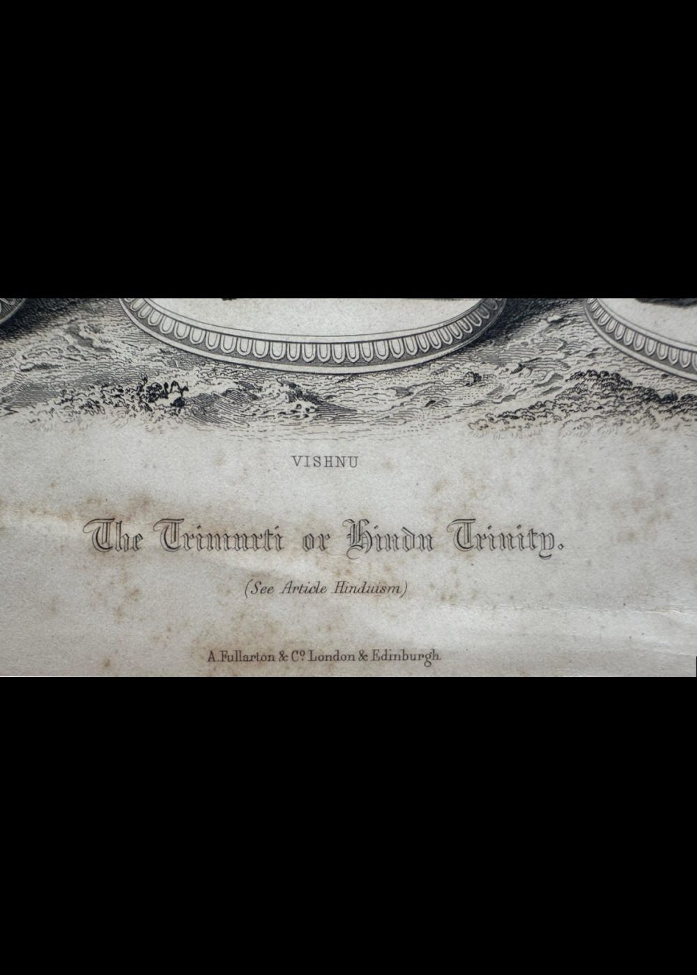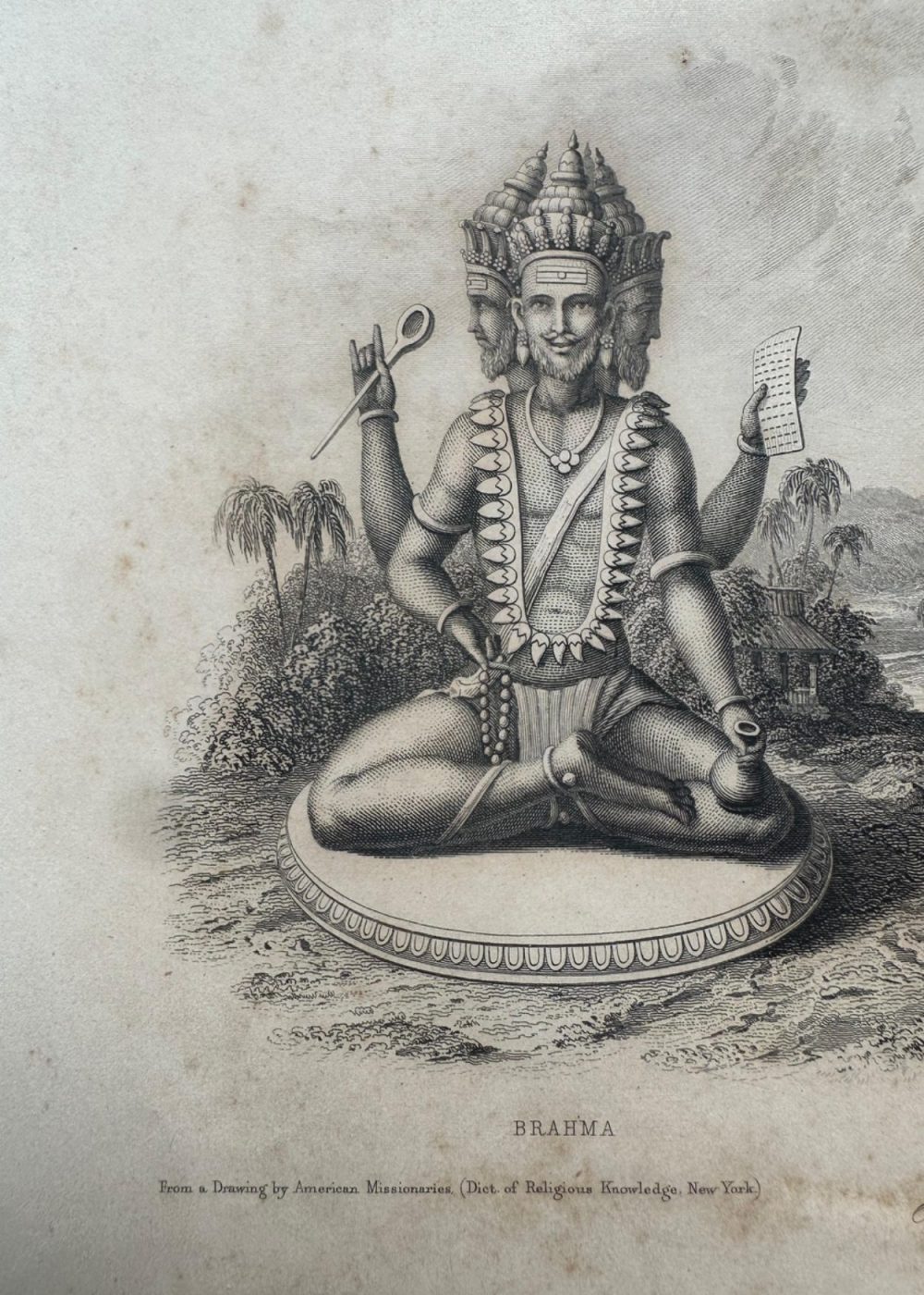 “THE FAITHS IN THE WORLD”. A dictionary of all religions and their religious sects. by The Rev. James Gardner. An intricate 19th-century engraving featuring the Trimurti, or Hindu Trinity—Brahma the creator, Vishnu the preserver, and Shiva the destroyer—each seated serenely upon lotus pedestals. Symbolic attributes such as Brahma’s book and rosary, Vishnu’s conch and discus, and Shiva’s trident and drum accentuate their divine roles. Framed by a serene natural landscape, the composition embodies cosmic balance and spiritual reverence. Engraved from a drawing in the Jameson Manuscript, held by the Royal Asiatic Society, and published by Fisher, Son & Co., London & Edinburgh.