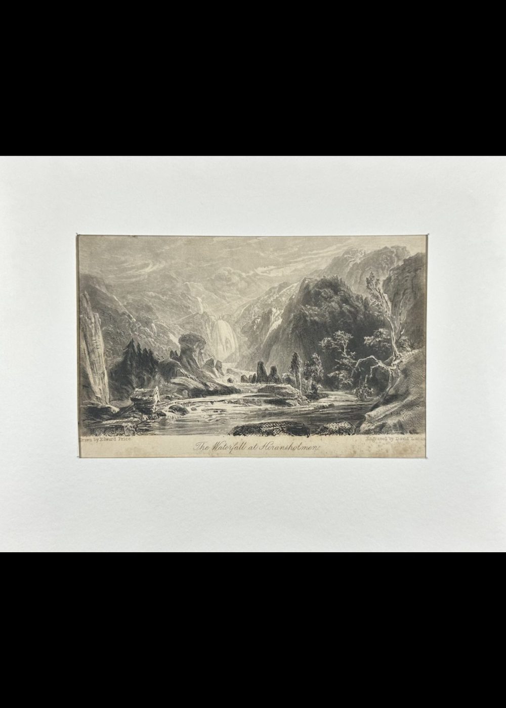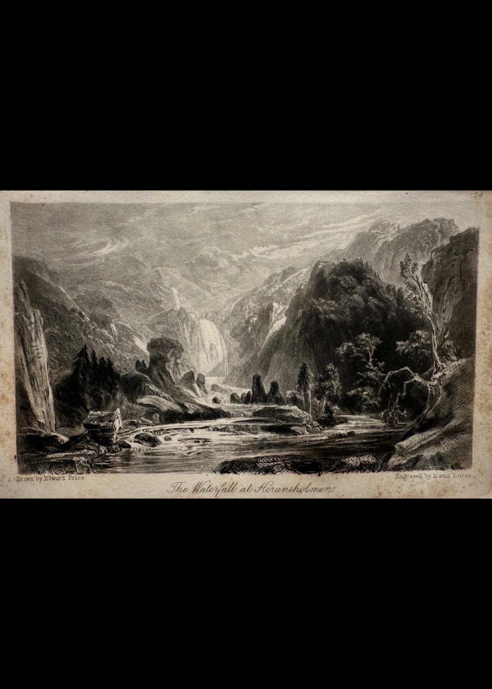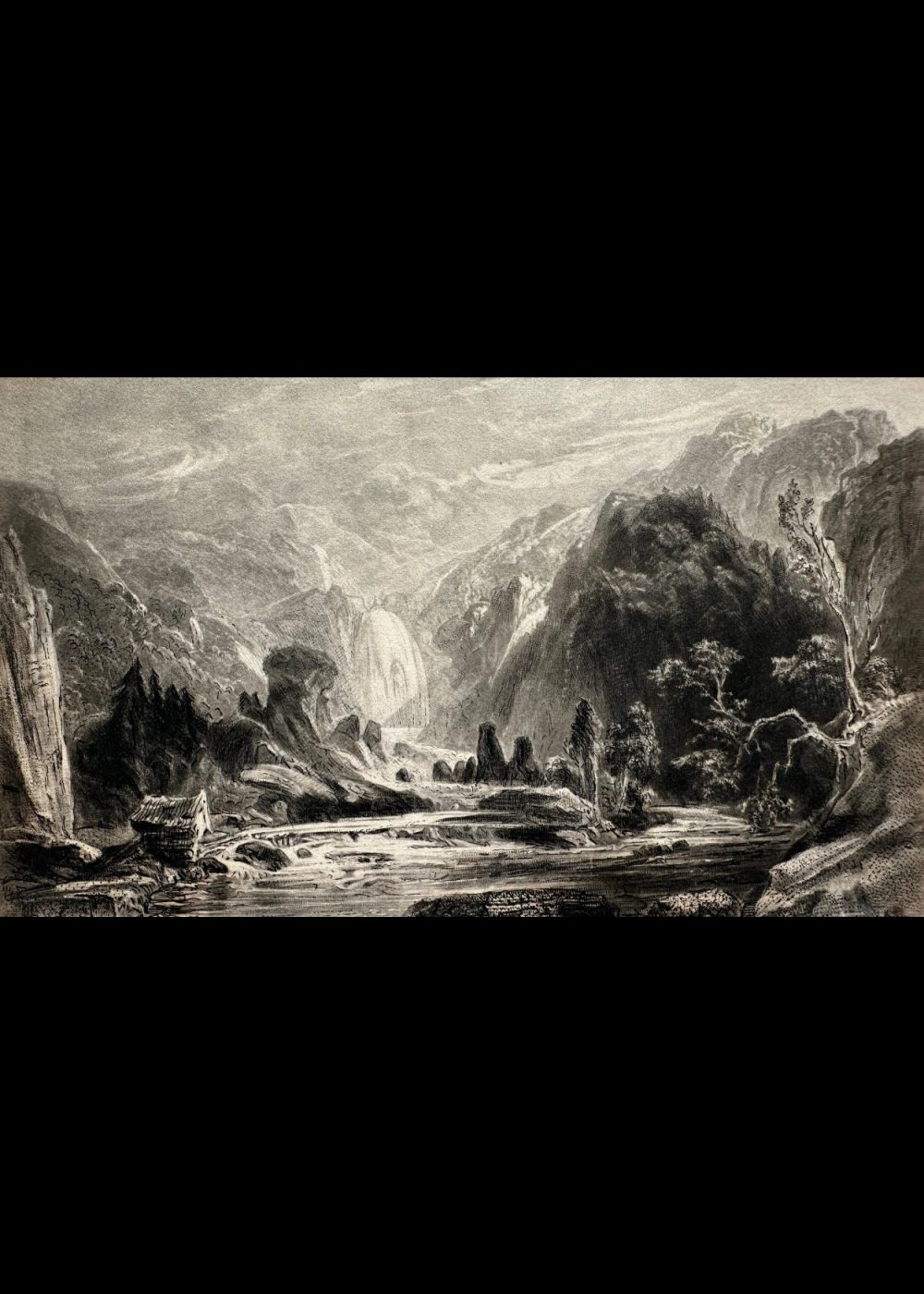 This engraving presents a dramatic waterfall plunging from rocky cliffs into a river valley, framed by towering mountains and scattered trees. A small cabin rests near the riverbank, adding a touch of human presence to the wild terrain. The composition captures the serene yet powerful essence of nature, typical of Romantic landscape art, with fine detailing that evokes both majesty and tranquility.