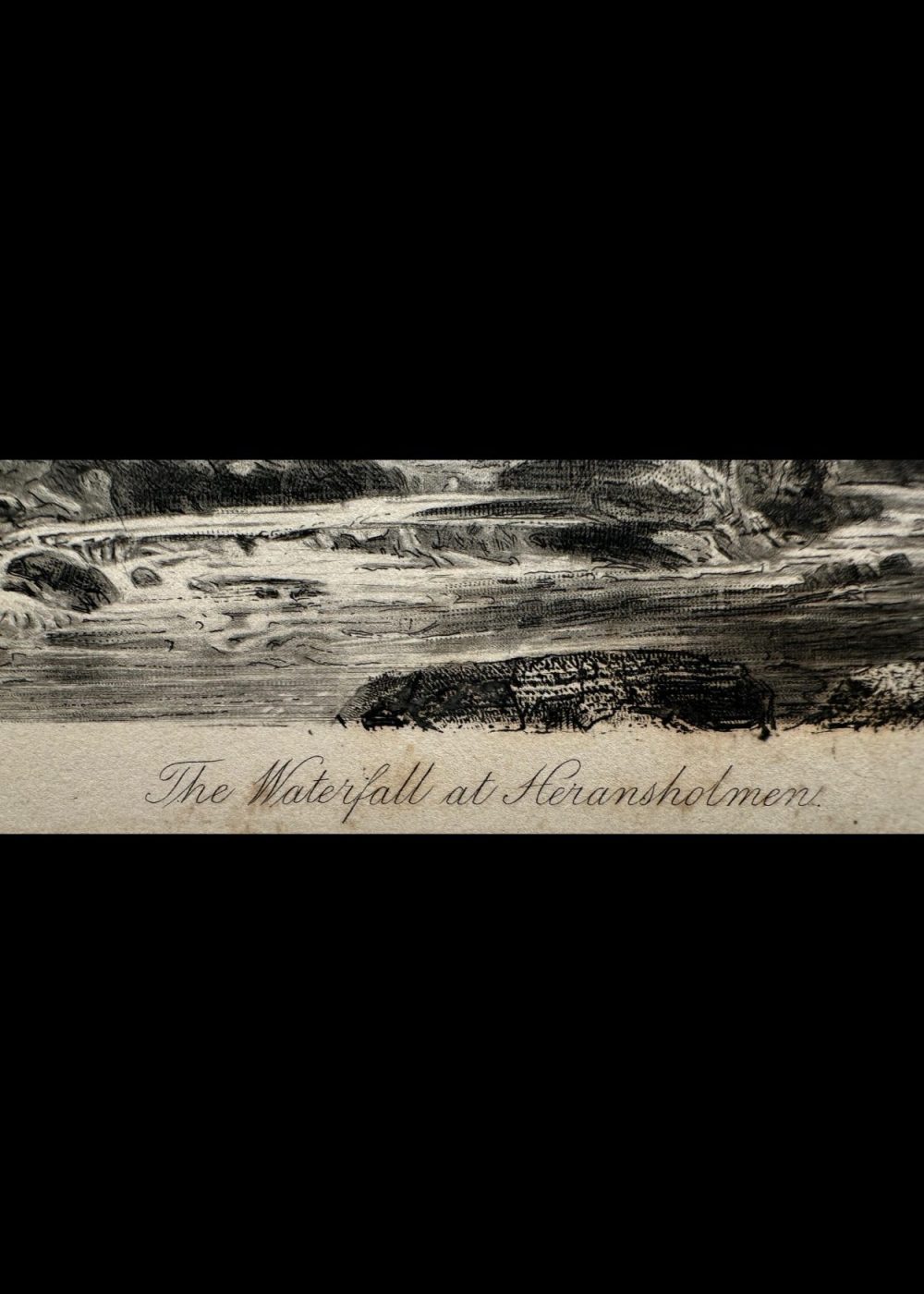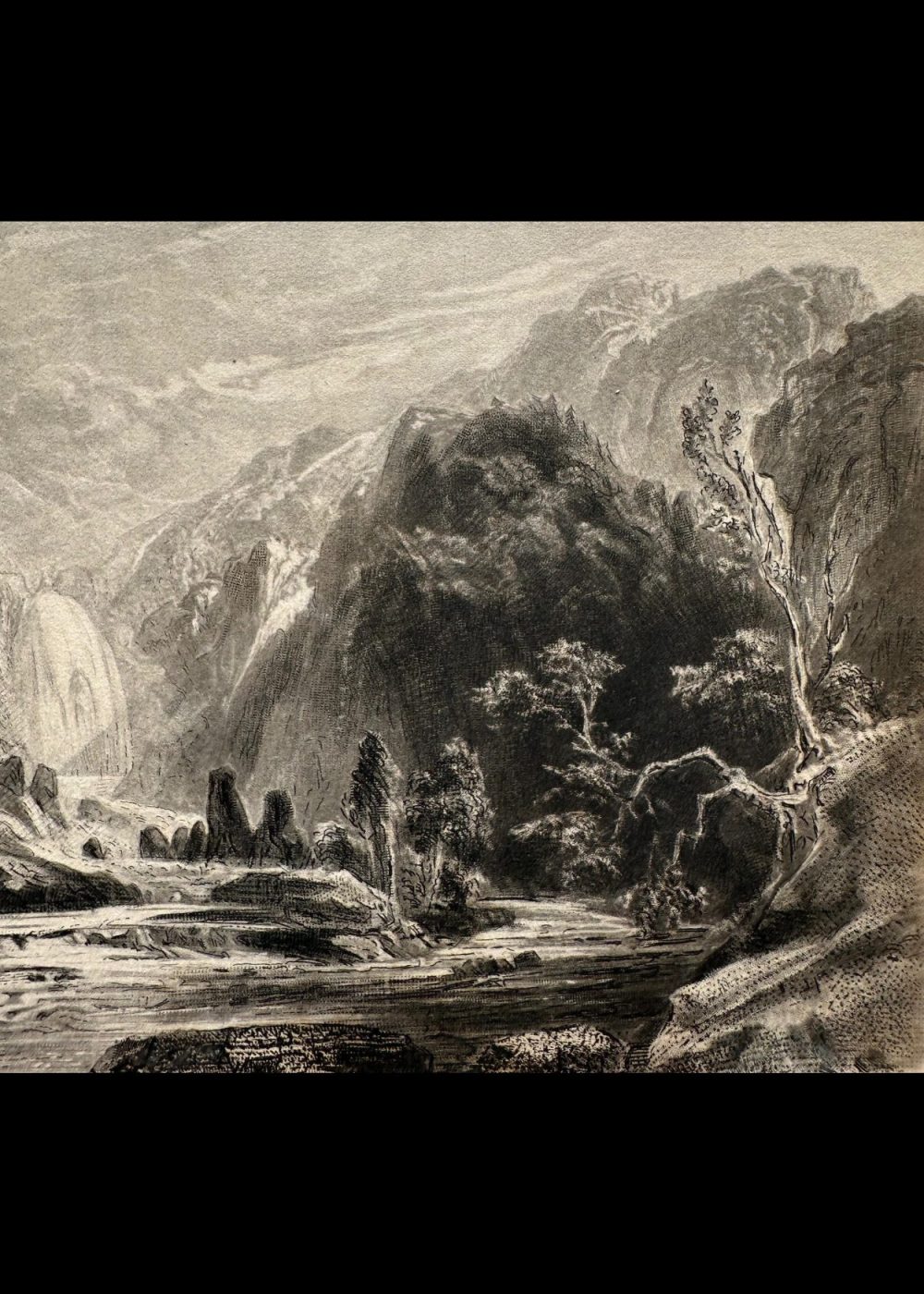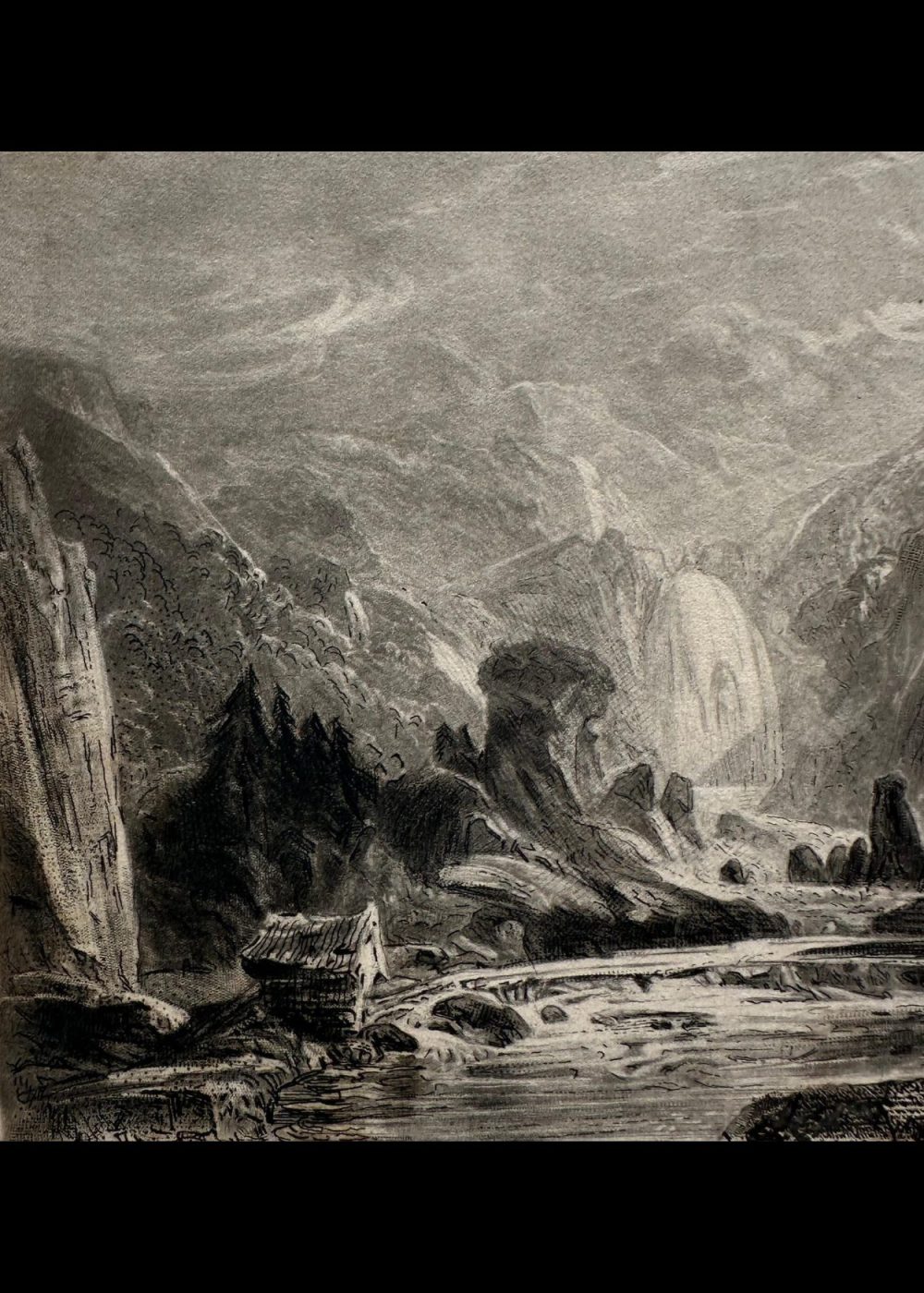 This engraving presents a dramatic waterfall plunging from rocky cliffs into a river valley, framed by towering mountains and scattered trees. A small cabin rests near the riverbank, adding a touch of human presence to the wild terrain. The composition captures the serene yet powerful essence of nature, typical of Romantic landscape art, with fine detailing that evokes both majesty and tranquility.