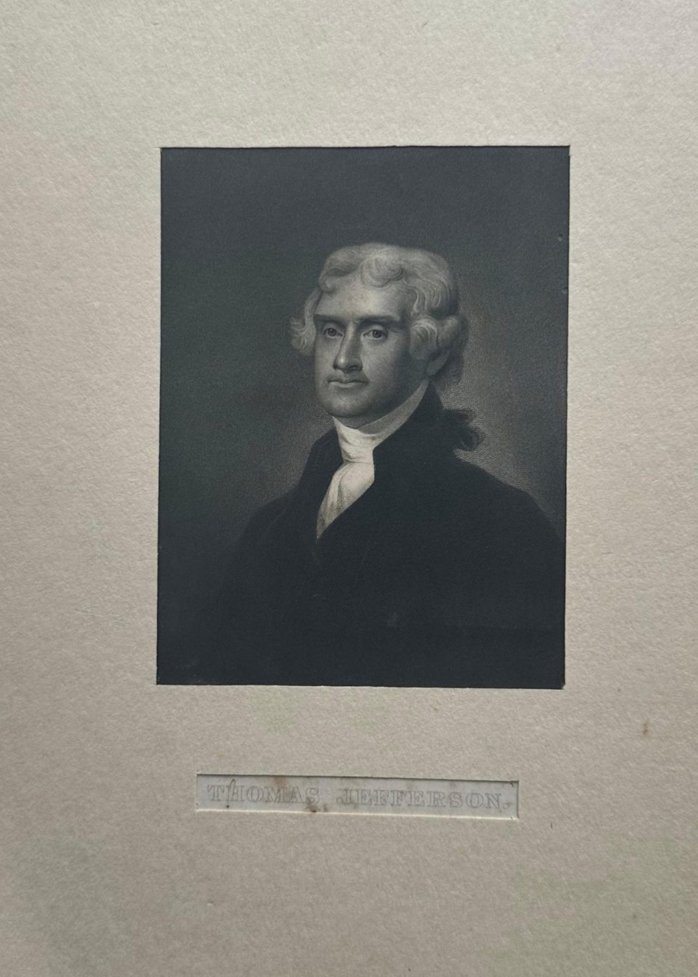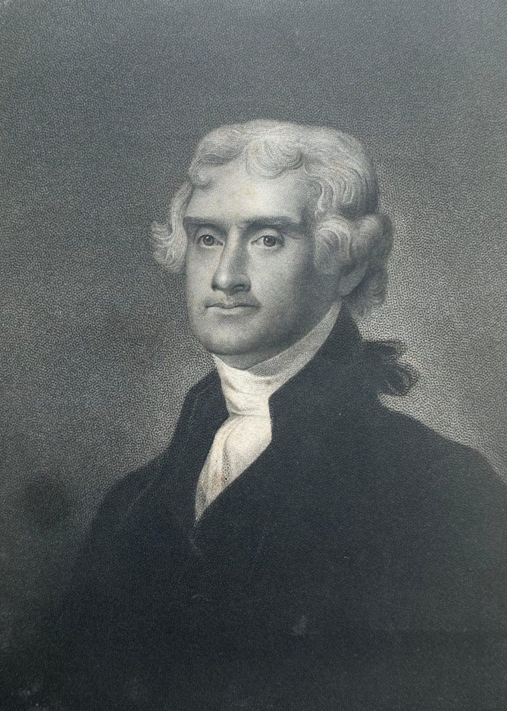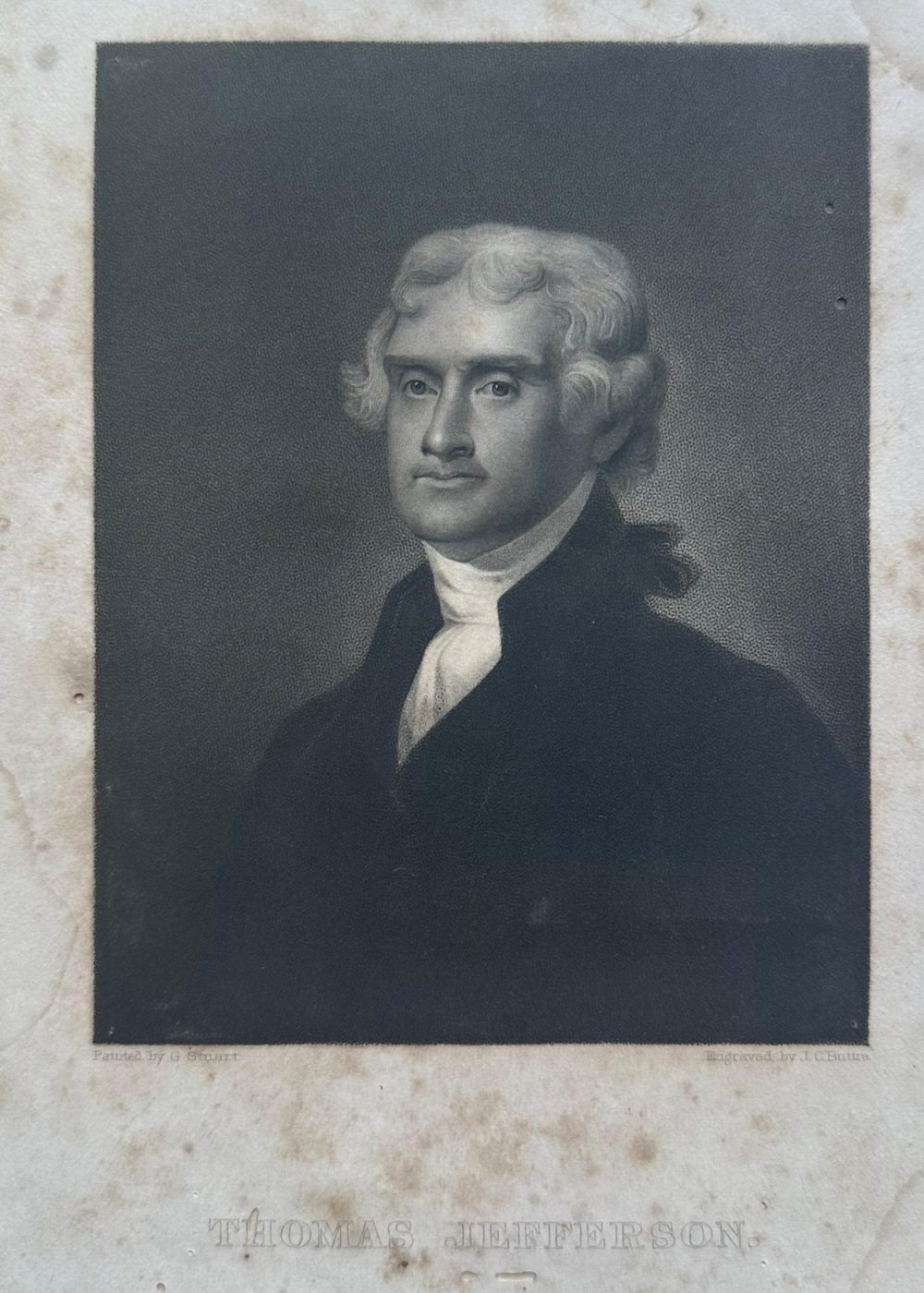 (APRIL 13, 1743- JULY 4, 1826) was an American statesman, Planter, Diplomat, Lawyer, Architect, Philosopher, and Founding Father who served as the third President of the United States from 1801 to 1809. Published 1810. This distinguished portrait captures Thomas Jefferson, third President of the United States and principal author of the Declaration of Independence, in a poised half-length composition. Engraved by J. Chittim after a painting by Gilbert Stuart, Jefferson is shown wearing formal attire, including a dark coat and a crisply tied white cravat. The image emphasizes his dignified bearing and intellectual gravitas, rendered with delicate linework and tonal balance. The inscription “THOMAS JEFFERSON” anchors the composition below, affirming the subject’s iconic status in American history.