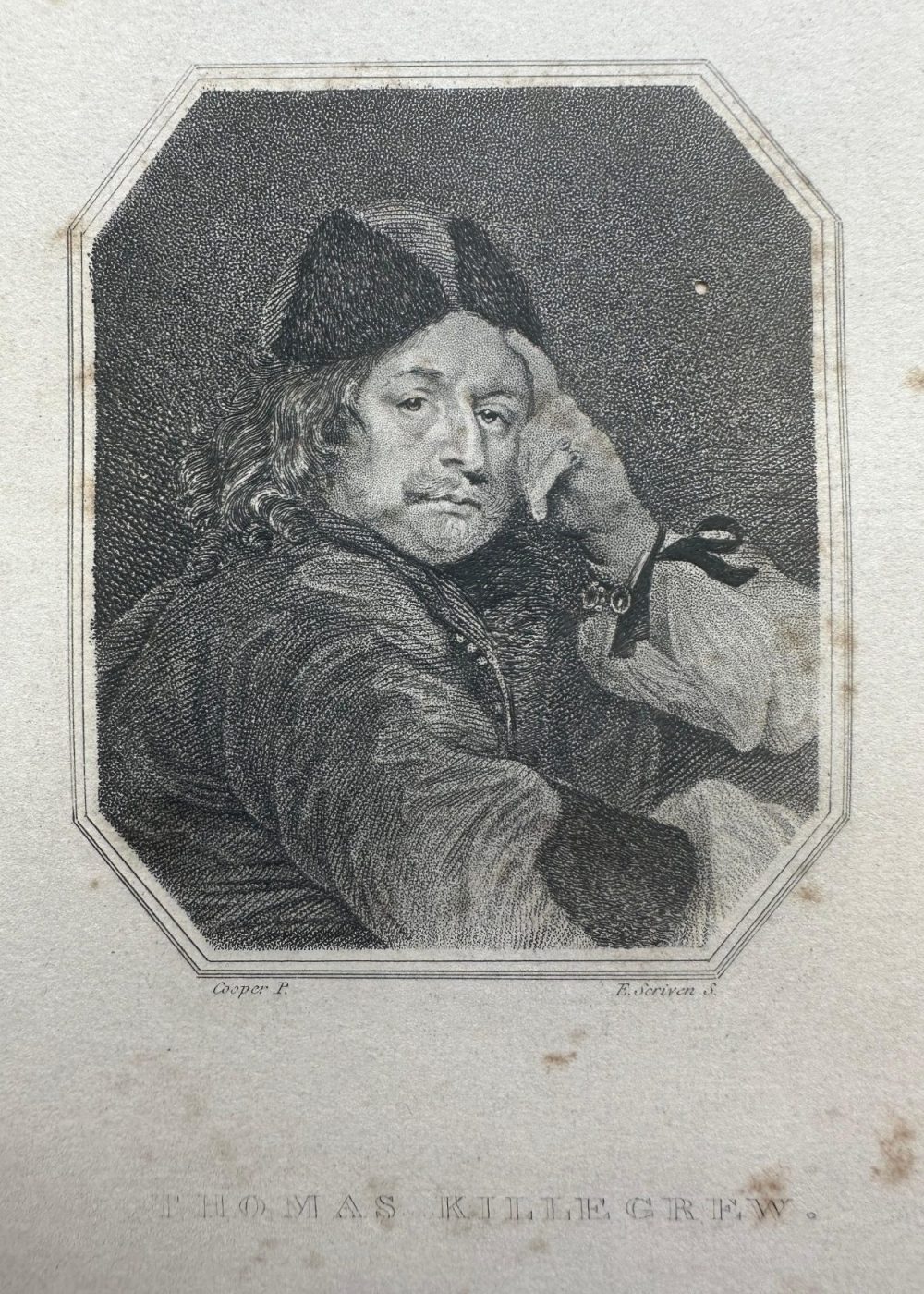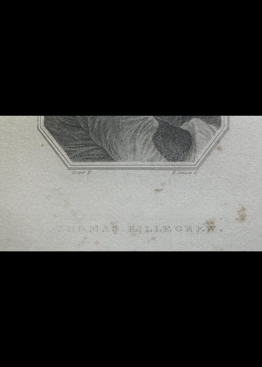 (7TH FEB 1612 – 19TH MARCH 1683) Was a English dramatist and theatre manager. He was a witty, dissolute figure at the court of King Charles II of England. Published 1810. This evocative portrait features Thomas Killigrew, a noted 17th-century dramatist and theatre manager, closely associated with the English Restoration stage. Depicted in a contemplative pose, Killigrew wears voluminous robes and a soft cap, his gaze directed outward with theatrical flair. The engraving’s fine hatchwork captures the rich folds of fabric and the sitter’s expressive features, reflecting Scriven’s deft translation of Cooper’s painted original. Inscribed below with “THOMAS KILLIGREW,” and credited to “Cooper P.” and “E. Scriven S.,” the print embodies 19th-century fascination with cultural patrons and literary figures of the Stuart court.