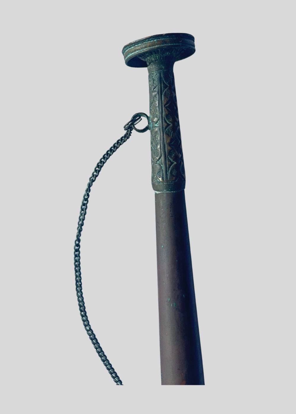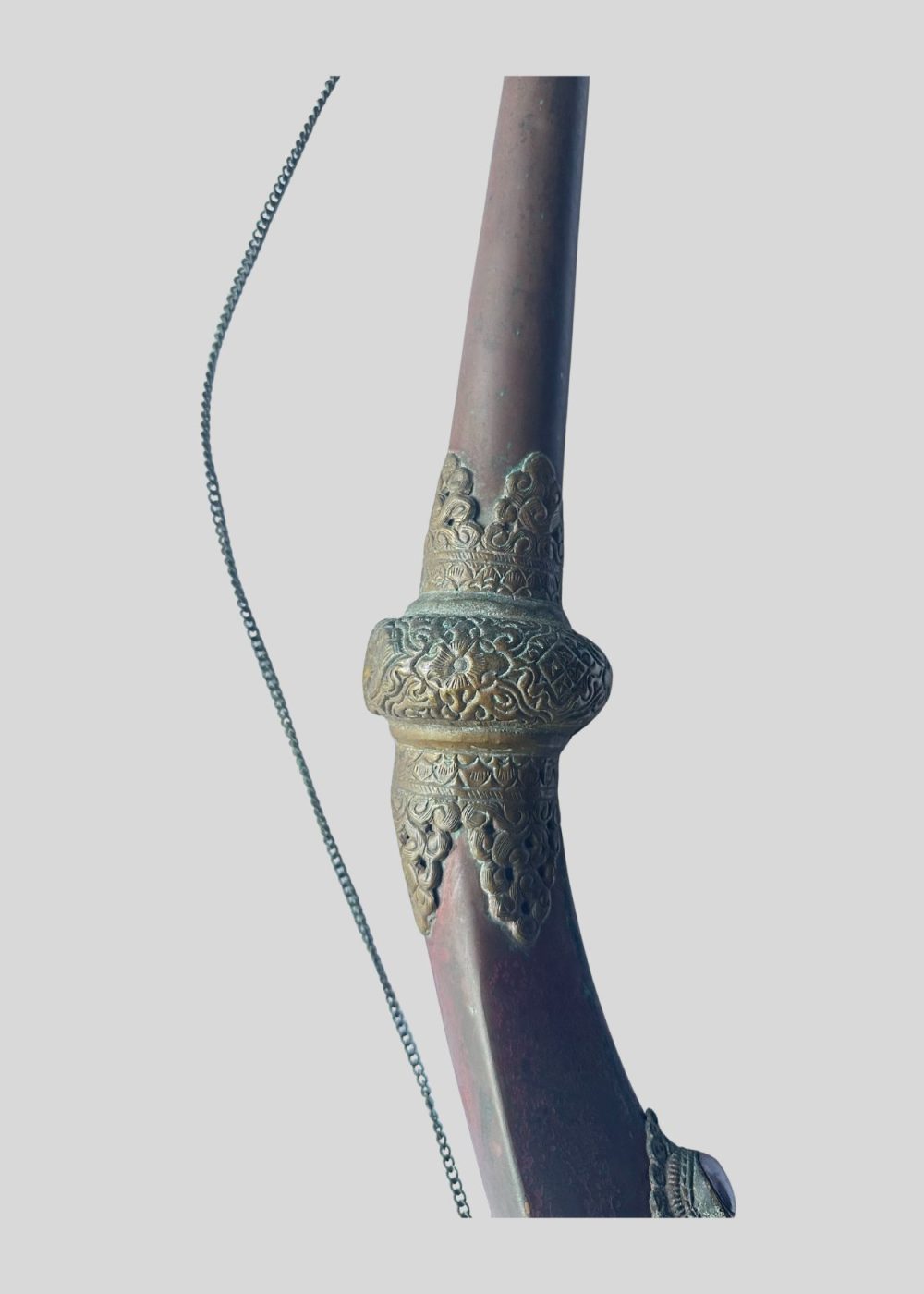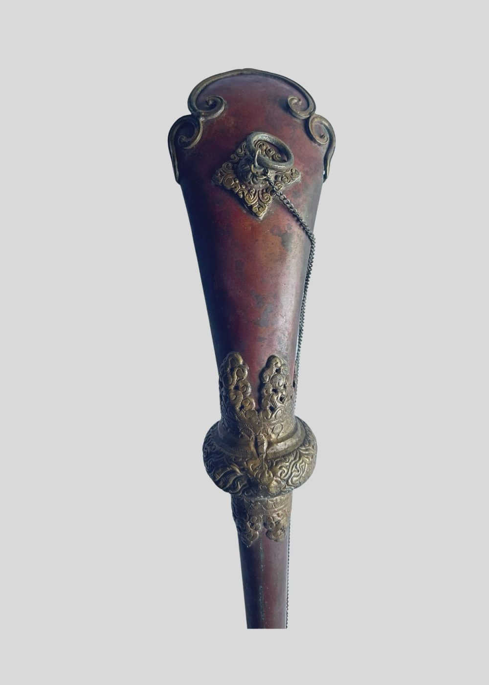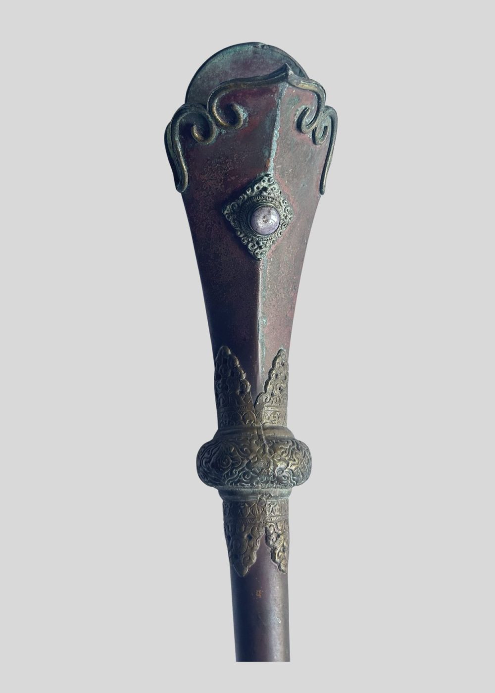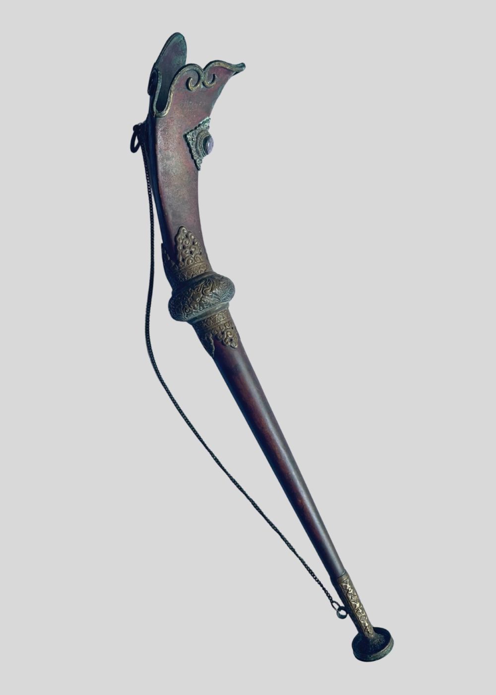 This ceremonial trumpet from the Tibet-Nepal region is crafted from copper with finely detailed brass fittings and set with a decorative gemstone. Often used in monastic rituals, its elegant form and ornamental elements reflect the region’s deep spiritual traditions and refined craftsmanship.