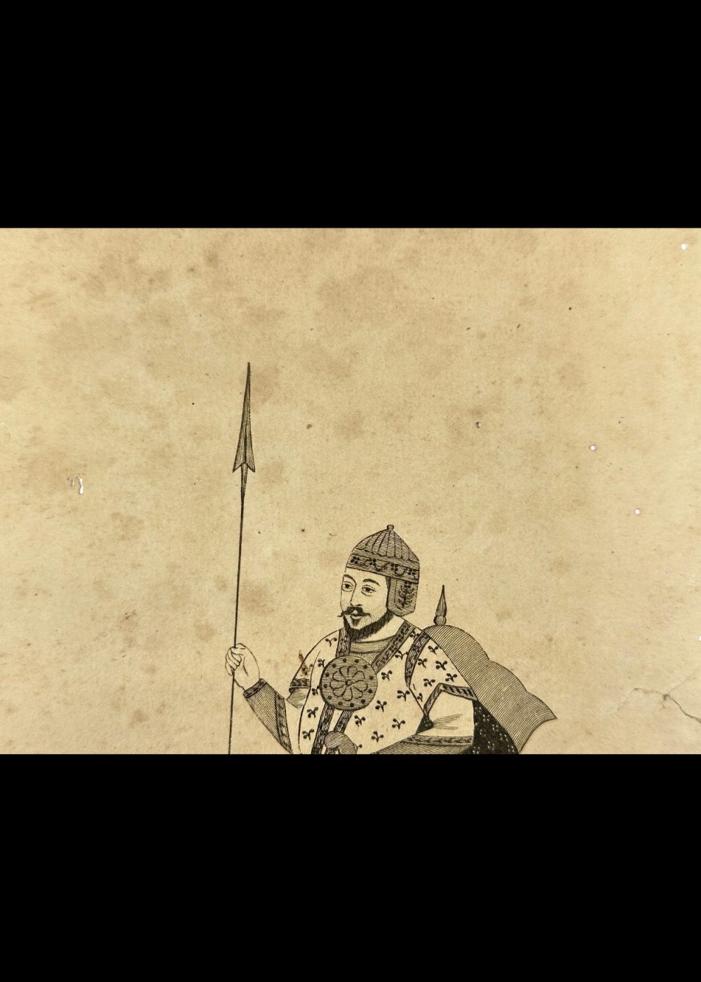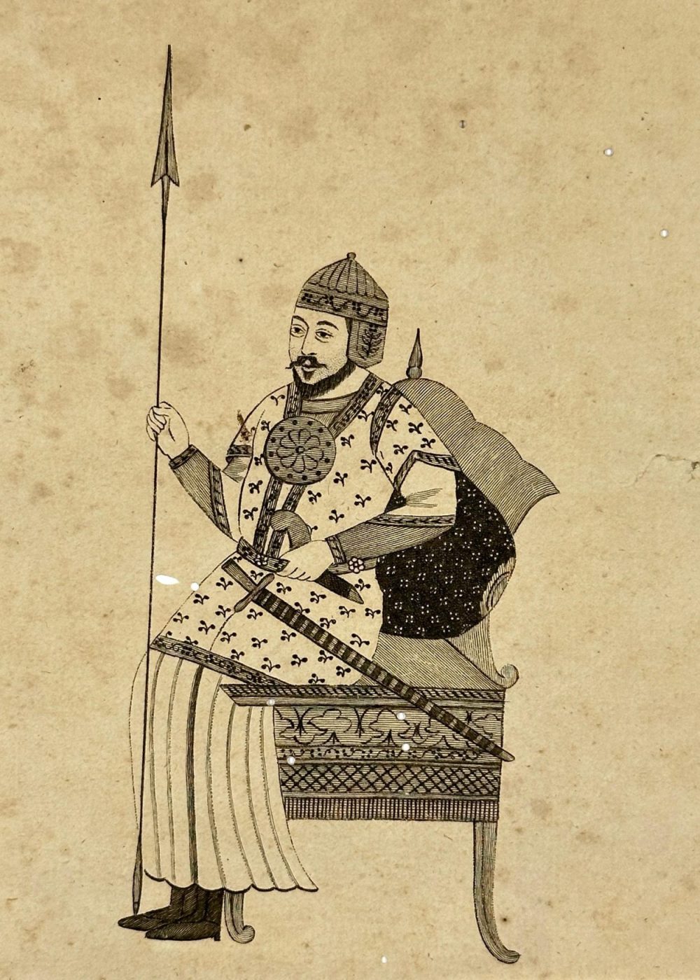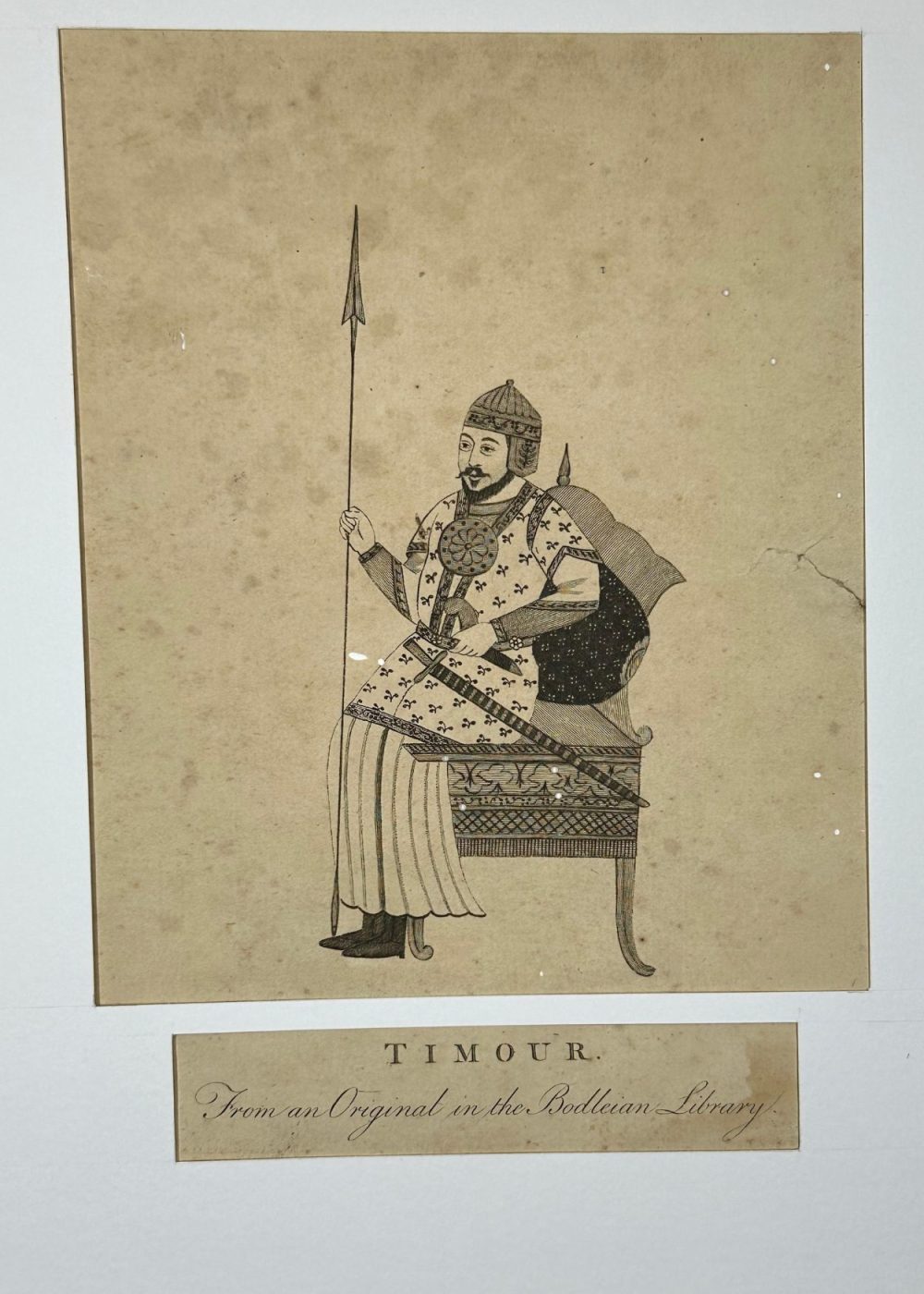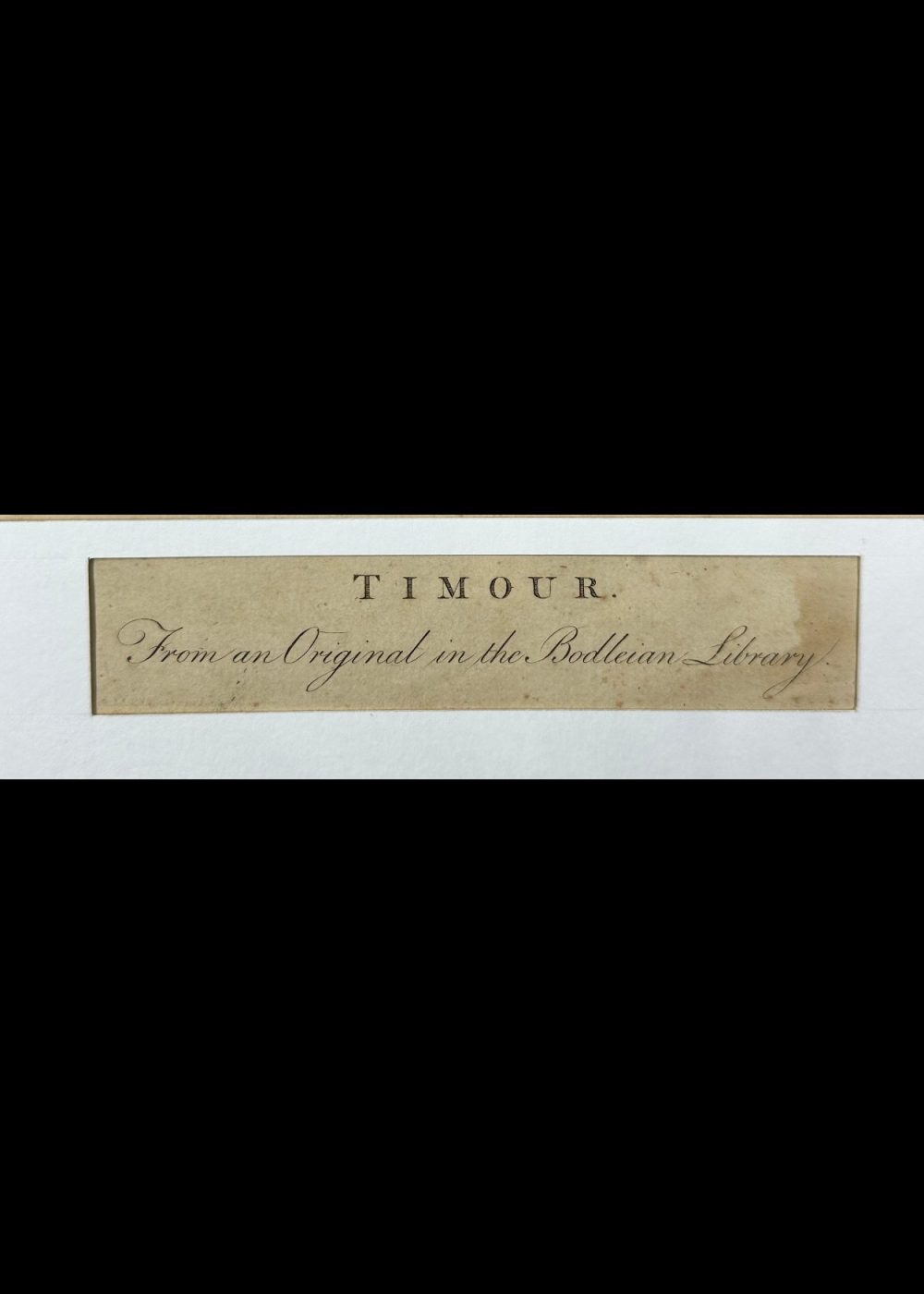 This historical illustration depicts Timour (also known as Tamerlane), the 14th-century Turco-Mongol conqueror and founder of the Timurid Empire. Seated on an ornate throne, he is shown holding a spear, wearing a decorated robe and helmet, symbolizing his authority and martial power. The artwork is noted as being derived “From an Original in the Bodleian Library.”