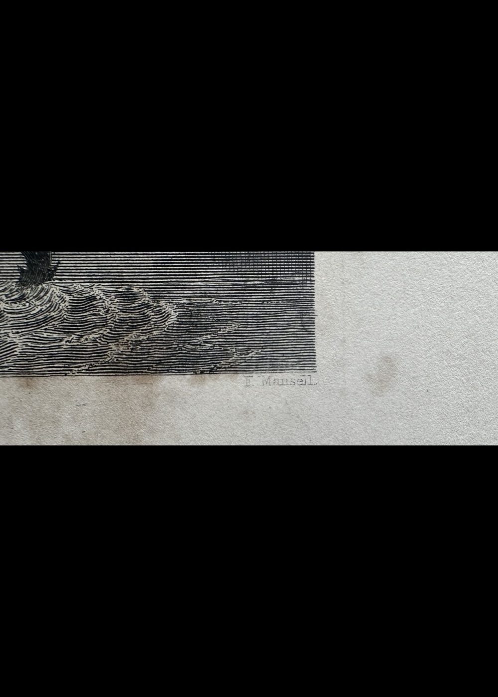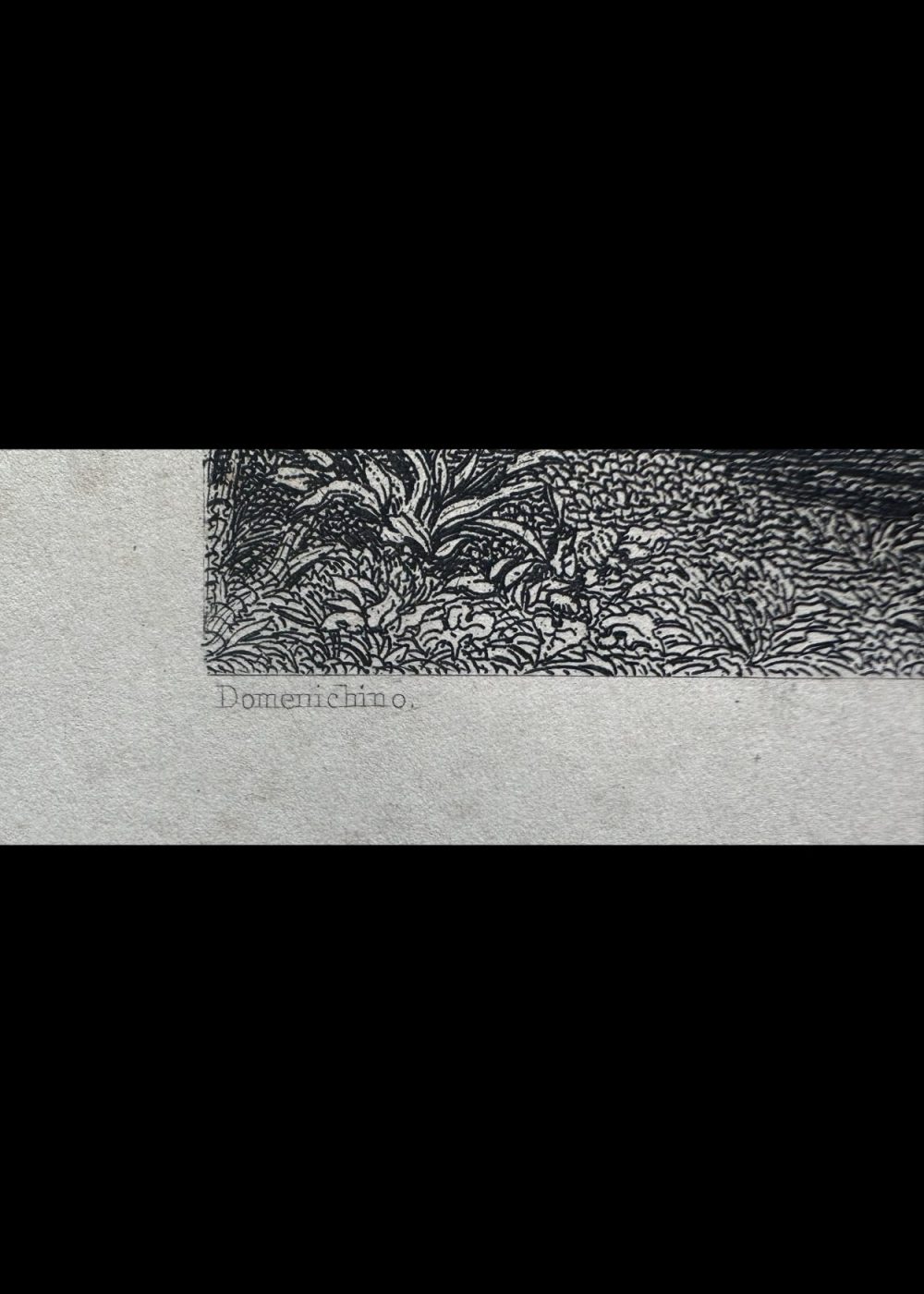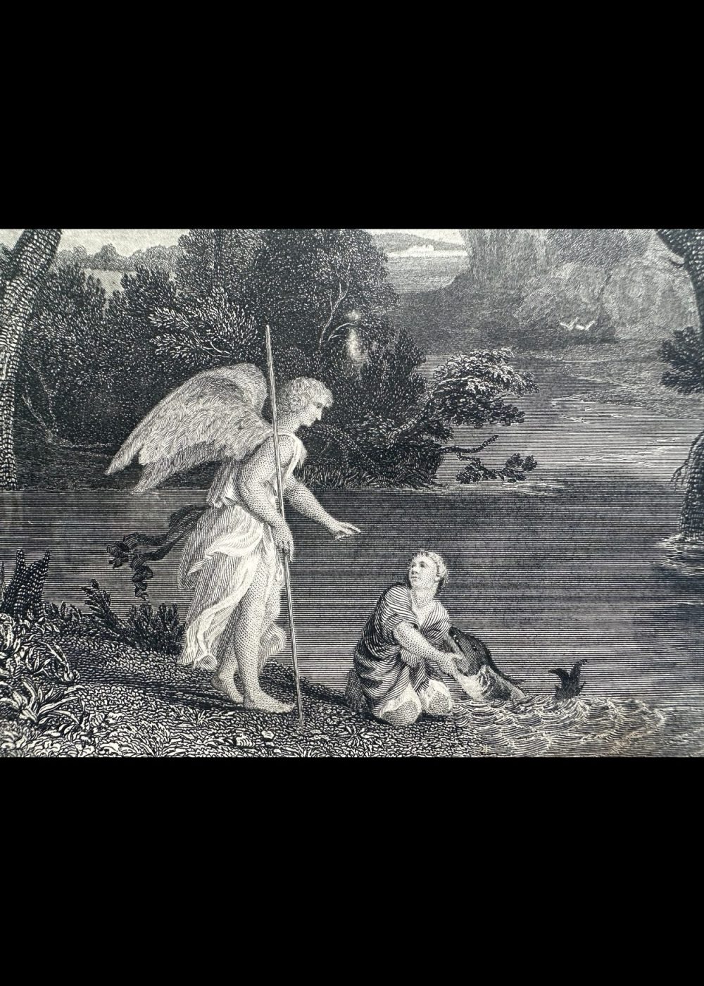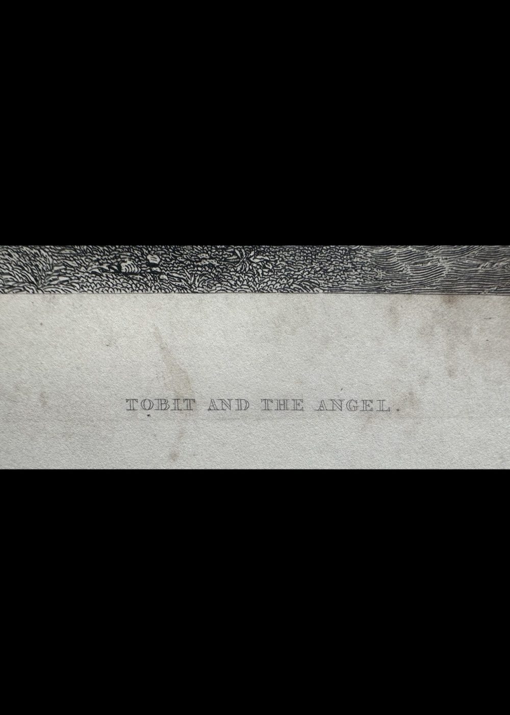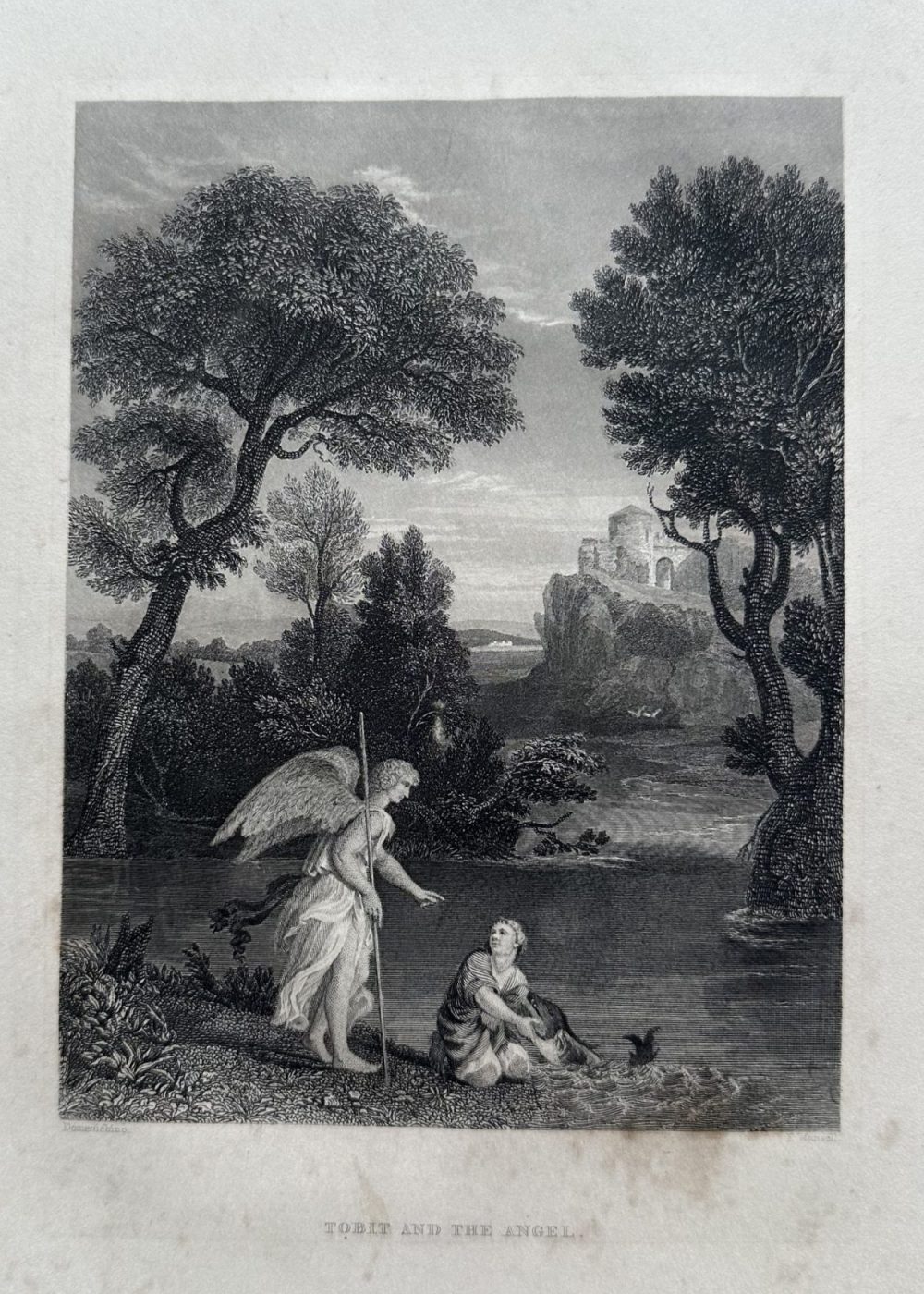 This fine engraving titled “Tobit and the Angel” illustrates a serene biblical scene set in a lush riverside landscape. The angel, depicted with wings and a staff, gestures toward young Tobit (or Tobias), who kneels at the water’s edge holding a large fish. The background features tall trees and distant architectural ruins atop a rocky hill. This imagery refers to the apocryphal Book of Tobit, where the angel Raphael guides Tobias and instructs him to catch a fish whose organs will be used for healing. The engraving is marked “Domenichino”, indicating it is after a work by the Italian Baroque artist Domenichino.