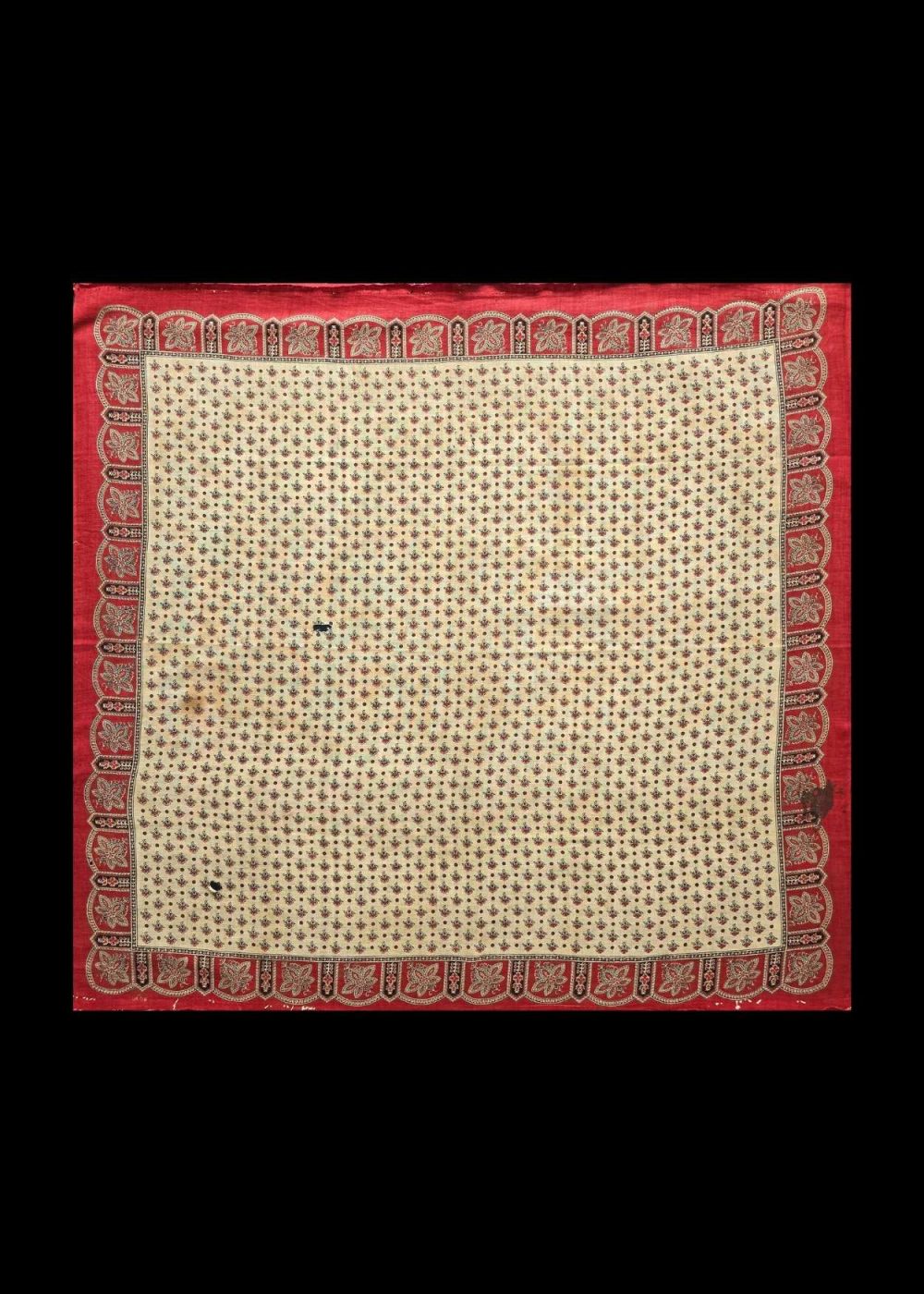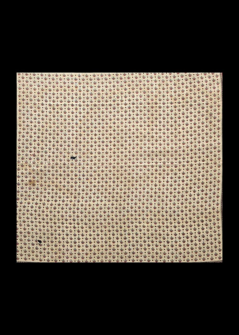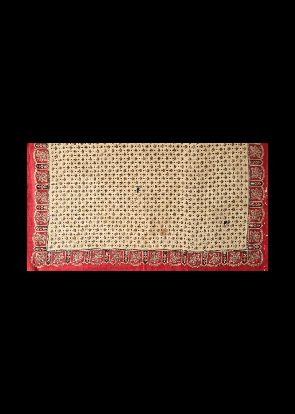 This roller-printed chakla from Manchester, designed for the Indian market during the late 19th to early 20th century, features a delicate pattern of small floral motifs scattered across a light cream or beige background. The chakla is bordered with a rich red paisley design, adding contrast and vibrancy. The fine detailing of the border, with its intricate floral elements, highlights the combination of Western printing techniques and Indian preferences for decorative, ornate textiles. Popular in colonial India, these textiles showcase the fusion of British industrial manufacturing and local cultural aesthetics, catering to a growing demand for elegant, high-quality fabrics in the region.
