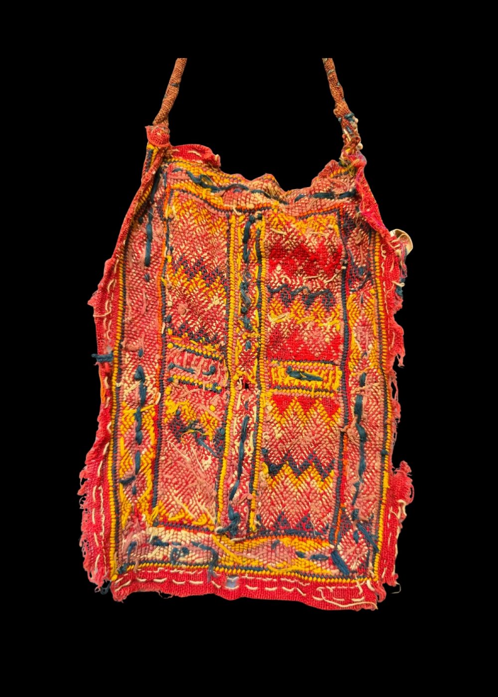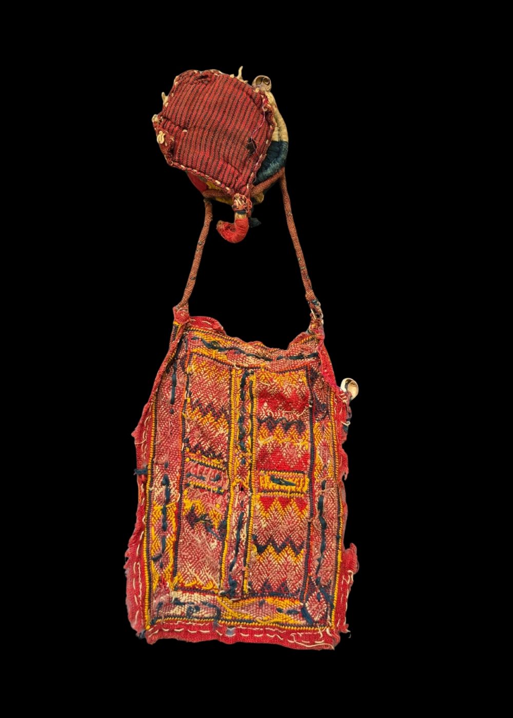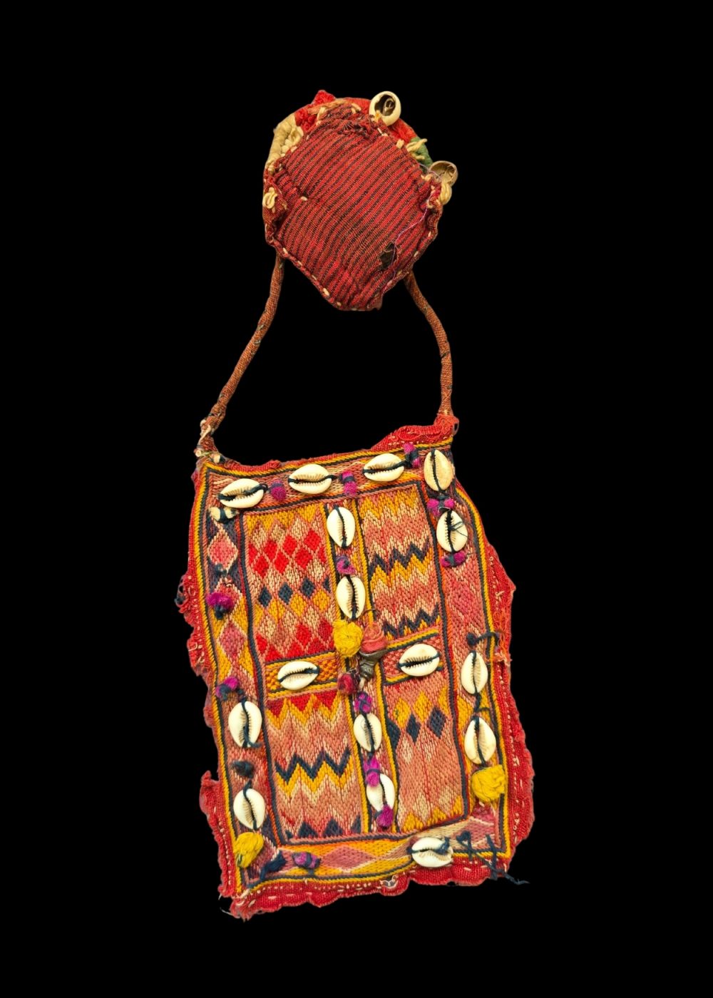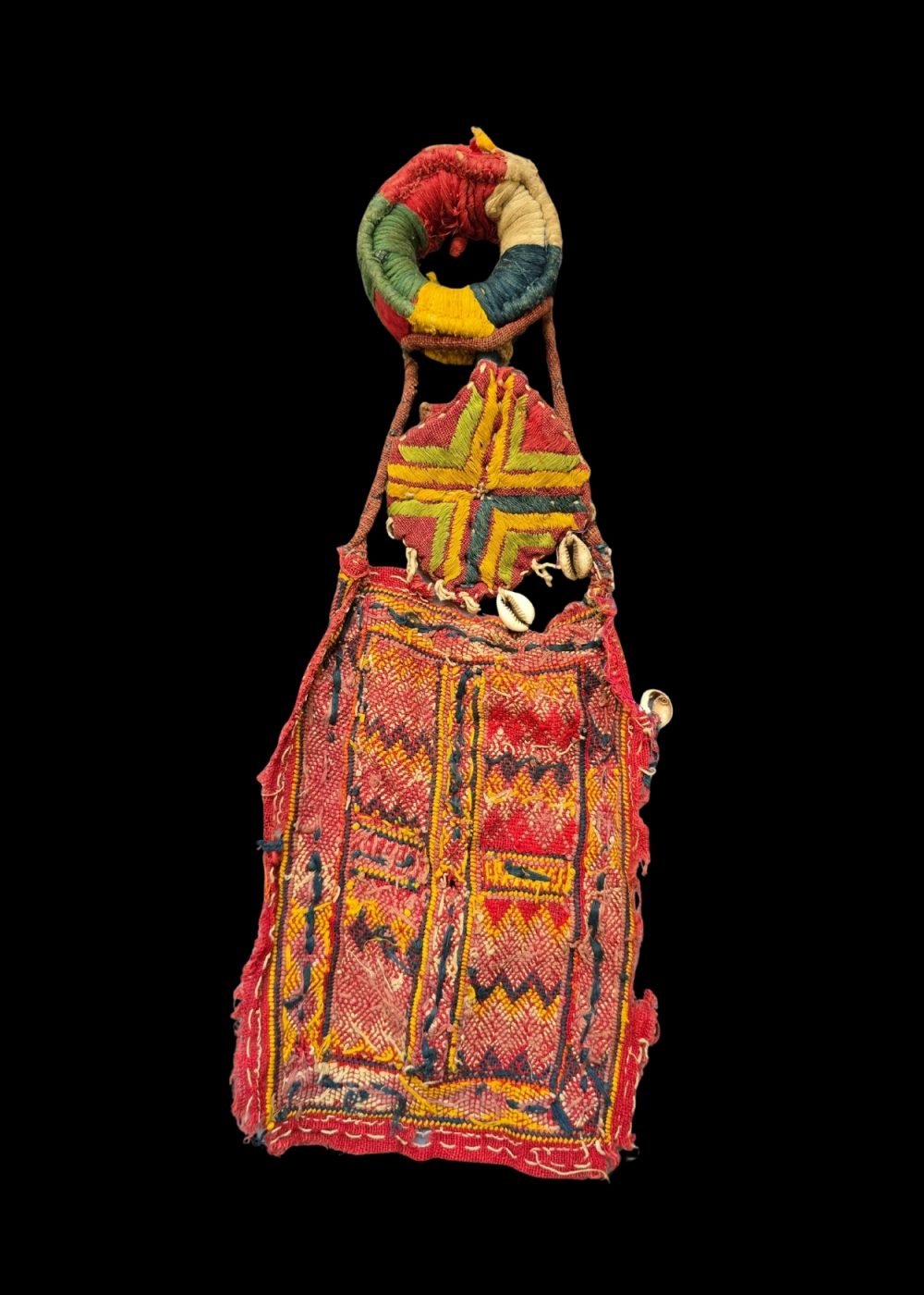 This is a vibrant Banjara headset (Hindoni) with a pendant pouch, handcrafted by the Banjara community in India. The piece features intricate embroidery with bold geometric patterns in rich colors like red, yellow, purple, and green. The design is embellished with cowrie shells and colorful tassels, adding both visual appeal and cultural significance. The twisted circular handle is made from multicolored threads, which further enhance its aesthetic. This traditional accessory, often used for carrying small items, represents the Banjara people’s skill in creating functional yet beautiful adornments that reflect their cultural heritag