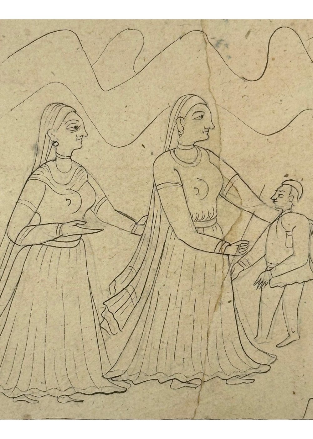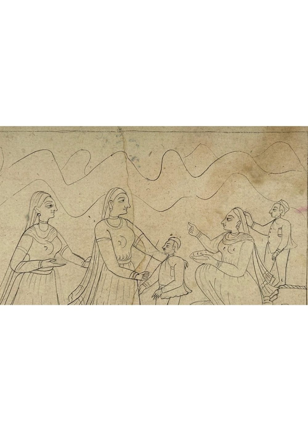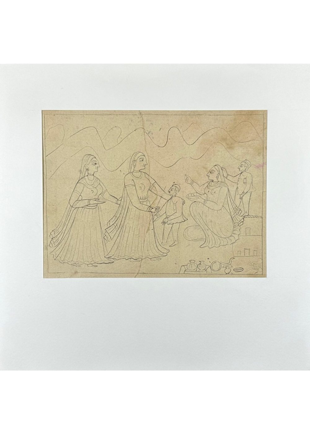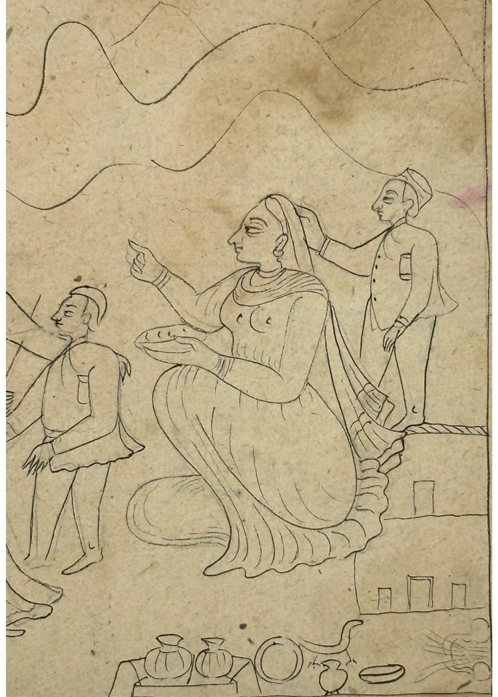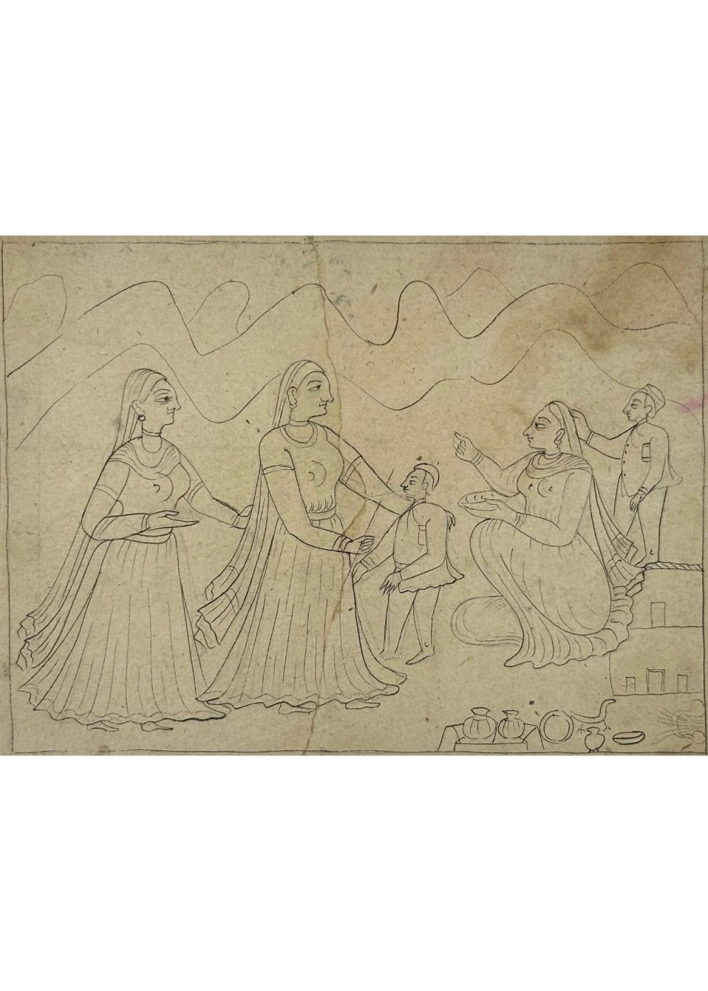 This uncoloured miniature painting portrays a traditional Indian domestic scene, rendered with fine line work. The composition centers around a family moment where women, dressed in flowing attire, engage with a child—possibly a rite or a festive ritual. One woman is seated with a plate, gesturing, while a man adjusts her hair affectionately. The background features stylized mountain contours, and household items like vessels and pots are shown in the foreground, suggesting hospitality or preparation. The artwork reflects themes of familial warmth, everyday rituals, and cultural values in miniature painting style.