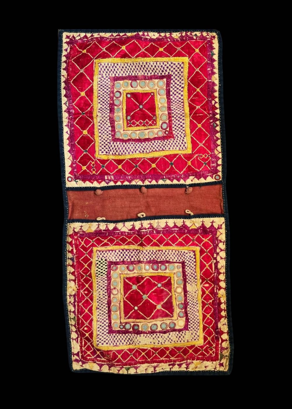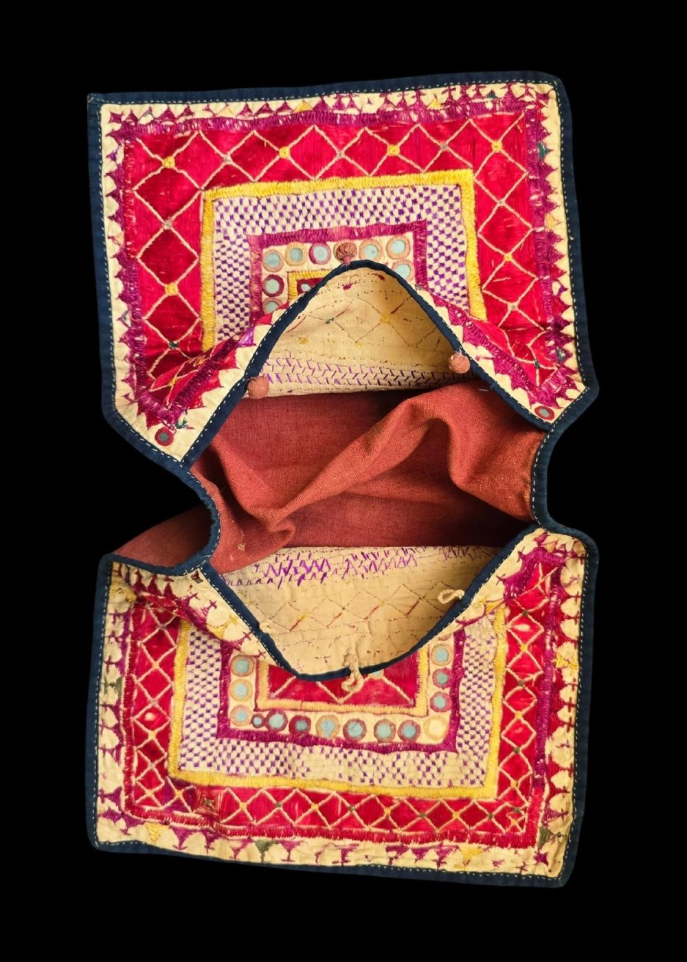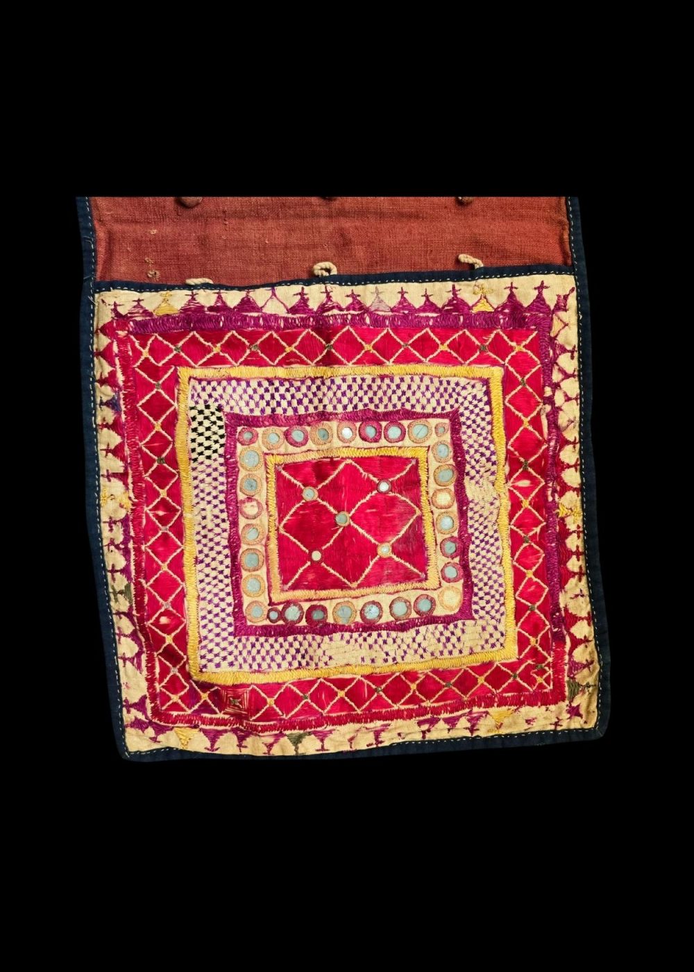 This traditional handcrafted embroidered shoulder bag from Gujarat showcases intricate and vibrant embroidery, characteristic of the region’s rich craft heritage. The design features bold geometric patterns within concentric squares, embellished with mirrors and colorful threads. The vivid red and yellow hues, along with the detailing in the stitching, reflect the artistic traditions of Gujarat. Such bags are often used in traditional attire and are made with great skill, blending aesthetic beauty with functionality. The addition of mirrors and fine embellishments further enhances the cultural significance, often symbolizing good luck and protection.
