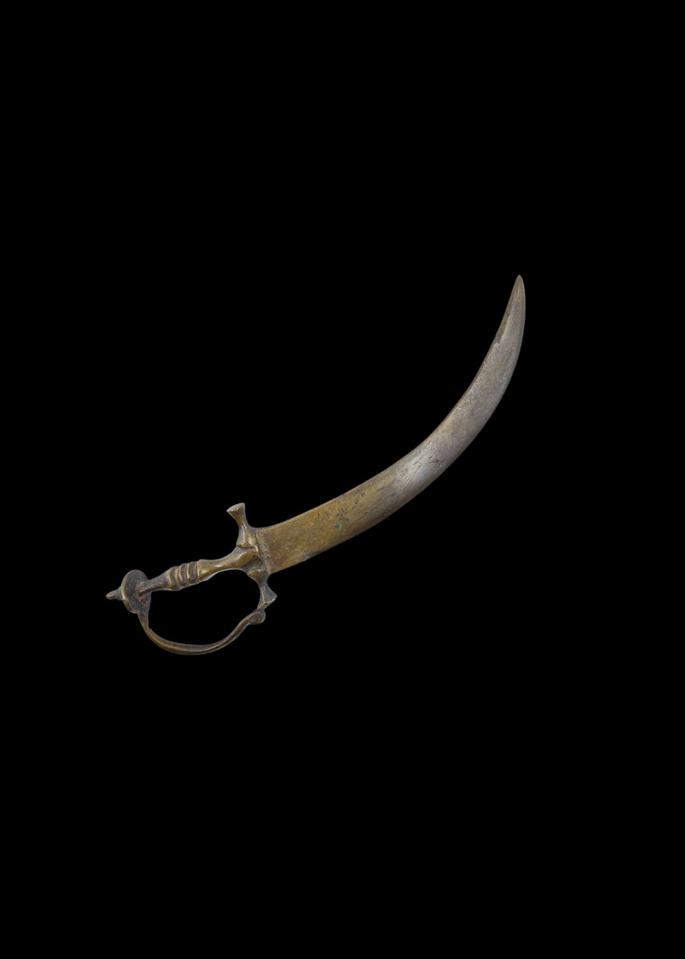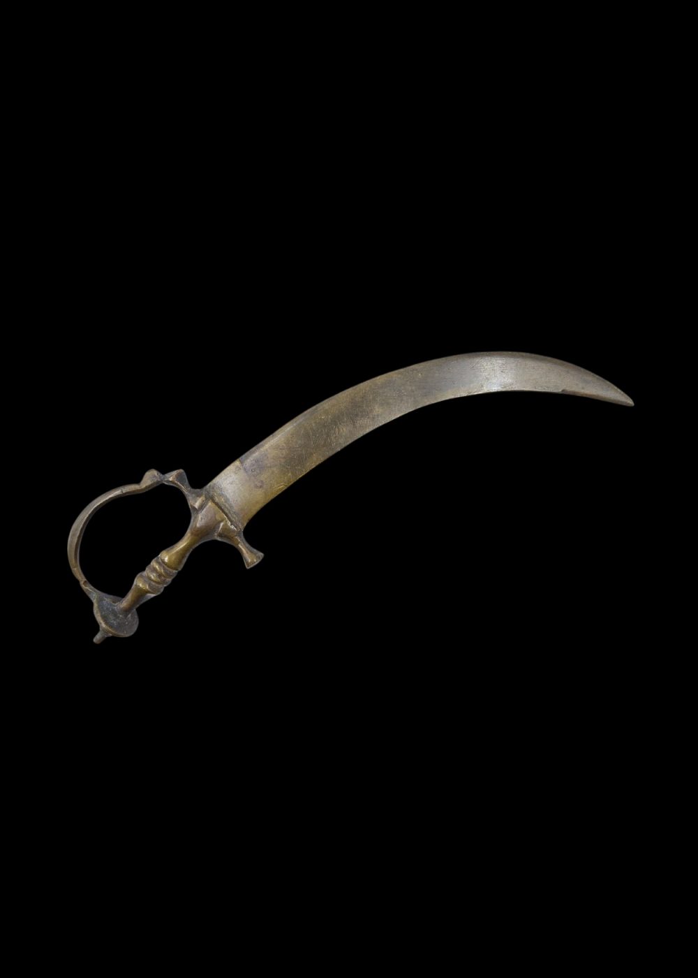 This is a traditional Indian talwar sword, recognized by its unique curved blade and distinctive knuckle guard hilt design. The talwar is an iconic weapon in Indian martial heritage, historically used by warriors and nobility for both ceremonial and combat purposes. Made from brass or bronze, this sword showcases fine craftsmanship and historical significance, making it a valuable collectible for enthusiasts and historians.