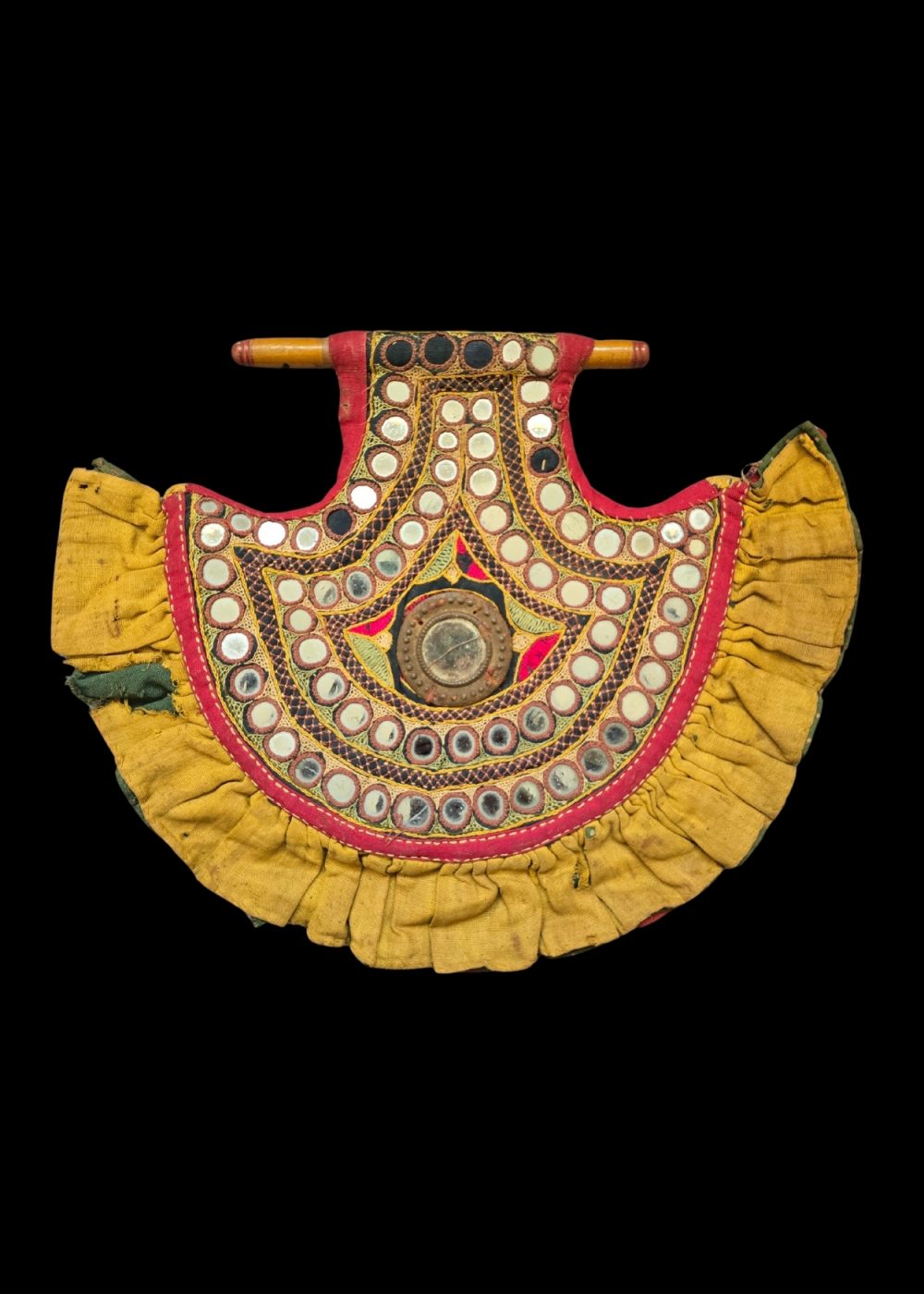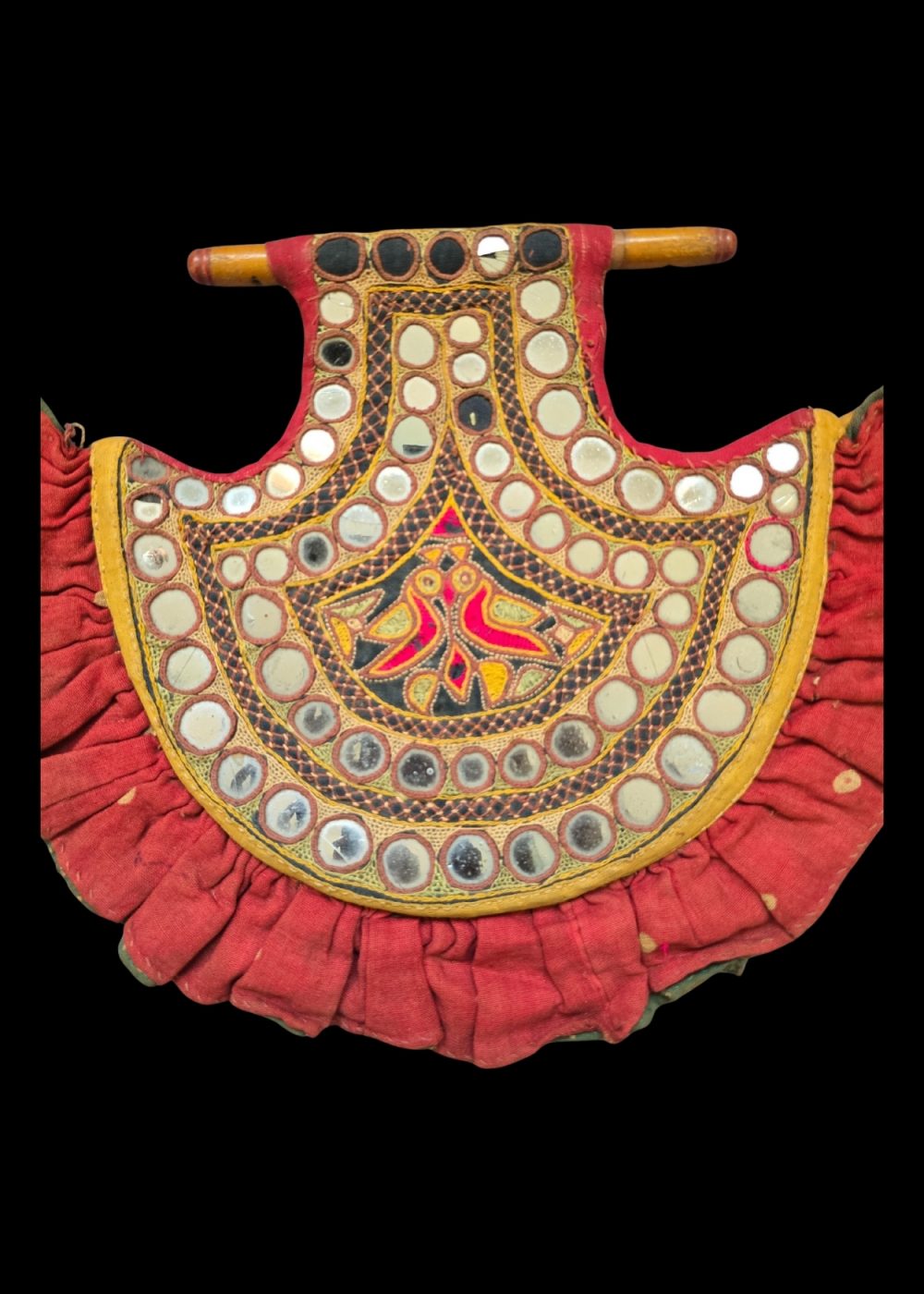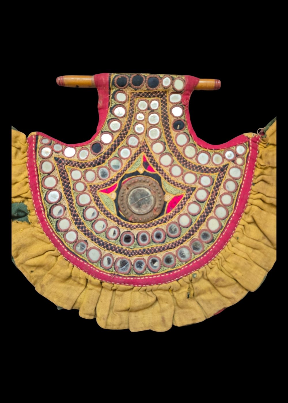 This traditional hand fan features exquisite hand embroidery and mirror work, a hallmark of Indian craftsmanship. The fan is made from rich red fabric, adorned with intricate stitching and decorated with circular mirrors that catch the light. The central design, likely inspired by nature or cultural motifs, is complemented by a ruffled border that enhances its aesthetic appeal. The fan’s wooden handle, elegantly incorporated into the design, adds a functional touch to the ornate decoration. This piece not only serves as a cooling tool but also as a beautiful example of the skilled artistry found in traditional Indian textile crafts.