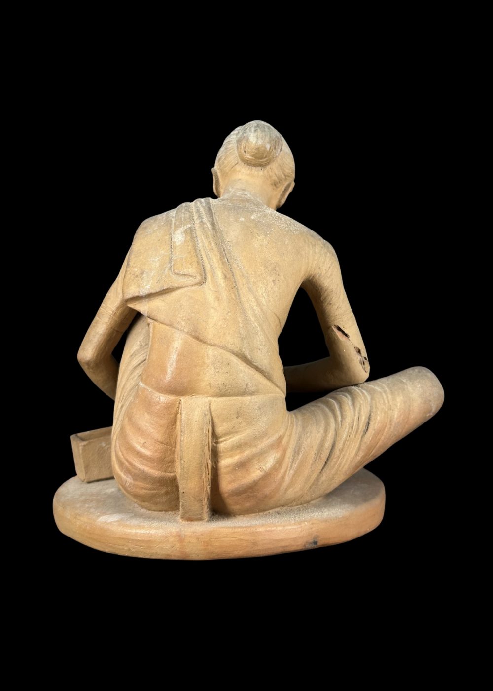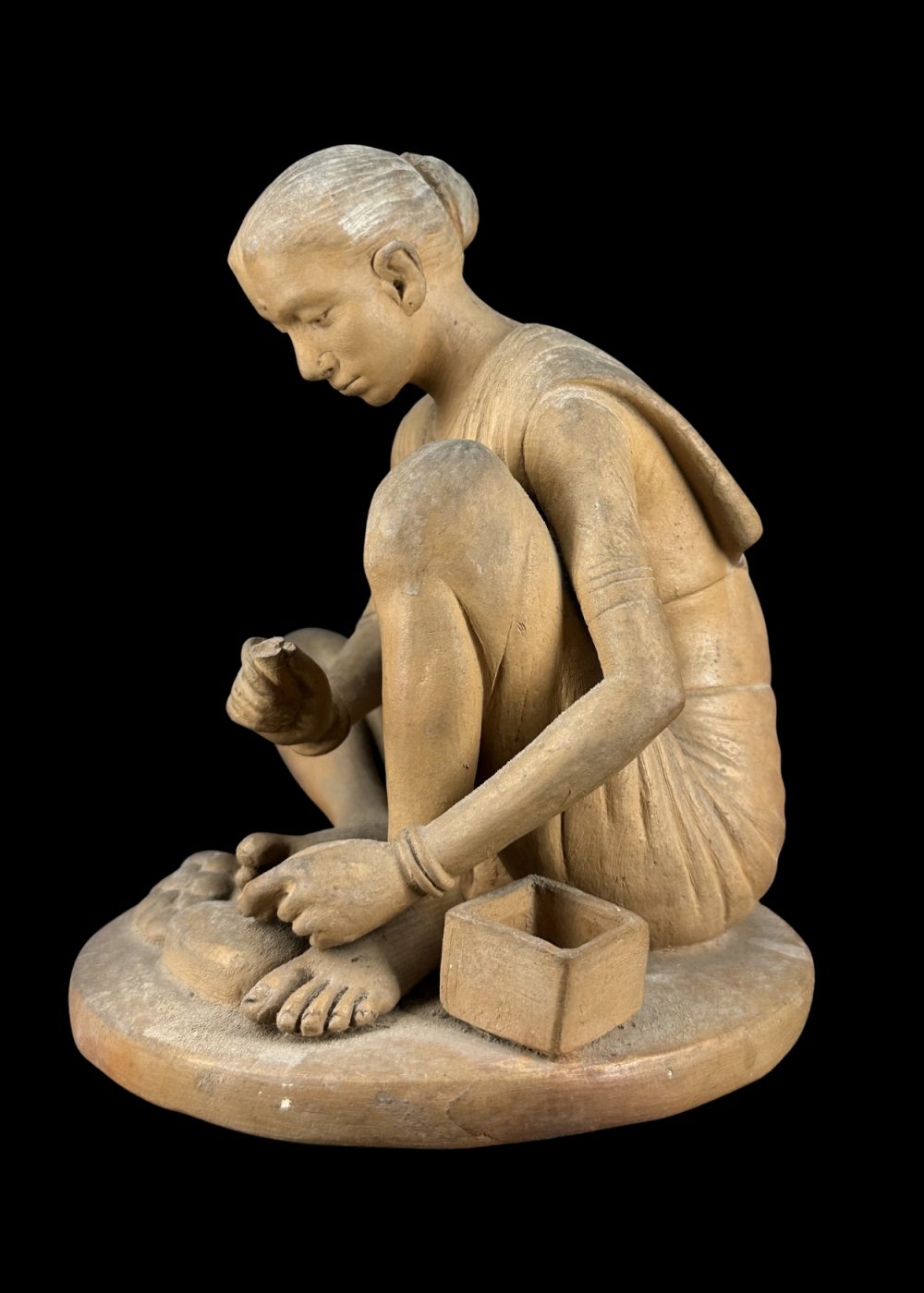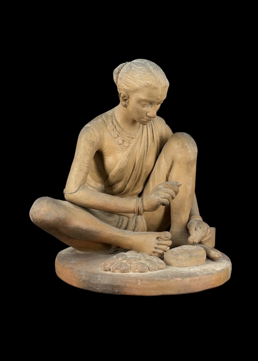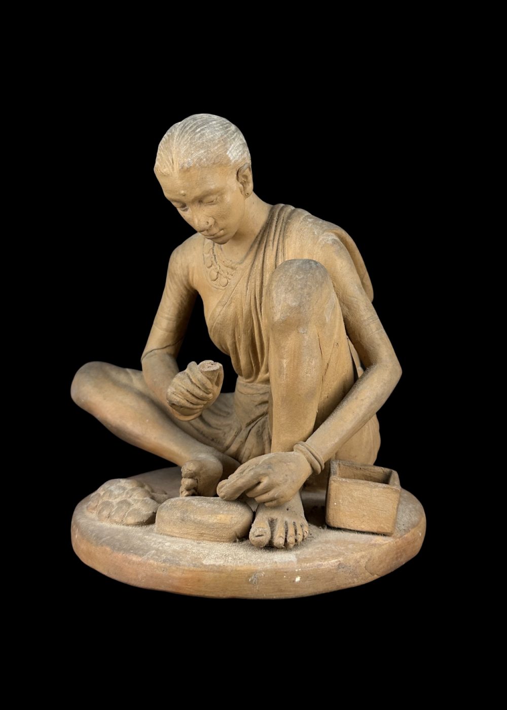 This elegant clay figurine from Krishnanagar, West Bengal, captures a serene moment of a traditional Indian woman preparing sweets, showcasing the exceptional realism of 18th–19th century Bengali craftsmanship. Sculpted with intricate detailing and natural posture, this unpainted figure reflects the pure form of folk artistry unique to Krishnanagar. A timeless addition to heritage art collections or ethnic-themed décor.
