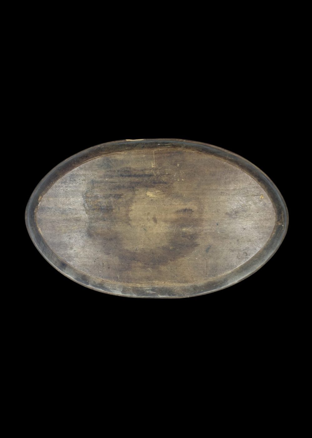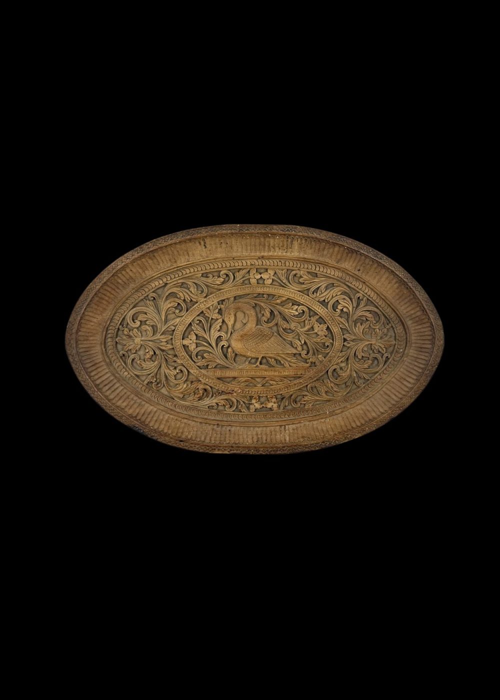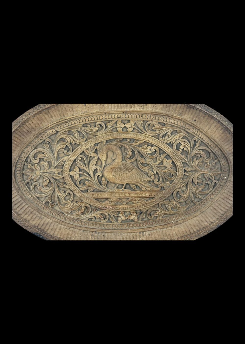 This intricately carved sandalwood plaque from Karnataka, estimated to be 80–90 years old, features a majestic peacock surrounded by elaborate floral motifs. The oval design is framed with delicate borders, showcasing the region’s traditional craftsmanship and attention to detail. The natural fragrance of sandalwood adds to its charm, making it both a visual and sensory tribute to Karnataka’s rich heritage of ornamental woodwork.