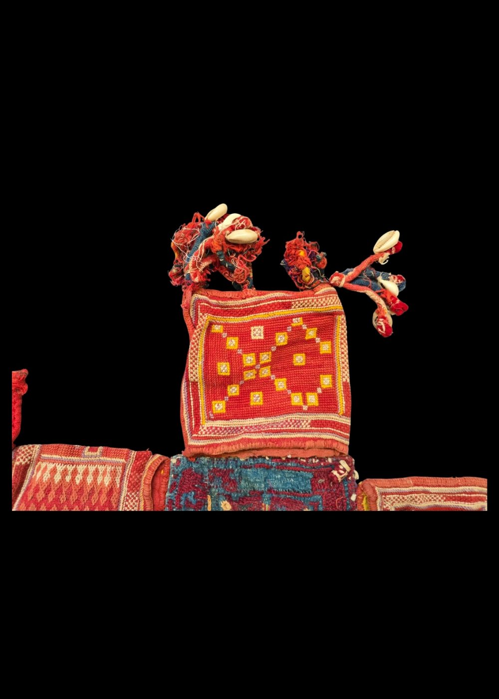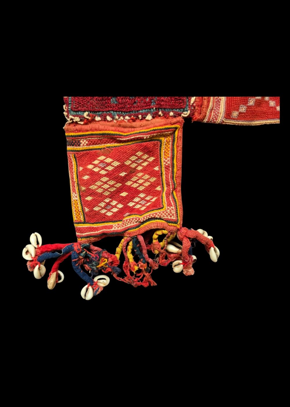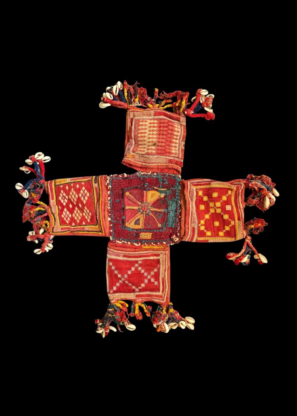 This Banjara Masala Bag, or spices bag, is a striking example of traditional craftsmanship from the Banjara community. Its vibrant red and yellow hues are beautifully complemented by geometric patterns and intricate embroidery. The bag is adorned with colorful tassels and cowrie shells, which add both decorative and cultural significance. The rich design and detailed stitching showcase the skillful artistry behind these bags, which are typically used for storing spices but also represent the heritage and craftsmanship of the Banjara people. The combination of bold colors and intricate details makes this piece a true representation of traditional Indian textile art.