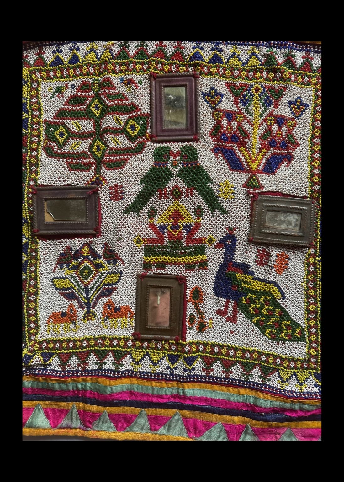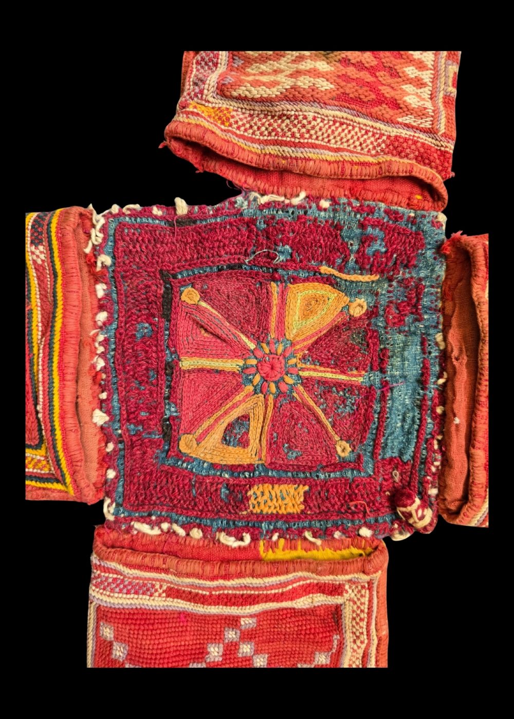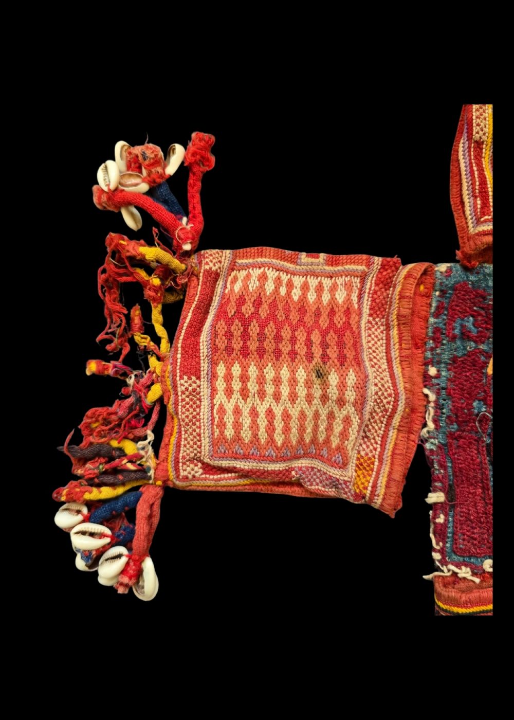 This Banjara Masala Bag, or spices bag, is a striking example of traditional craftsmanship from the Banjara community. Its vibrant red and yellow hues are beautifully complemented by geometric patterns and intricate embroidery. The bag is adorned with colorful tassels and cowrie shells, which add both decorative and cultural significance. The rich design and detailed stitching showcase the skillful artistry behind these bags, which are typically used for storing spices but also represent the heritage and craftsmanship of the Banjara people. The combination of bold colors and intricate details makes this piece a true representation of traditional Indian textile art.
