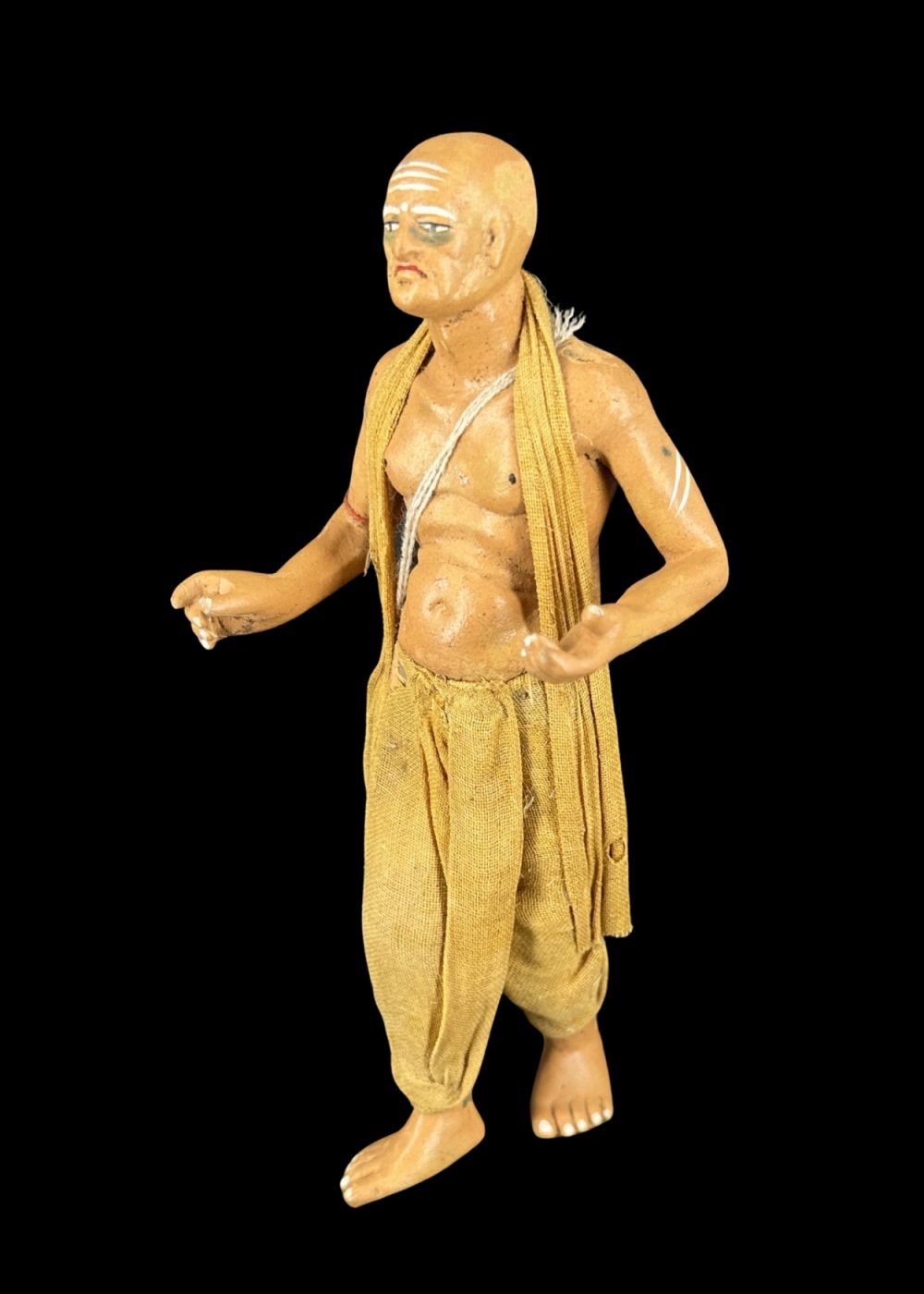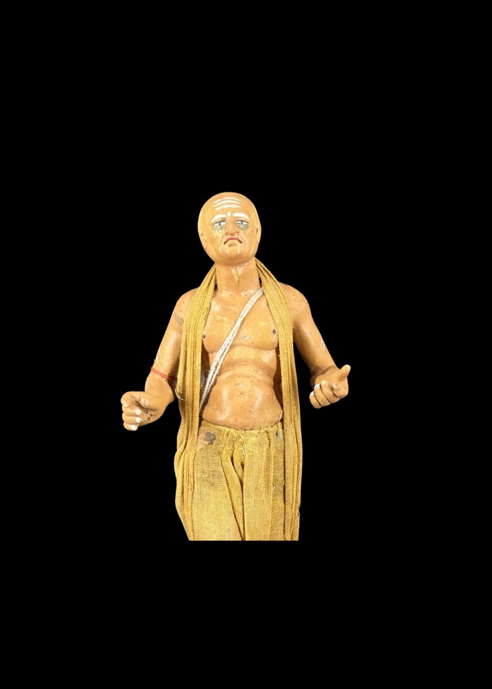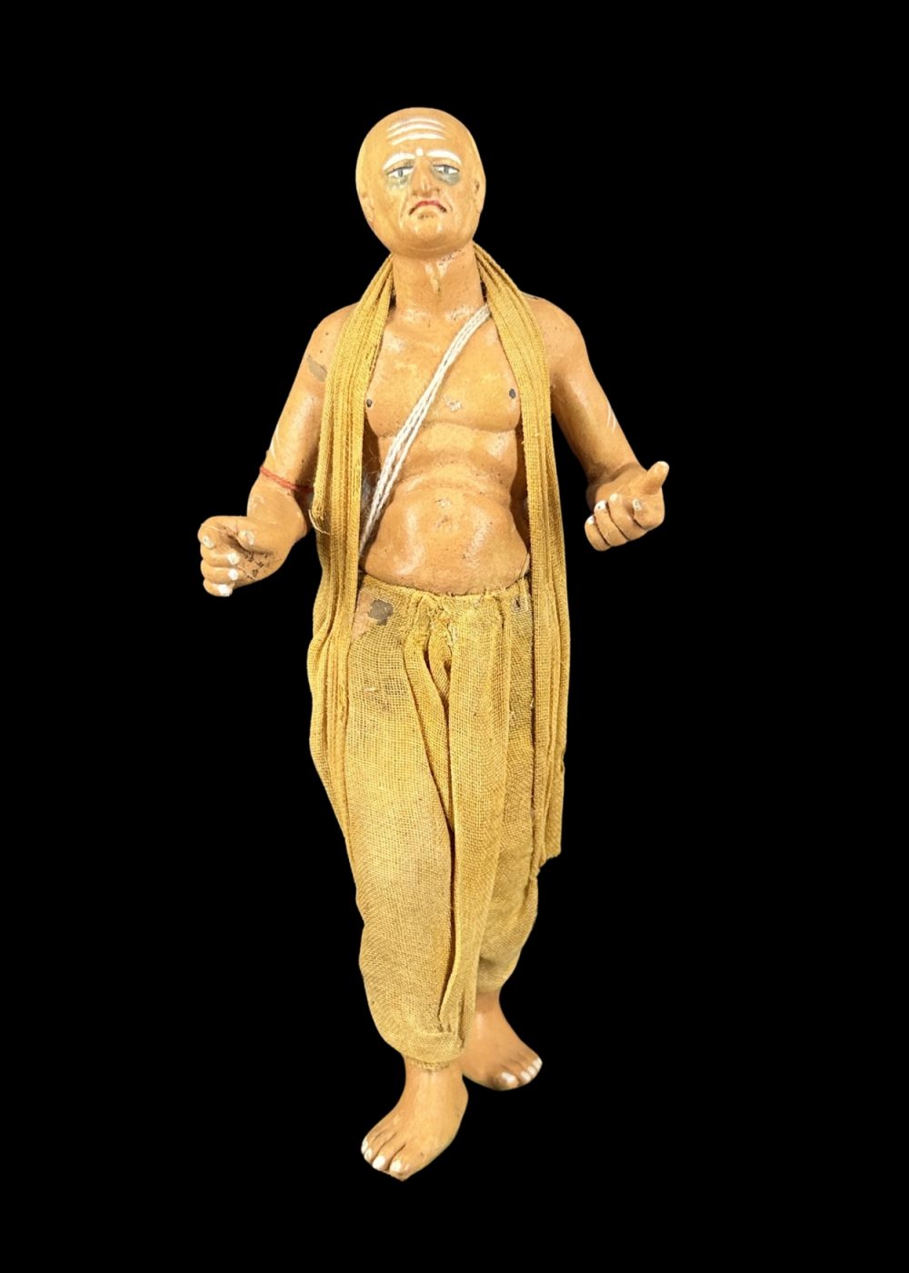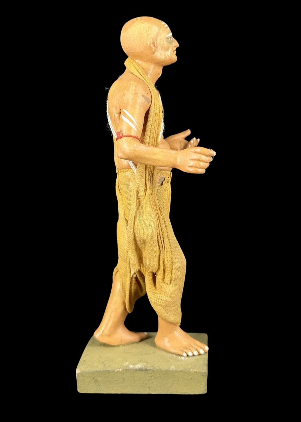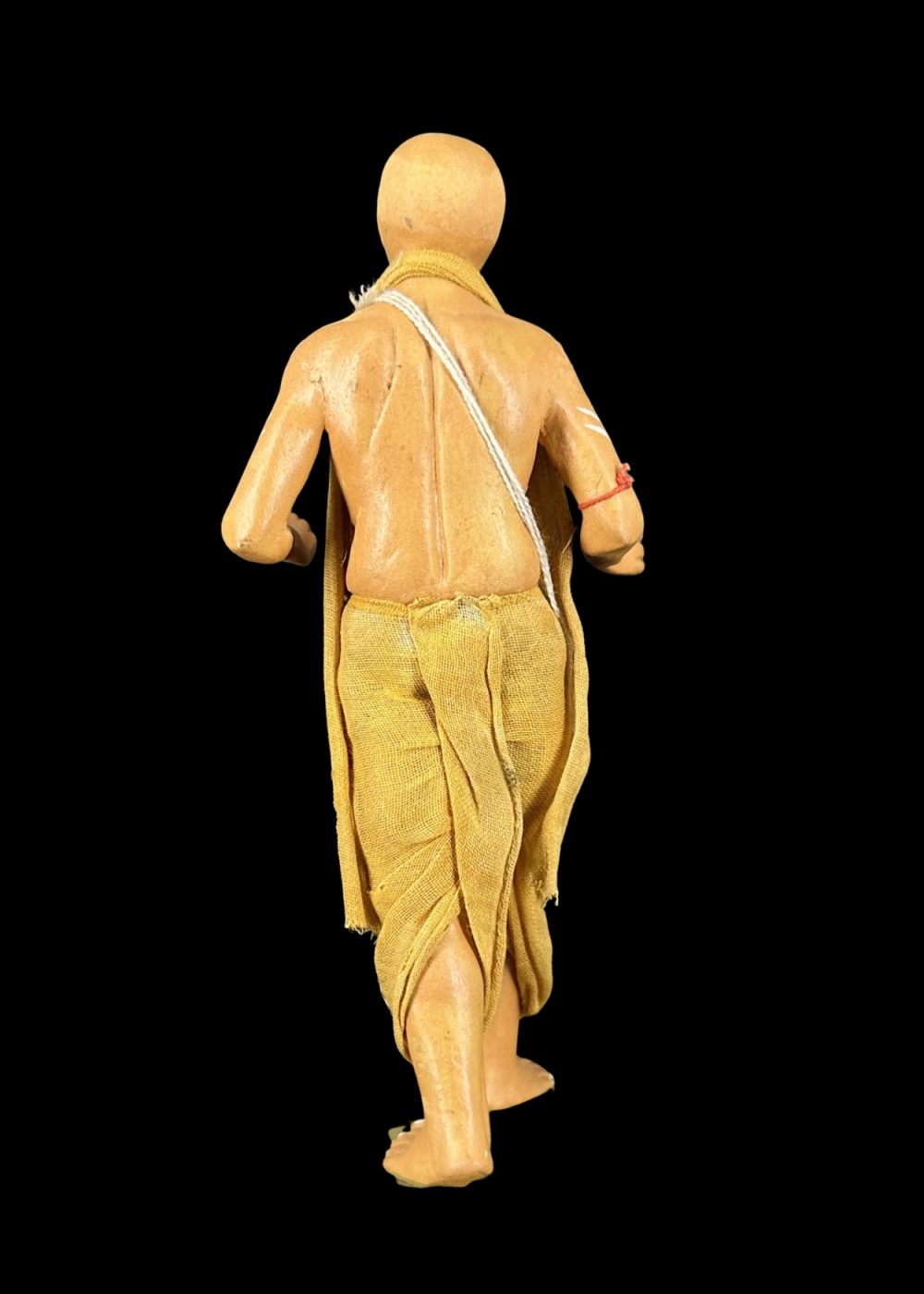 This clay figurine portrays a Vaishnava devotee mid-step, likely engaged in a devotional procession or spiritual dance (sankirtan). Dressed in simple ochre robes with a sacred thread draped across his torso, the figure embodies humility and spiritual fervor. His expressive stance and upward gaze reflect deep devotion and surrender, characteristic of Bhakti movement practices.