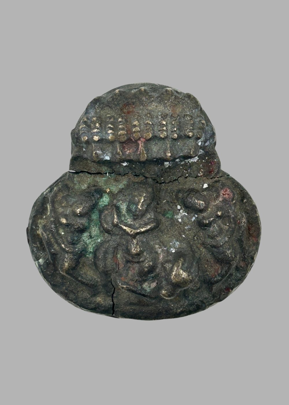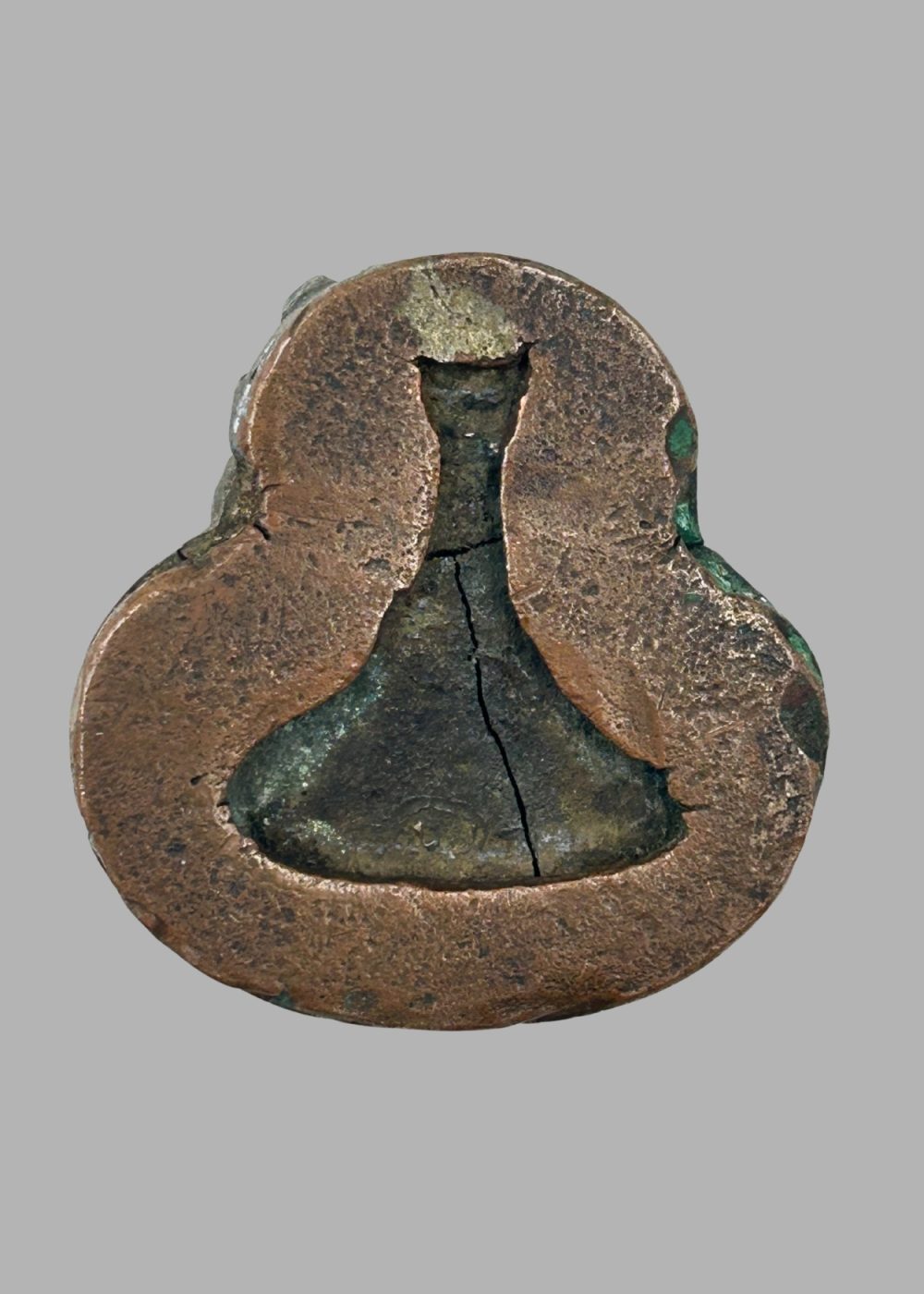 This bronze ornamental die from Karnataka depicts Valu Gopal, a playful and youthful form of Lord Krishna, often shown with a flute and surrounded by devotees or cows. The rounded form and relief detailing suggest it was used as a stamping die, likely for textile or jewelry decoration. The artwork shows fine craftsmanship in bas-relief, with worn yet visible divine figures, characteristic of devotional metalwork in Karnataka. This object blends utilitarian purpose with sacred imagery, reflecting the spiritual and artistic heritage of the region.