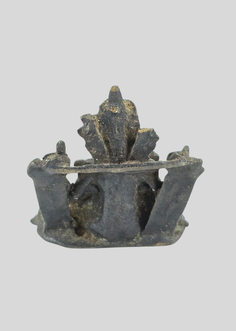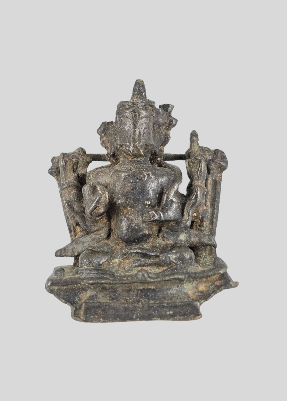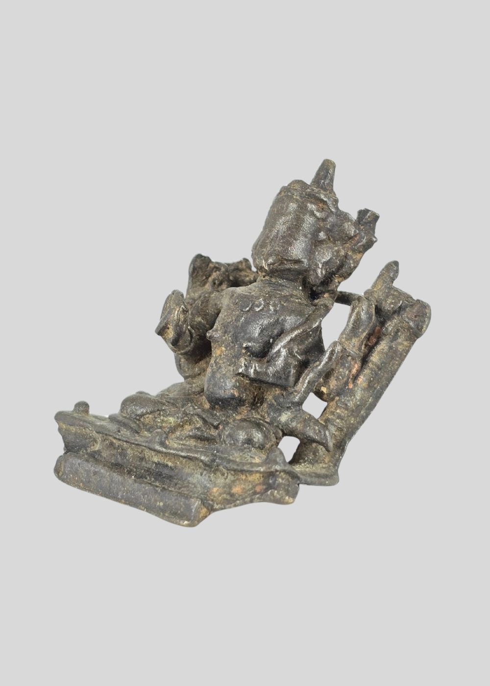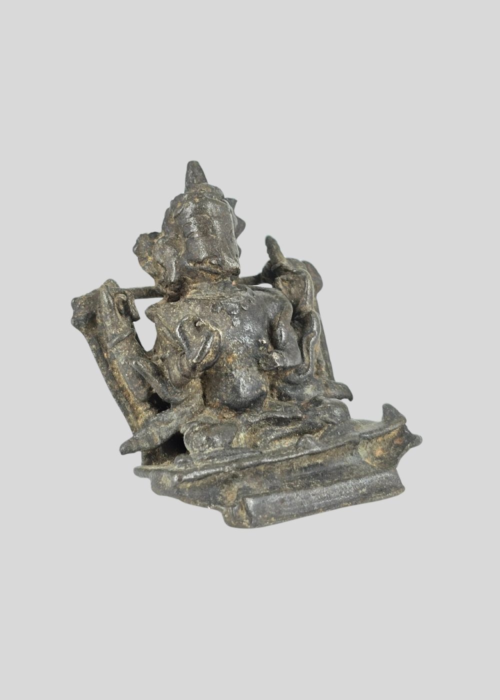 This bronze sculpture from Nepal depicts Varaha, the boar-headed incarnation of Lord Vishnu. Shown seated in a dignified posture, the figure embodies the divine act of rescuing the earth from cosmic waters. The sculpture retains traces of fine detailing in its ornaments and attire, reflecting the Nepalese bronze casting tradition. With its compact form and devotional presence, the piece stands as a sacred symbol of protection and cosmic balance.