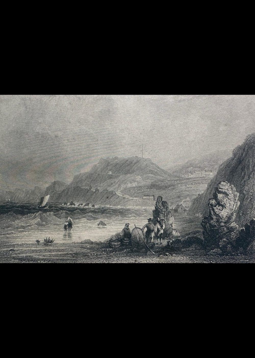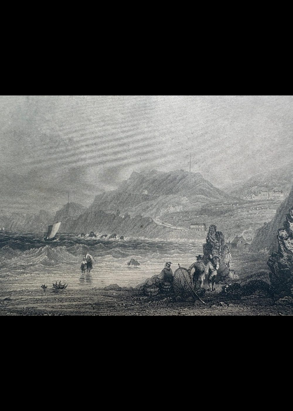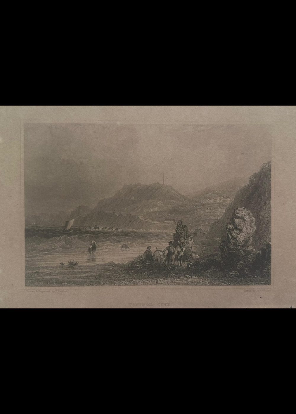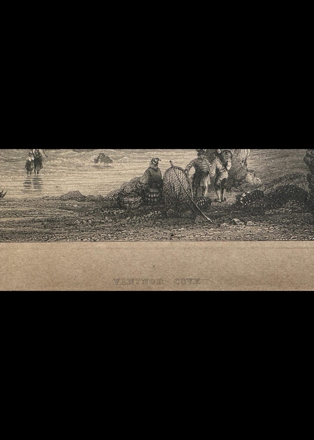 This is a vintage engraved illustration titled “VENTNOR COVE,” depicting a dramatic and rugged section of coastline, likely on the Isle of Wight, known for its striking natural beauty. The scene captures a windswept cove bordered by towering cliffs and rocky outcrops. In the foreground, a group of figures and donkeys gather near fishing nets and gear, suggesting a humble seaside livelihood. The middle ground features waves rolling in from a restless sea, where a sailboat can be seen navigating choppy waters. Farther in the distance, a winding coastal path leads the eye toward a settlement nestled against sloping hills, crowned by a tall flagstaff or signal post atop the ridge. The overall tone is moody and atmospheric, with intricate detailing in both the landscape and the figures, highlighting the rugged charm of the location. This engraving blends human activity with the raw power of nature, evoking the timeless connection between coastal communities and the sea.