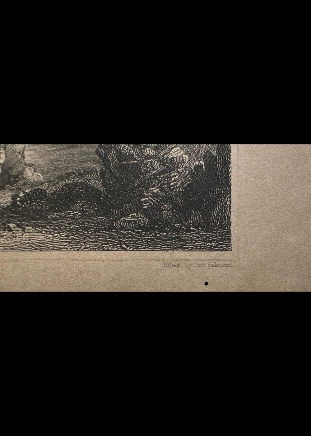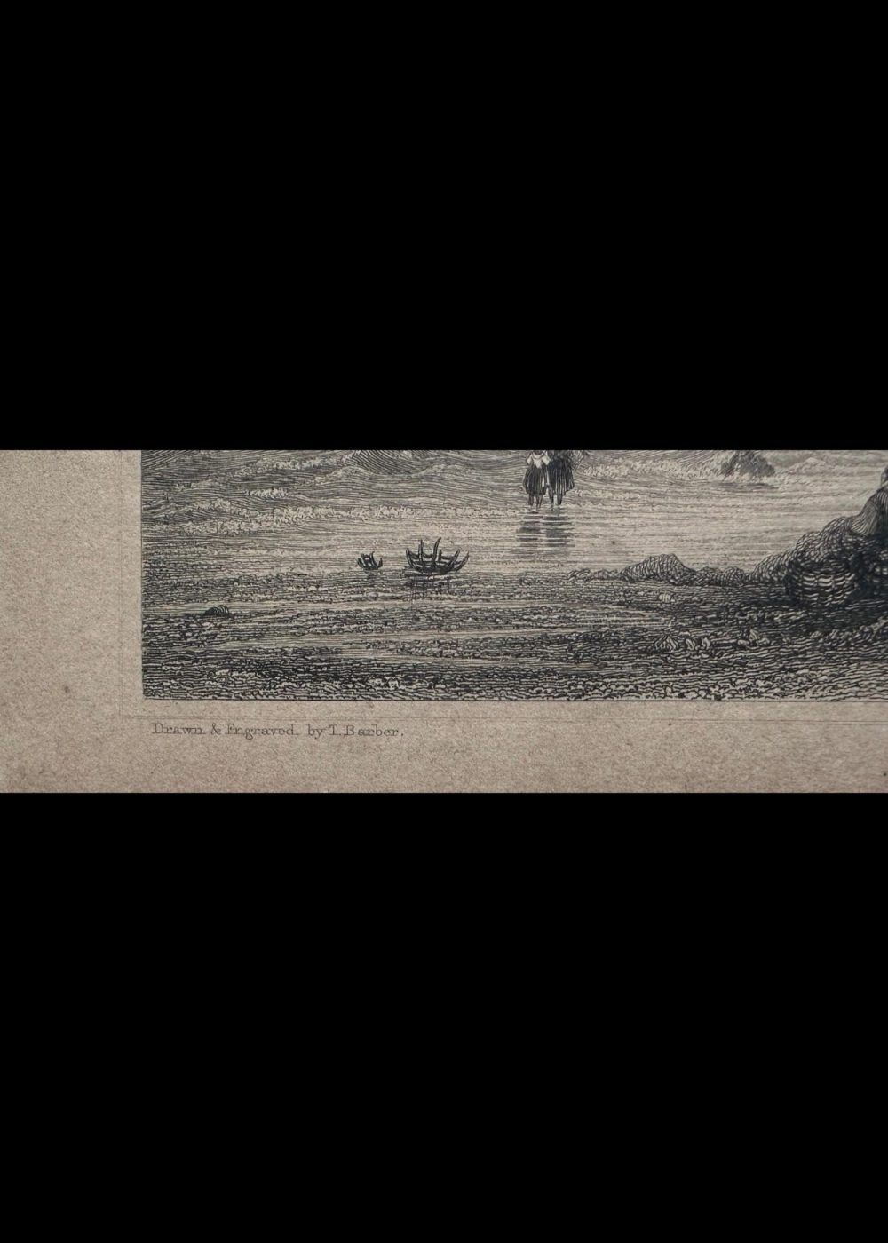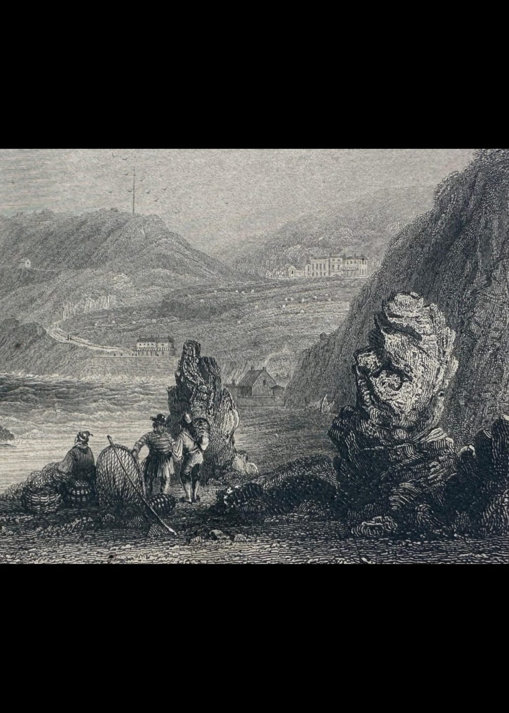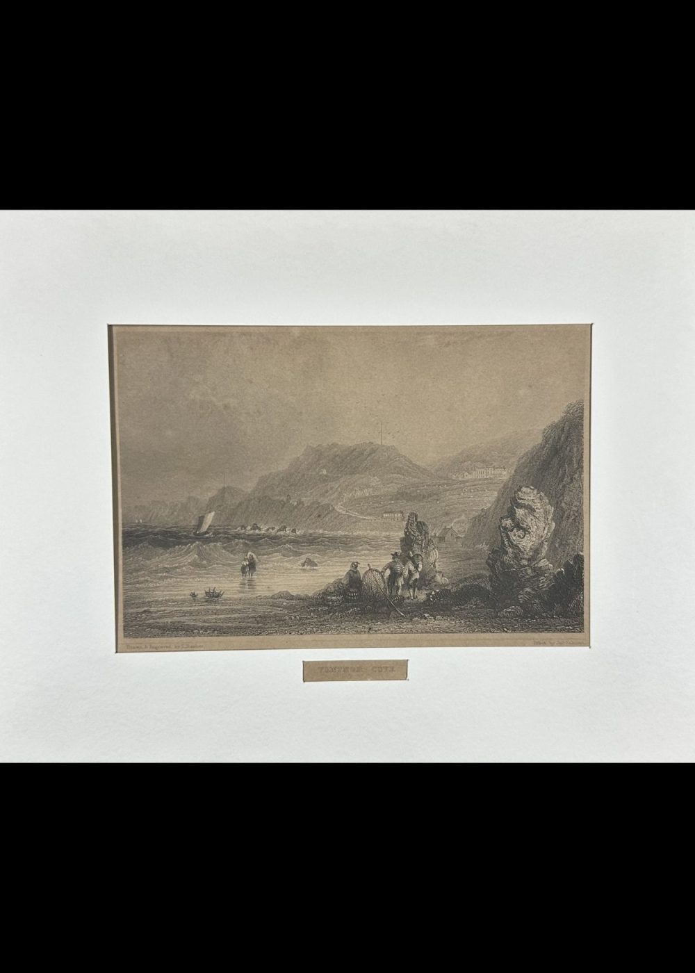 This is a vintage engraved illustration titled “VENTNOR COVE,” depicting a dramatic and rugged section of coastline, likely on the Isle of Wight, known for its striking natural beauty. The scene captures a windswept cove bordered by towering cliffs and rocky outcrops. In the foreground, a group of figures and donkeys gather near fishing nets and gear, suggesting a humble seaside livelihood. The middle ground features waves rolling in from a restless sea, where a sailboat can be seen navigating choppy waters. Farther in the distance, a winding coastal path leads the eye toward a settlement nestled against sloping hills, crowned by a tall flagstaff or signal post atop the ridge. The overall tone is moody and atmospheric, with intricate detailing in both the landscape and the figures, highlighting the rugged charm of the location. This engraving blends human activity with the raw power of nature, evoking the timeless connection between coastal communities and the sea.