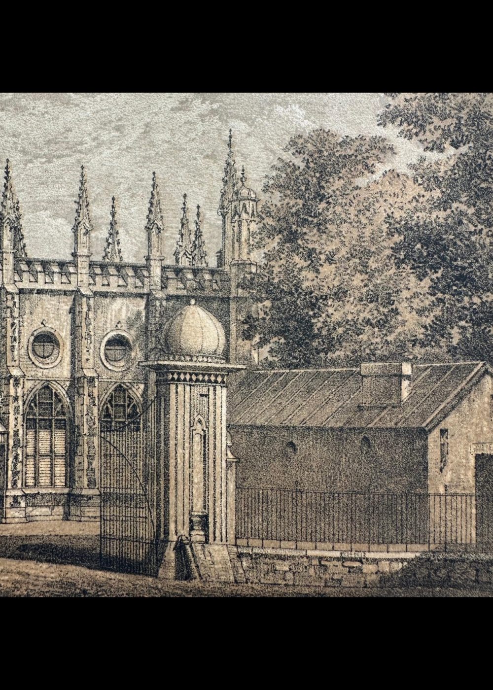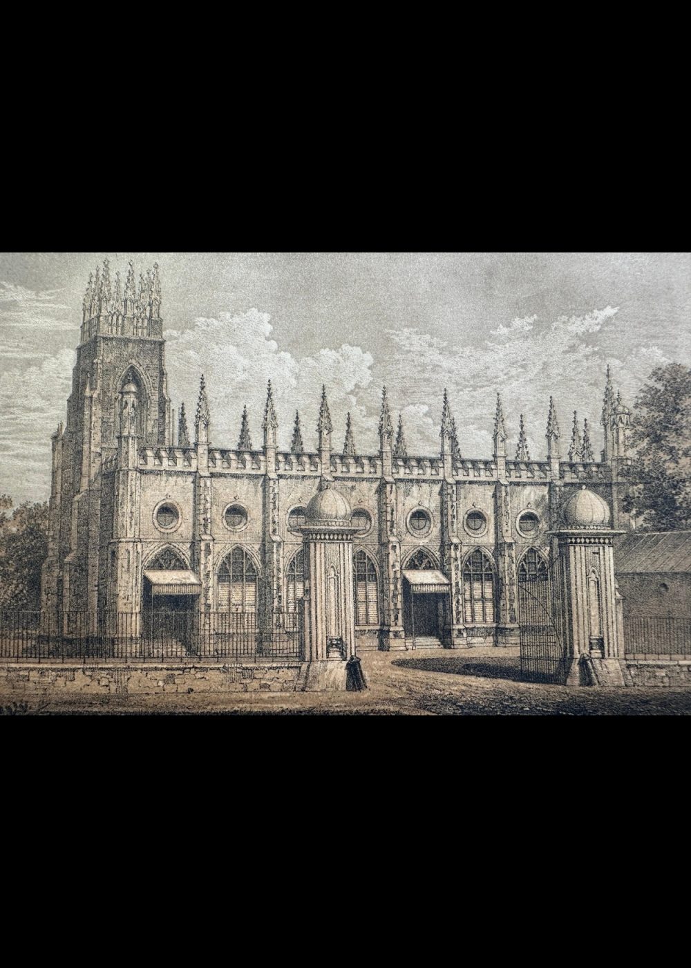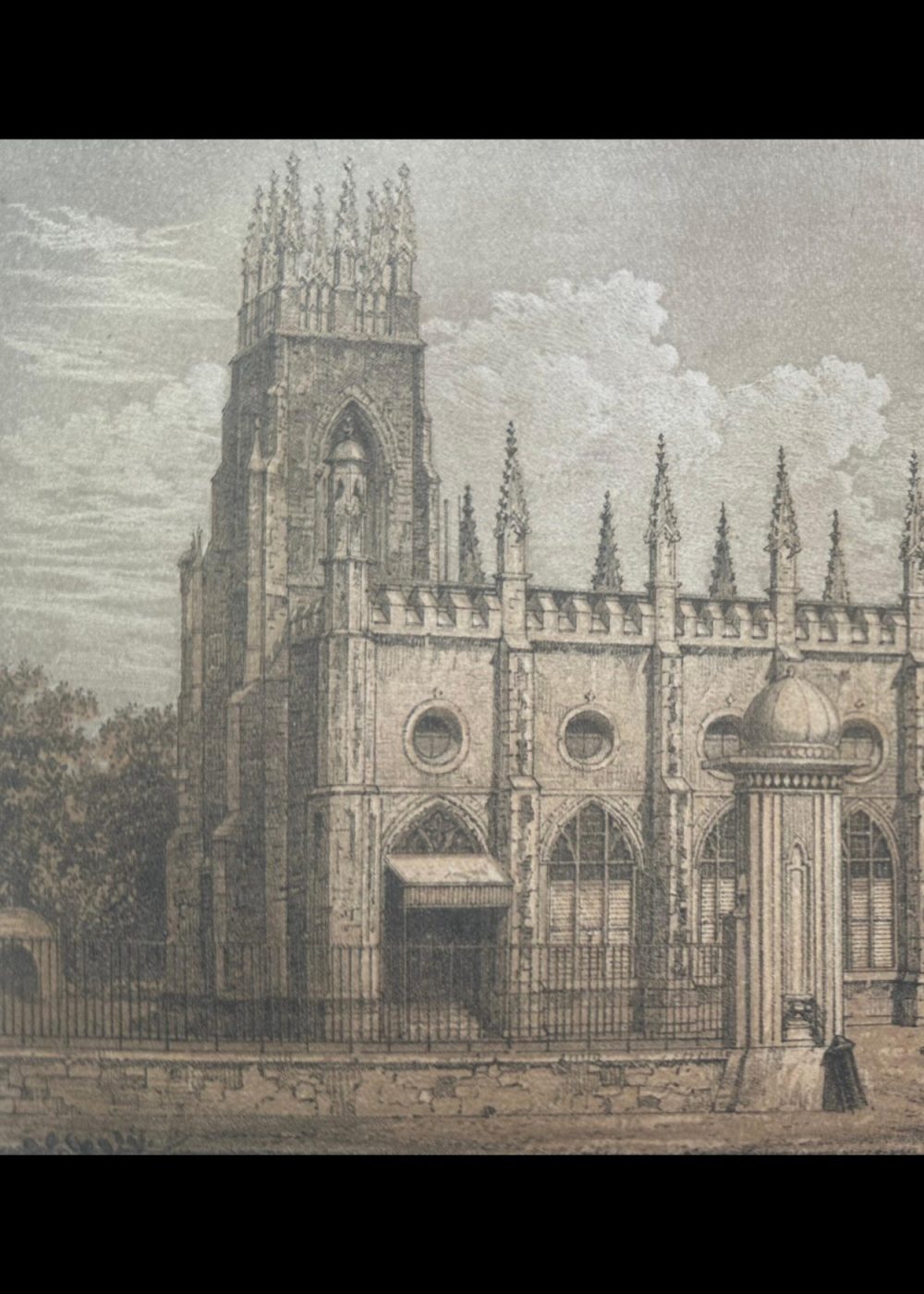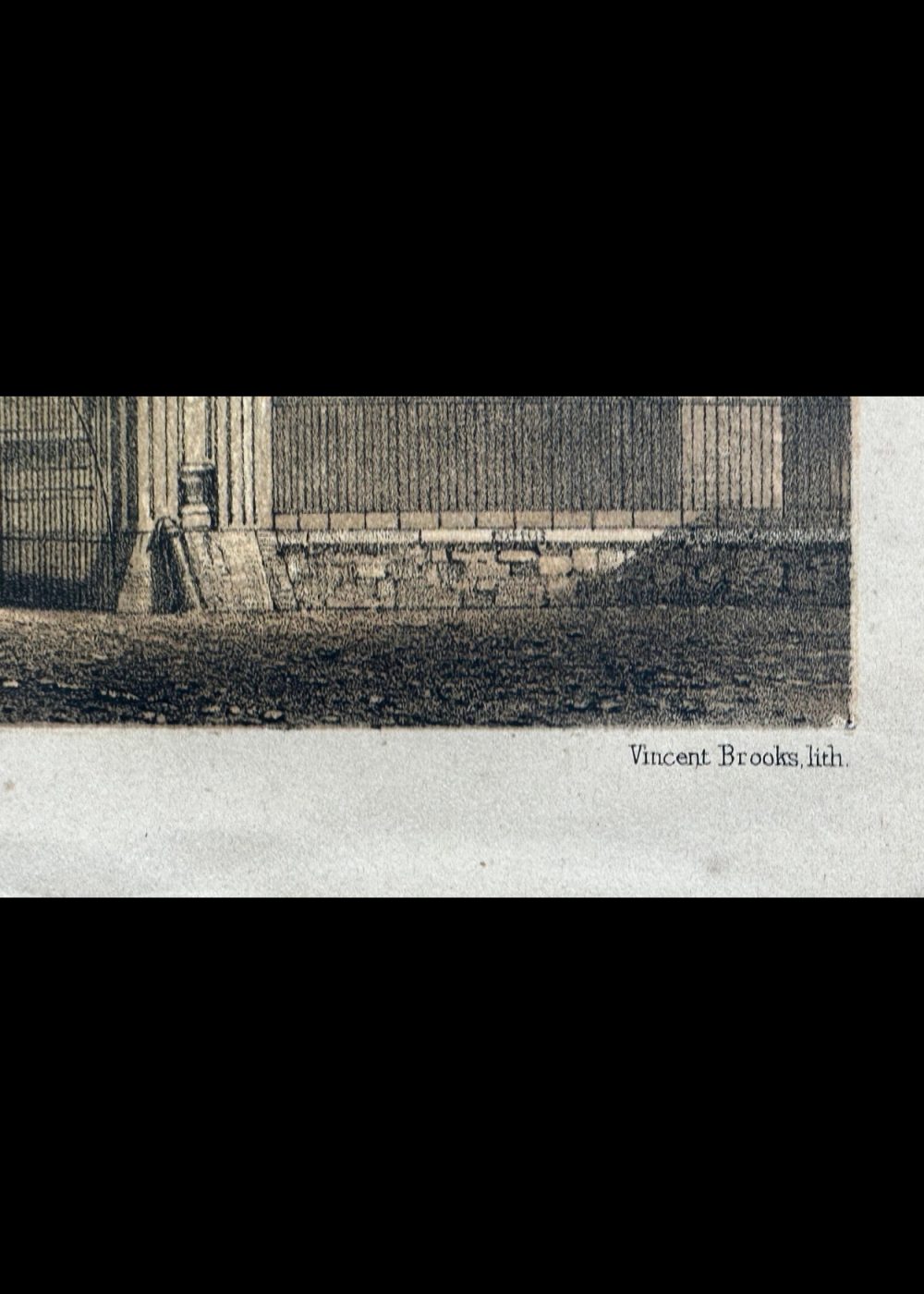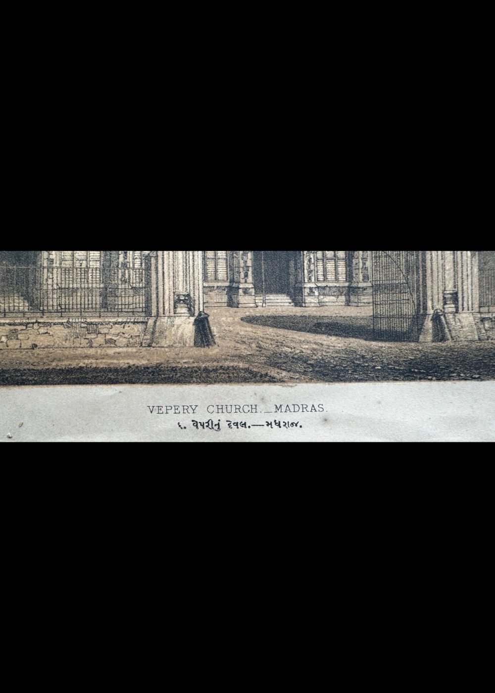 This cromo-lithograph titled “Vepery Church, Madras” is a detailed illustration of a prominent church located in the Vepery area of Madras (now Chennai), India. The image showcases the architectural beauty of the church, with its gothic-style spires and intricate design, typical of European-style churches built during the colonial era. The structure is framed by a set of decorative gates, and a water pump is visible in the foreground. The lithograph captures the church’s grandeur, reflecting both the cultural and architectural influences of the British in India during the 19th century. The artwork is a remarkable example of historical documentation of religious and colonial landmarks in India.