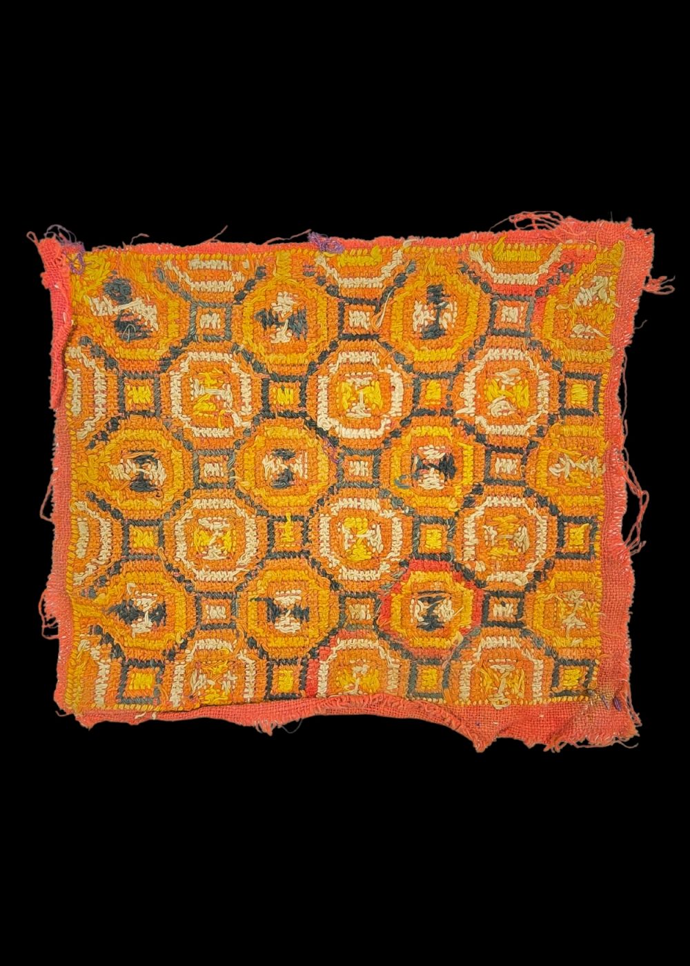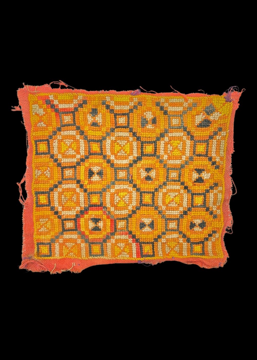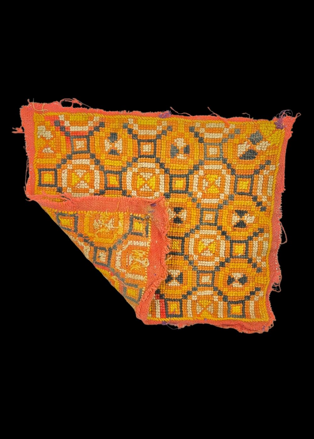 This Banjara handcrafted textile features intricate geometric patterns in warm hues of orange, yellow, and red, combined with subtle touches of black and white. The design showcases repeating circular and square motifs, demonstrating the traditional needlework techniques of the Banjara community. The vibrant colors and meticulous craftsmanship reflect the rich cultural heritage of this nomadic group. This textile piece is both an artistic expression and a functional item, often used for decorative purposes or as part of the Banjara’s everyday attire.