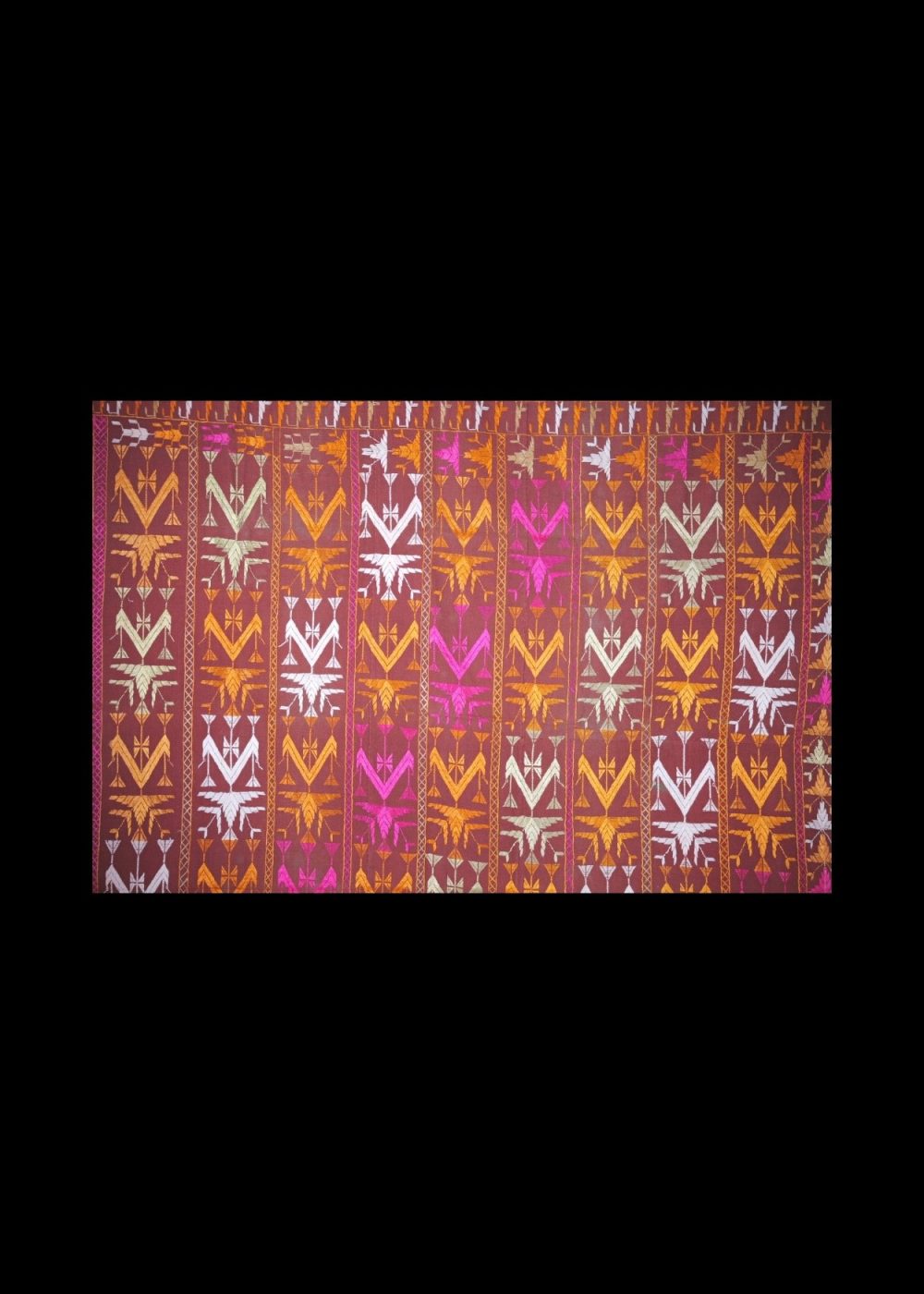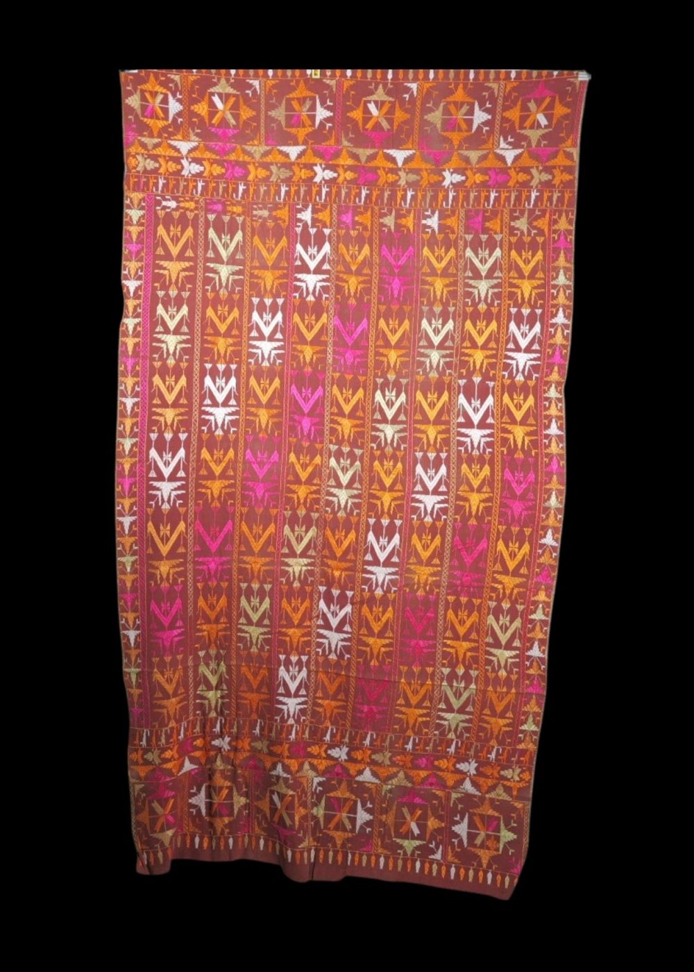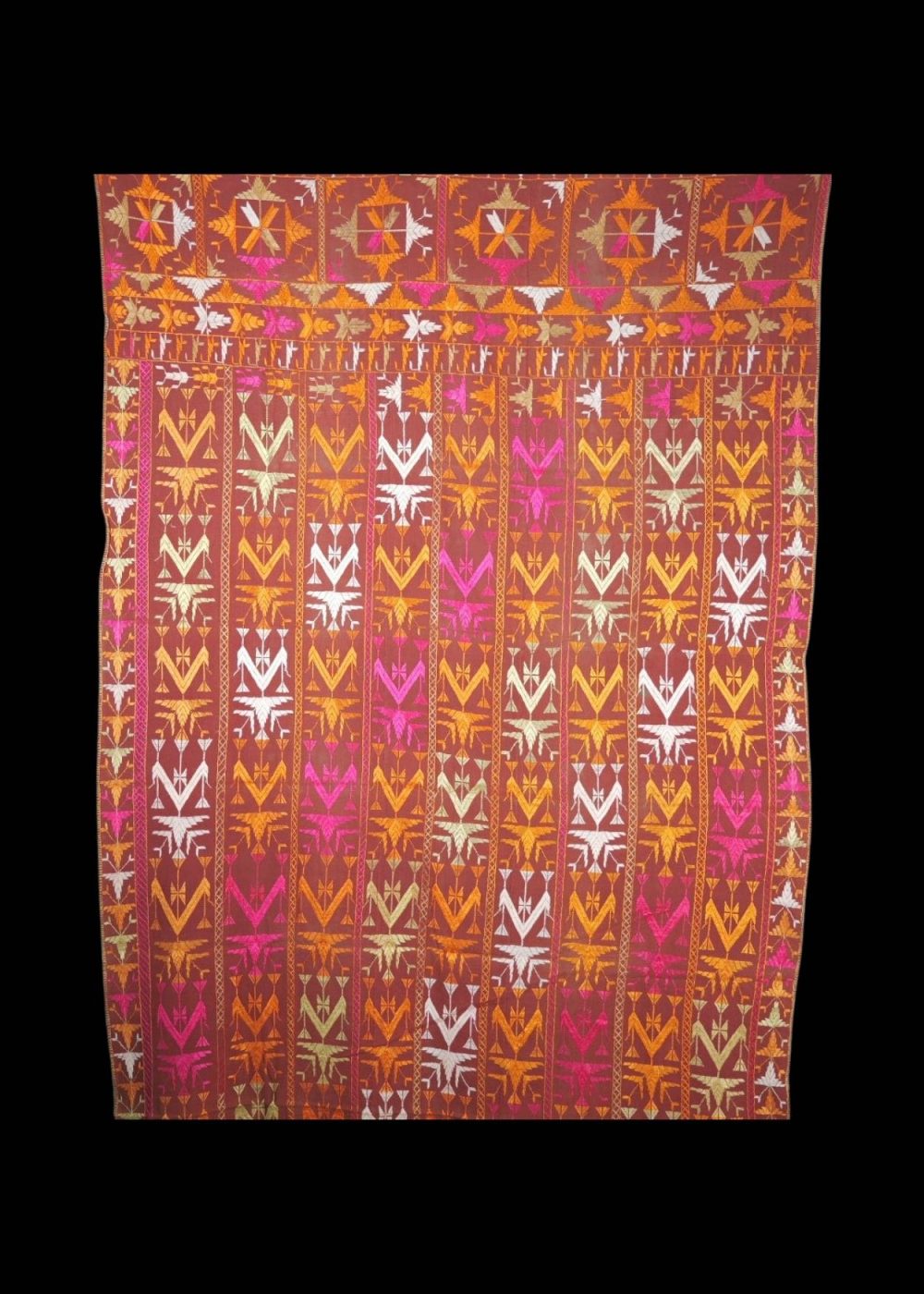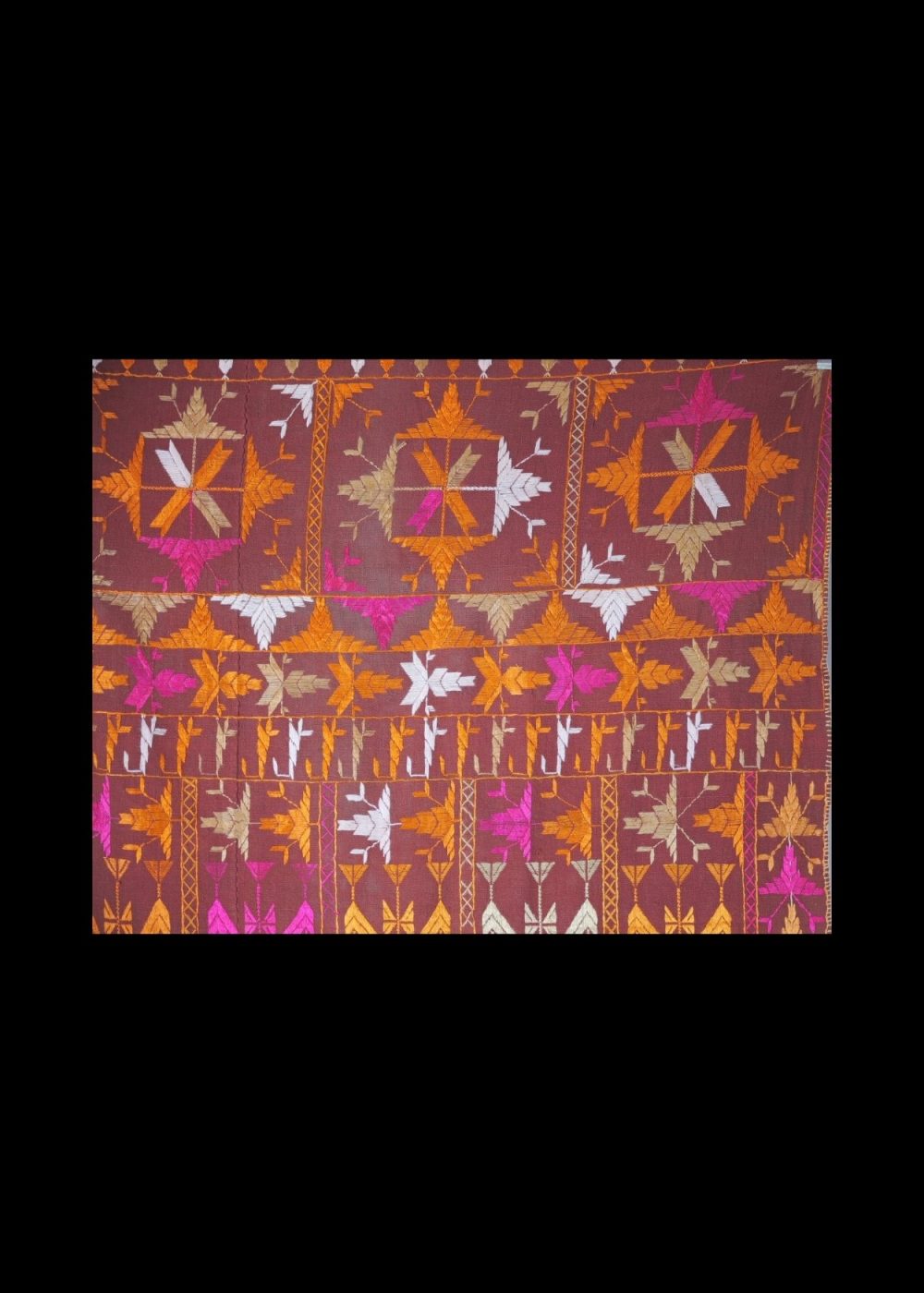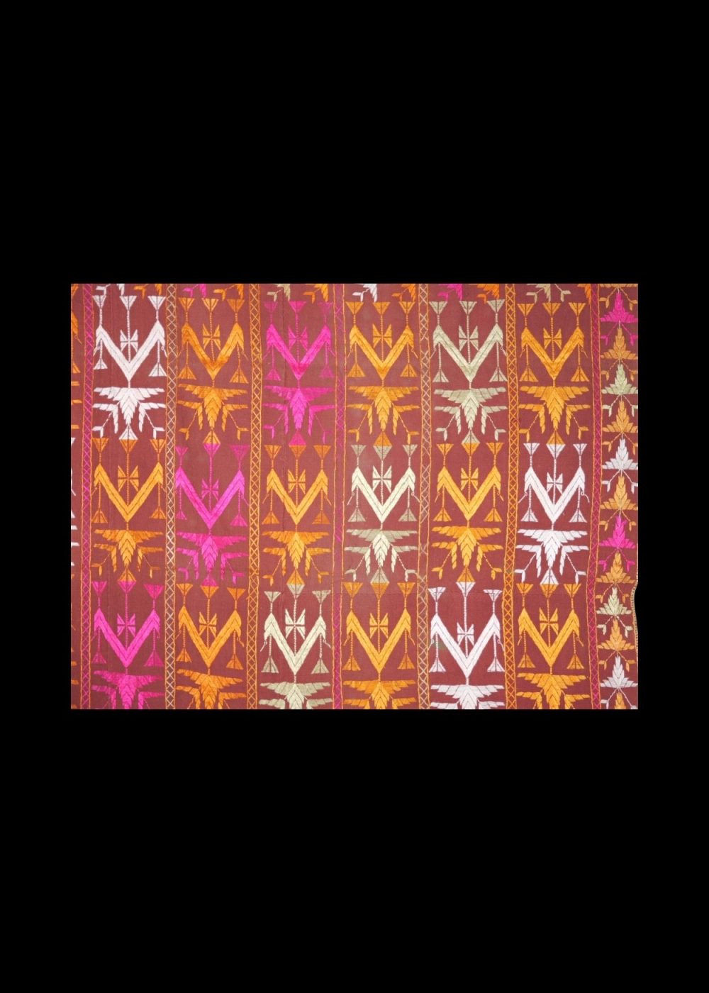 This eye-catching Phulkari textile is a radiant example of Punjab’s folk embroidery, known for its vivid color palette and intricate needlework. Handcrafted on a rich maroon base, the fabric is adorned with repetitive vertical floral and geometric patterns embroidered in vibrant shades of pink, orange, yellow, and white silk threads.The upper border features detailed star motifs and stylized floral vines, adding a regal touch to the overall composition. Traditionally used as a dupatta or shawl during festive and ceremonial occasions, this Phulkari is not just a garment but a cultural heirloom — representing the joy, strength, and artistry of Punjabi women.A beautiful blend of tradition and color, this textile is ideal for collectors, decorators, or anyone who appreciates heritage craft.