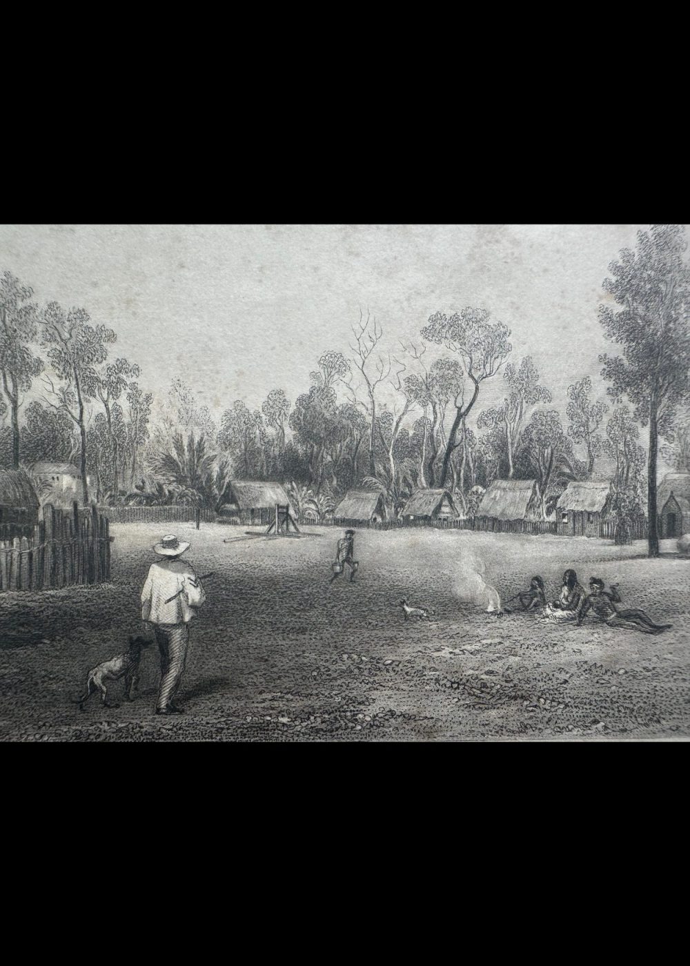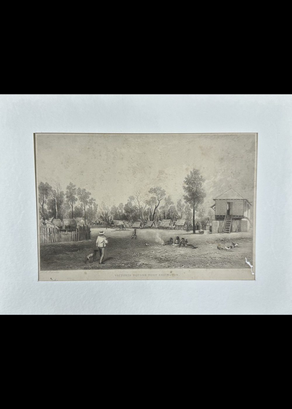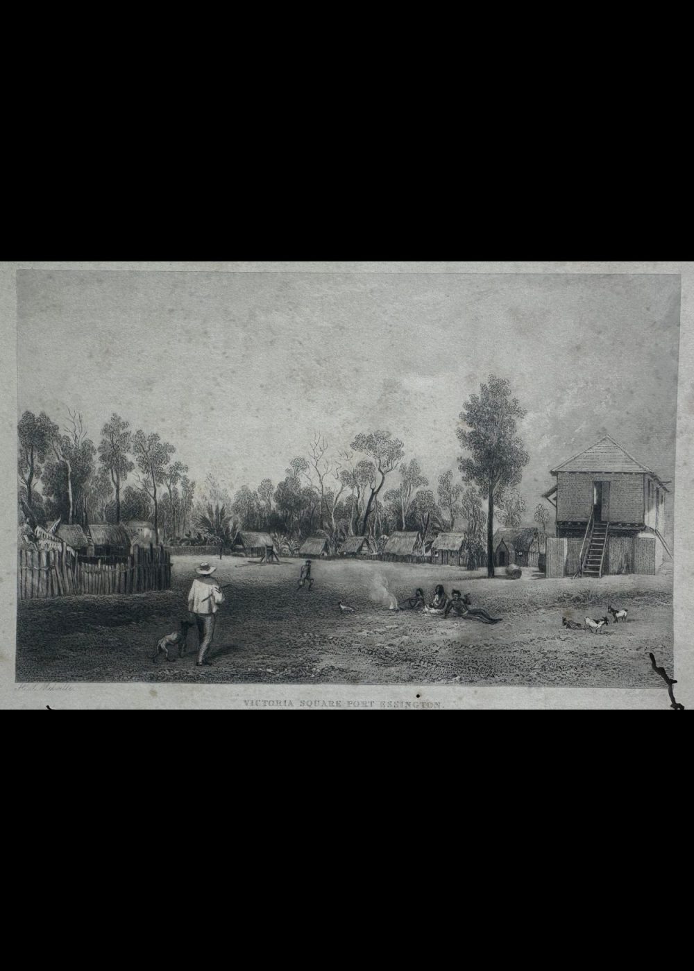 This detailed illustration portrays a colonial settlement scene at Victoria Square, Port Essington. In the foreground, a man with a wide-brimmed hat walks alongside a dog toward a group gathered around a small fire. To the right, a raised wooden structure with stairs suggests administrative or residential use. Scattered huts and dwellings appear in the background, nestled among trees, indicating a modest but organized community. The composition reflects daily life in an early Australian outpost, capturing the blend of European settlement and frontier conditions during the 19th century..