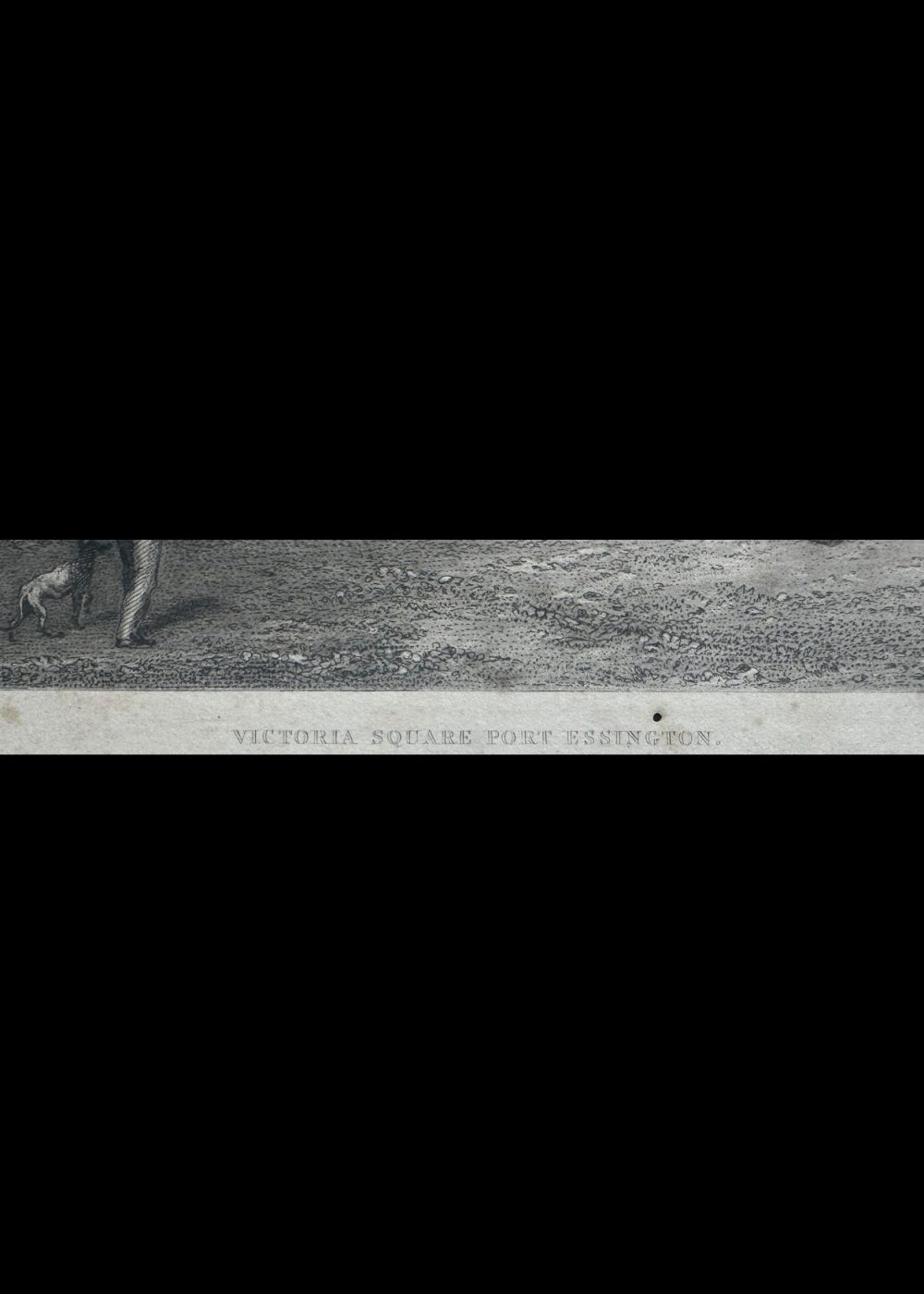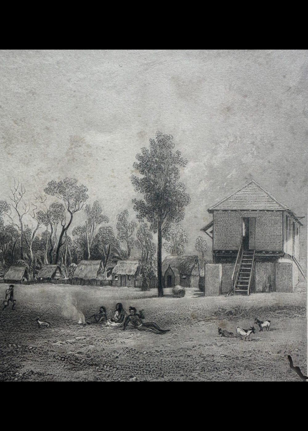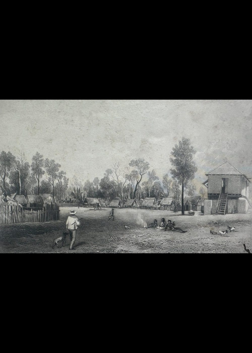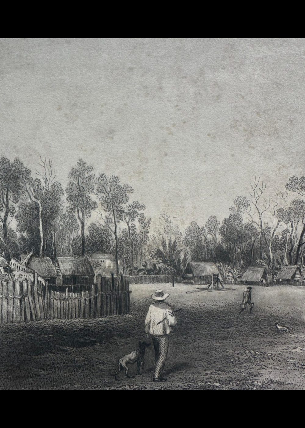 This detailed illustration portrays a colonial settlement scene at Victoria Square, Port Essington. In the foreground, a man with a wide-brimmed hat walks alongside a dog toward a group gathered around a small fire. To the right, a raised wooden structure with stairs suggests administrative or residential use. Scattered huts and dwellings appear in the background, nestled among trees, indicating a modest but organized community. The composition reflects daily life in an early Australian outpost, capturing the blend of European settlement and frontier conditions during the 19th century..