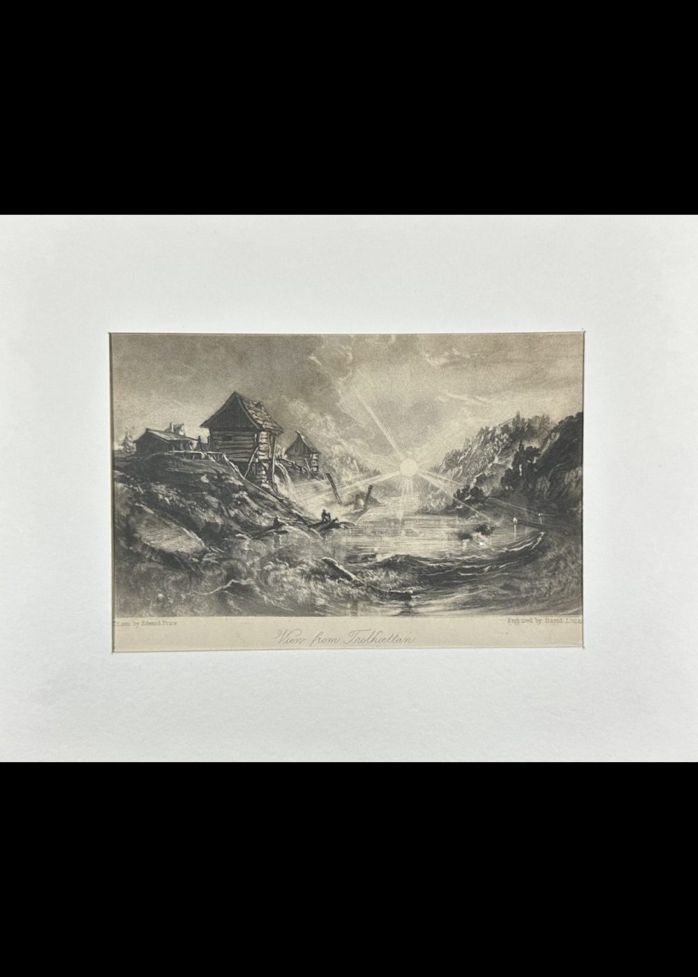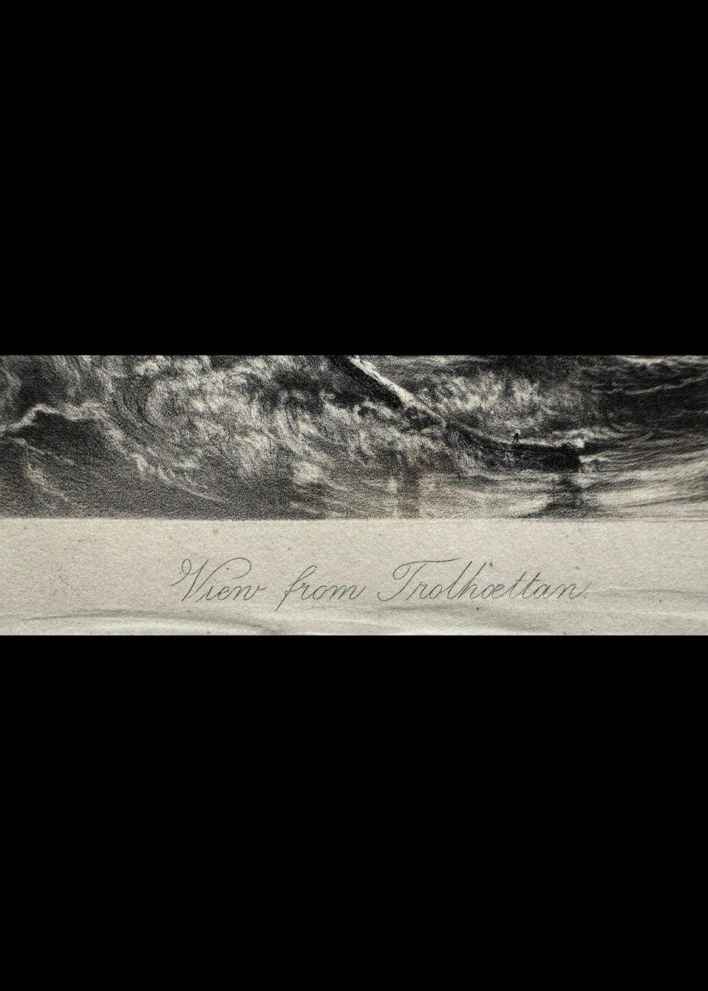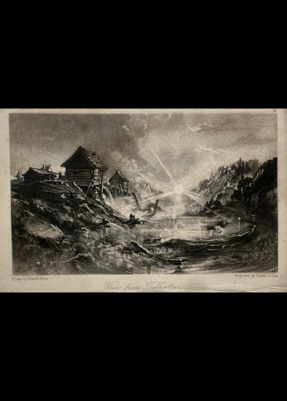 Engraving by Daniel Lucas, after Edward Price, presents a dramatic riverside scene at Trollhättan. Wooden structures perch on rocky terrain beside a turbulent river, while sunlight streams across the landscape, highlighting the contrast between natural force and human settlement. The composition captures the rugged beauty of the Scandinavian environment with Romantic intensity.