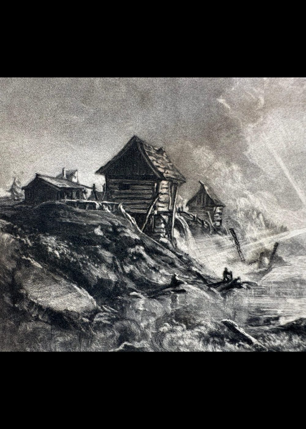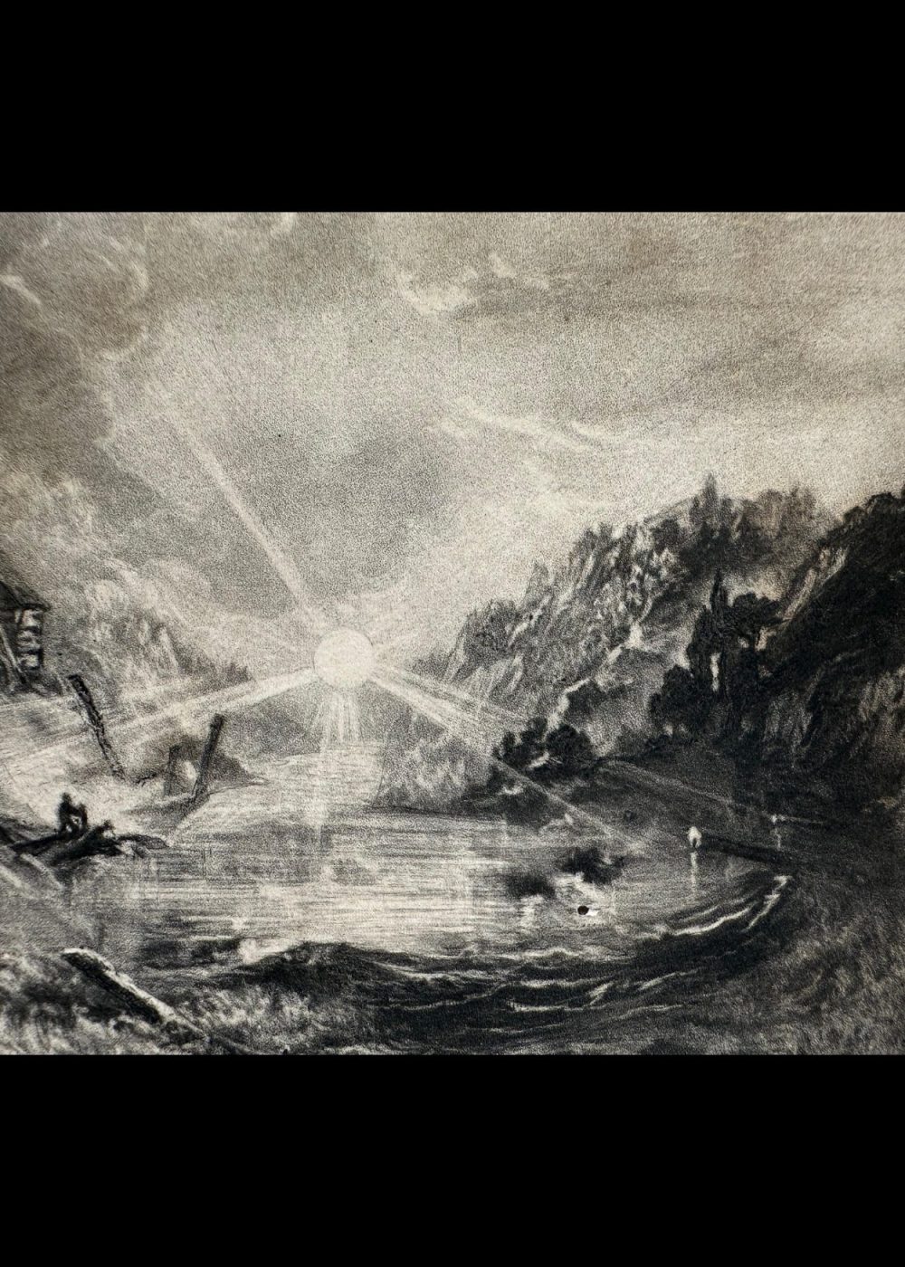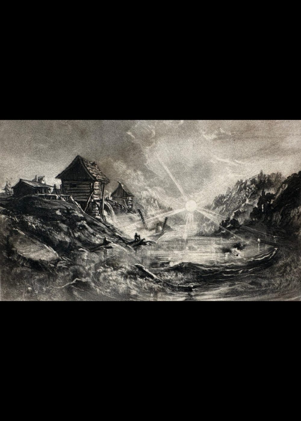 Engraving by Daniel Lucas, after Edward Price, presents a dramatic riverside scene at Trollhättan. Wooden structures perch on rocky terrain beside a turbulent river, while sunlight streams across the landscape, highlighting the contrast between natural force and human settlement. The composition captures the rugged beauty of the Scandinavian environment with Romantic intensity.