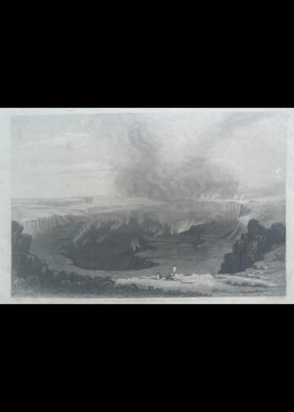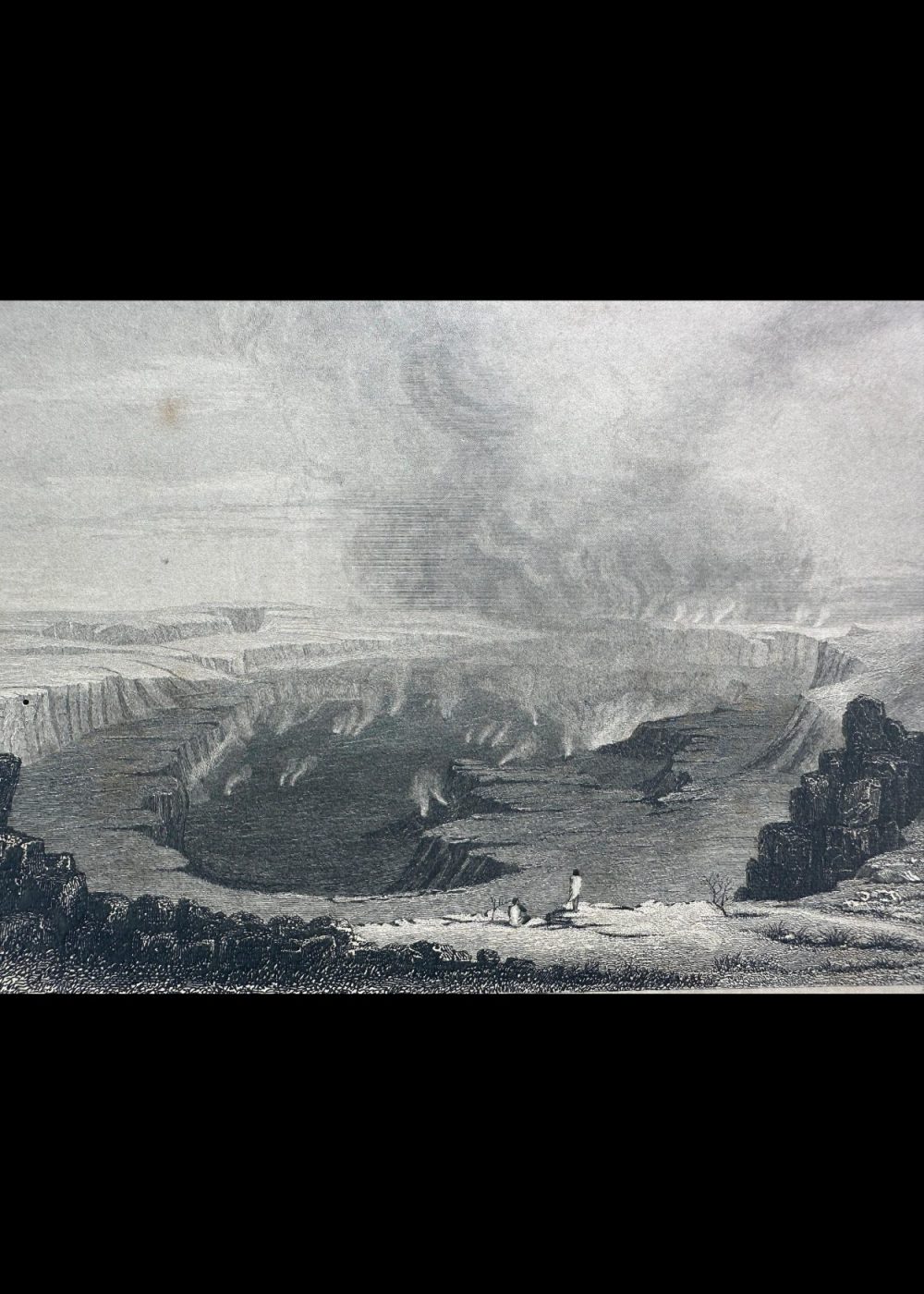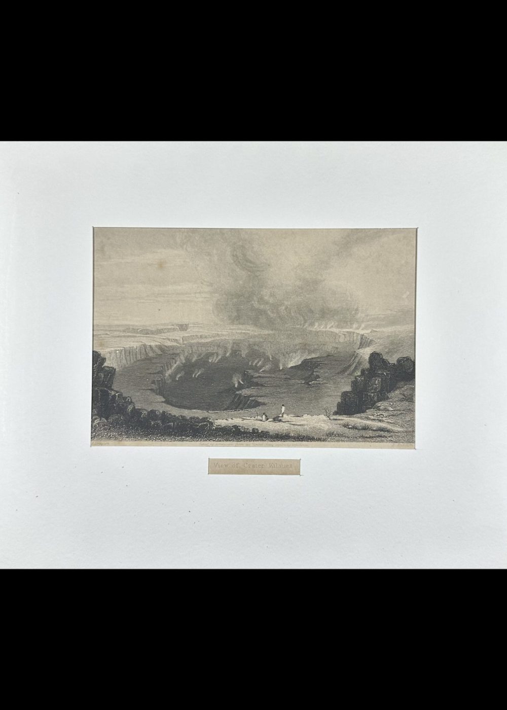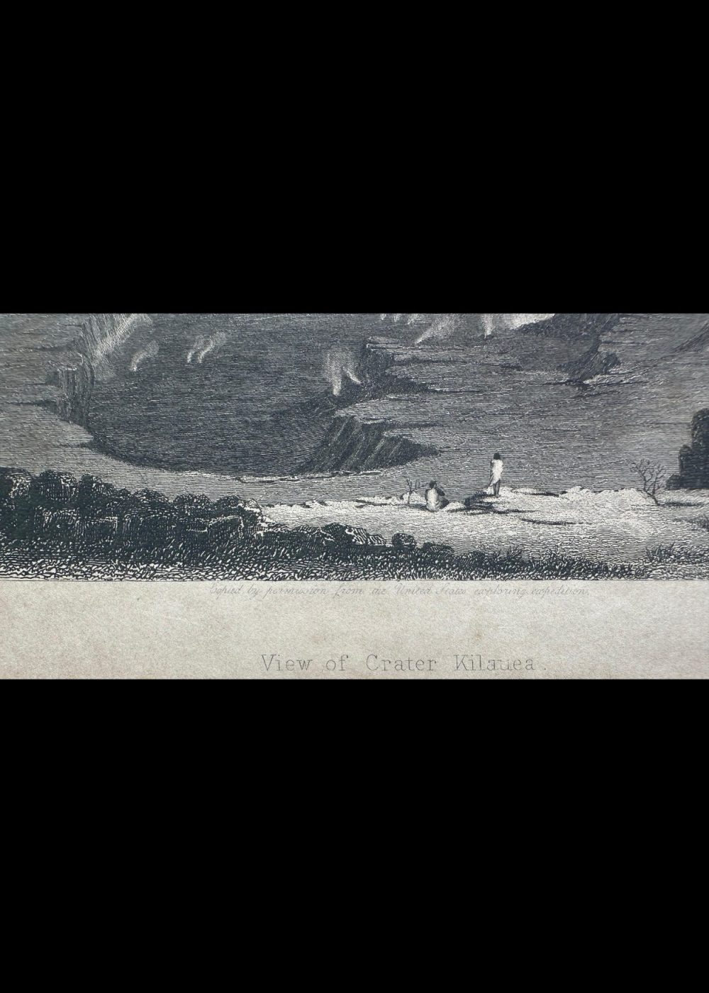 This engraving titled “View of Crater Kilauea” captures a dramatic depiction of Hawaii’s famous volcanic crater. The vast caldera is illustrated with smoldering vents and rising plumes of smoke, emphasizing the active and volatile nature of the site. The rugged landscape surrounding the crater is stark and barren, evoking a sense of awe and danger. In the foreground, small human figures observe the scene, adding scale to the immense geological formation. The artwork is attributed to J. Drayton and was likely produced as part of a 19th-century U.S. exploration, documenting natural wonders in vivid detail.