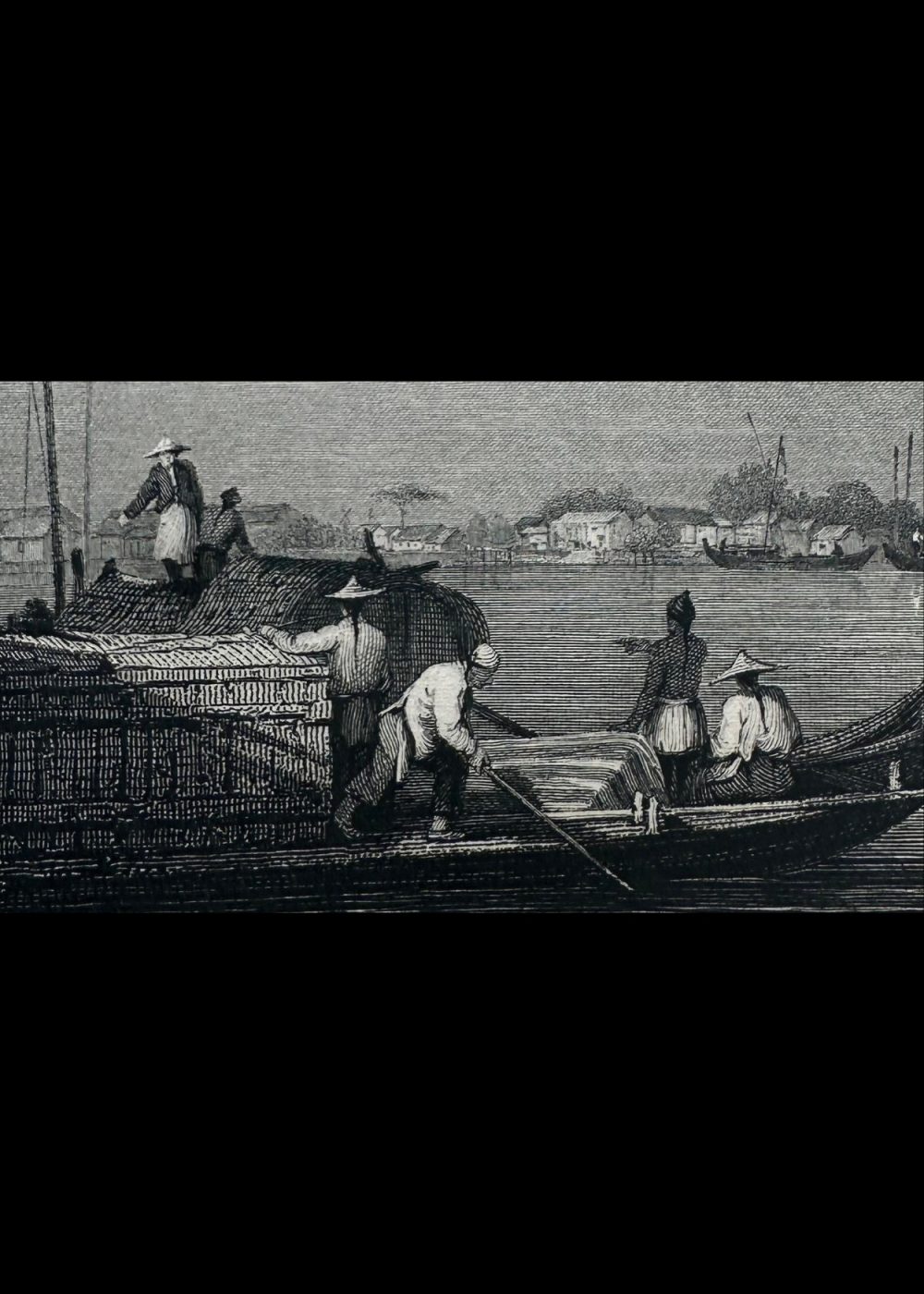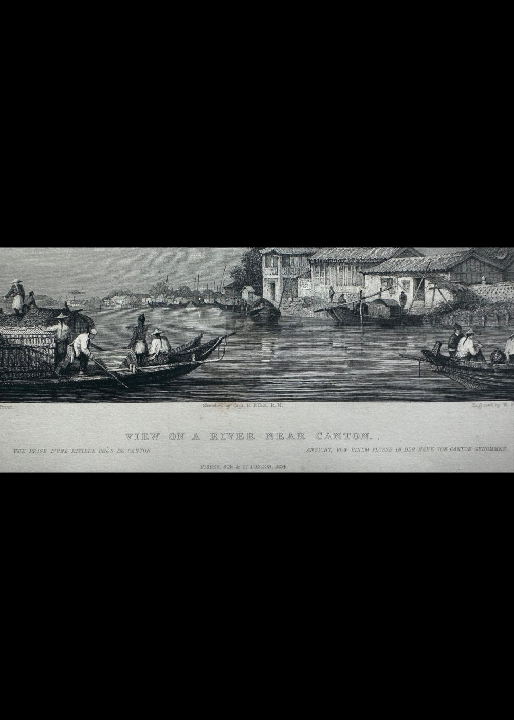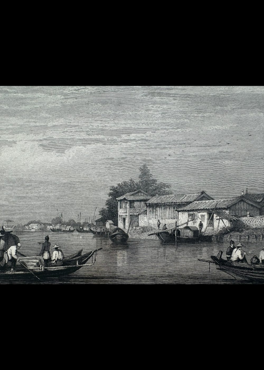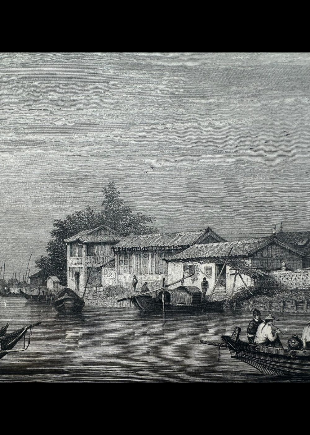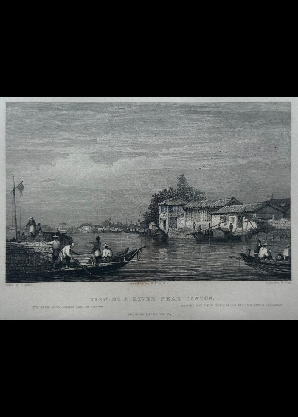 This engraving titled “View on a River Near Canton” presents a tranquil scene of river life near the city of Canton (modern-day Guangzhou), China. The image features several boats along the river, with people engaged in various activities such as unloading cargo or fishing. In the background, traditional Chinese buildings line the shore, adding a cultural context to the bustling river scene. The calm water reflects the structures and the cloudy sky above.This work is part of the “India China” book and was created by the artist S. Prout, with the engraving done by W. Floyd. The scene was sketched by Captain R. Elliot, R.N. The artwork captures the vibrant daily life along the river near Canton, offering a glimpse into 19th-century Chinese riverine commerce and culture.