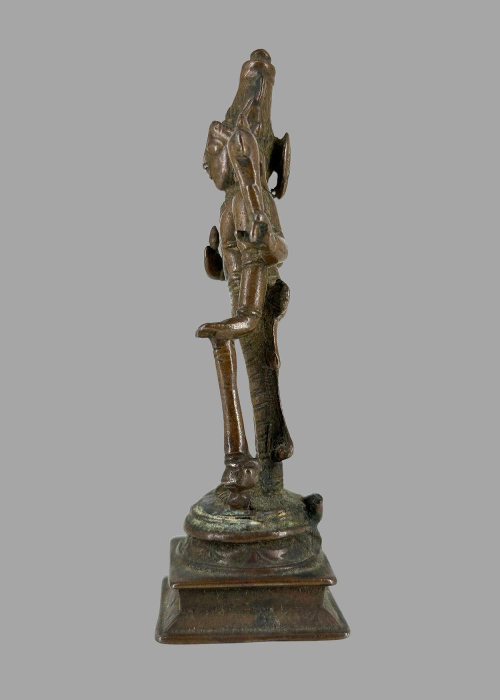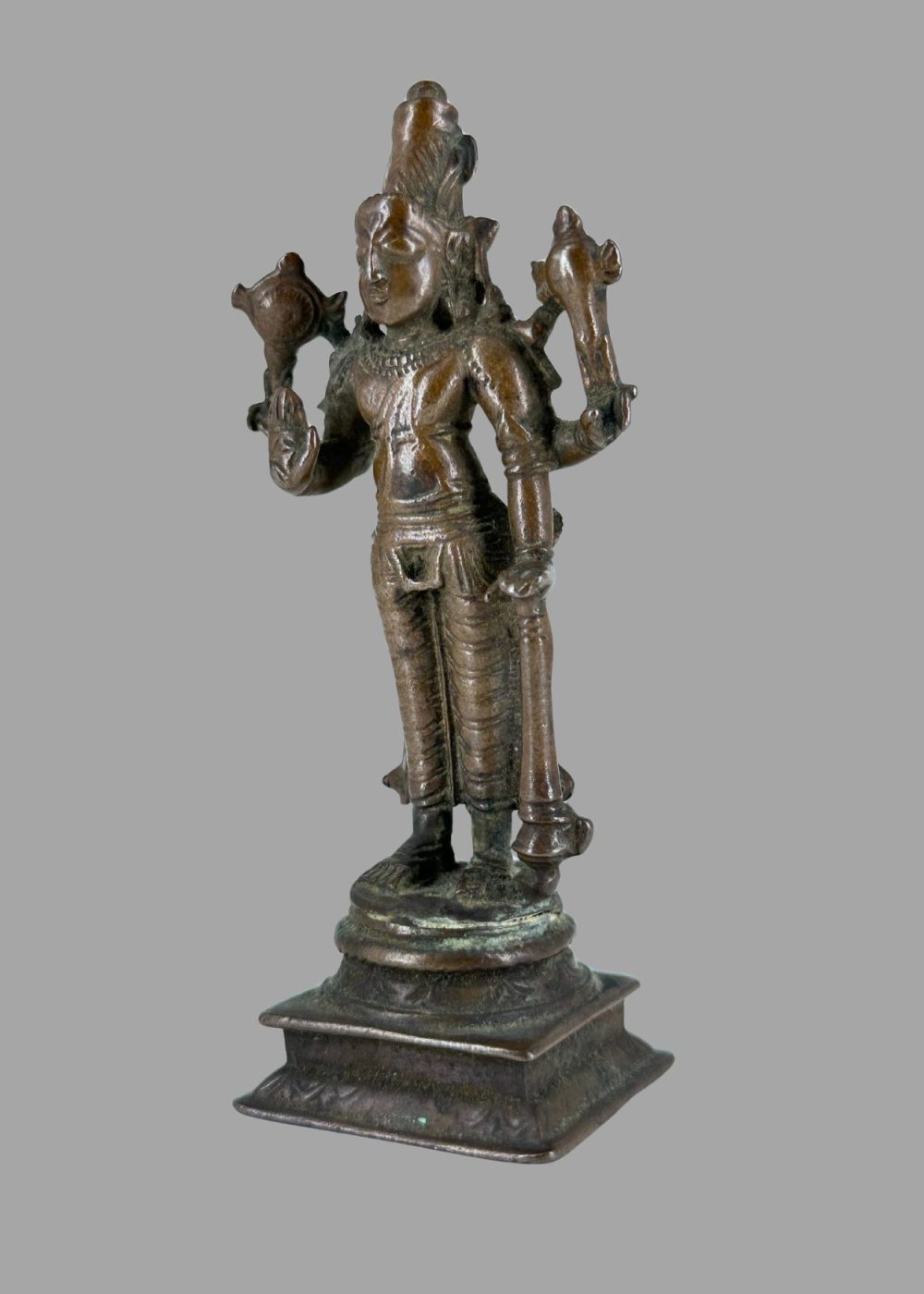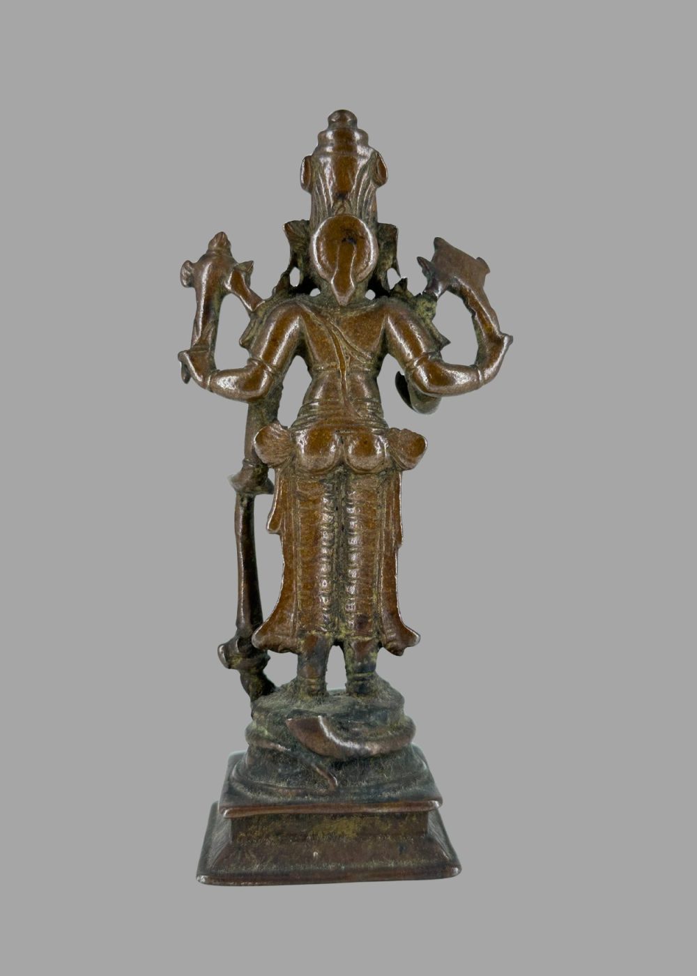 Cast in the twilight of the Vijayanagar empire, this bronze of Vishnu exudes quiet grandeur. The deity stands upright with four arms holding divine attributes—the chakra and conch—each a symbol of cosmic order and protection. Graceful detailing on the crown and ornamentation reflects the matured aesthetics of late Vijayanagar bronze work, while the symmetrical stance evokes balance and spiritual poise. Rooted in Karnataka’s temple tradition, this icon served both ritual devotion and royal patronage.