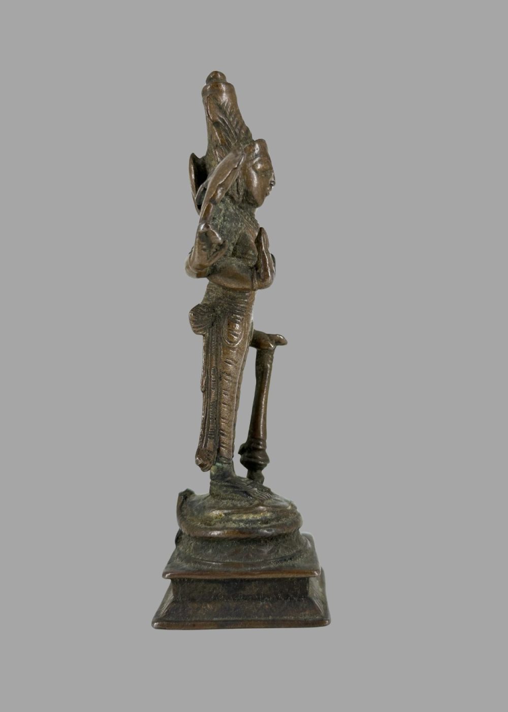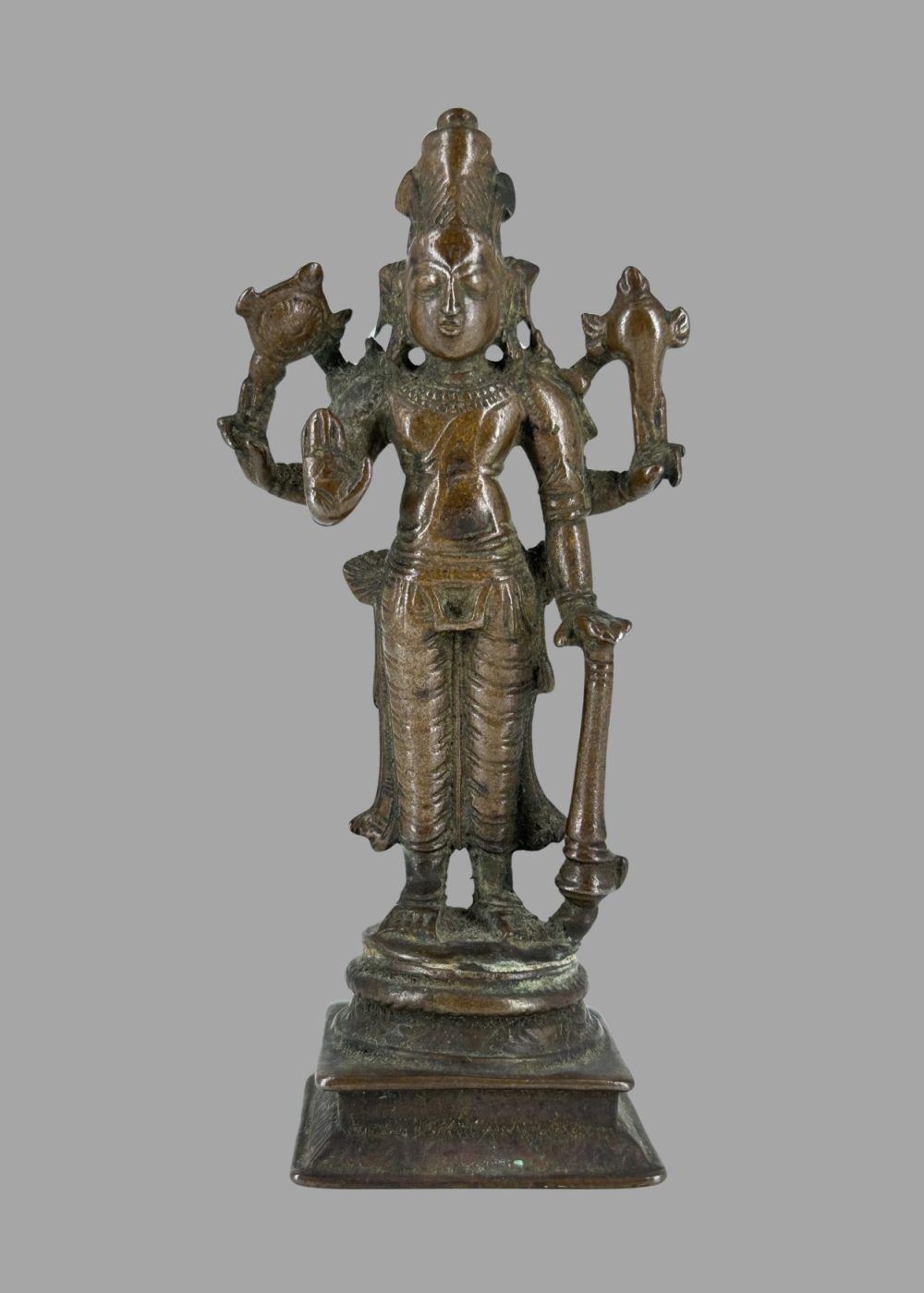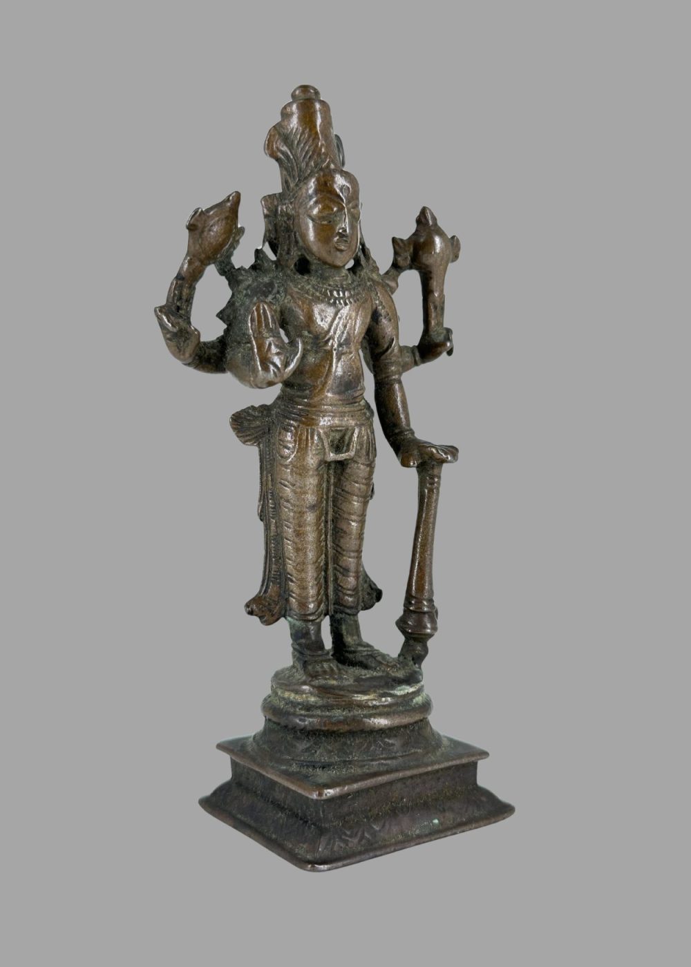 Cast in the twilight of the Vijayanagar empire, this bronze of Vishnu exudes quiet grandeur. The deity stands upright with four arms holding divine attributes—the chakra and conch—each a symbol of cosmic order and protection. Graceful detailing on the crown and ornamentation reflects the matured aesthetics of late Vijayanagar bronze work, while the symmetrical stance evokes balance and spiritual poise. Rooted in Karnataka’s temple tradition, this icon served both ritual devotion and royal patronage.