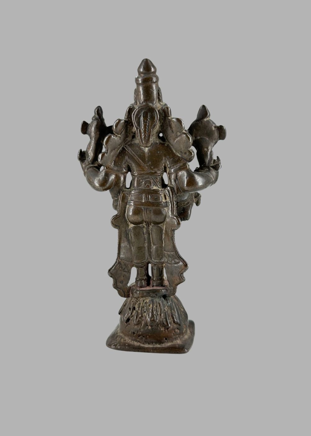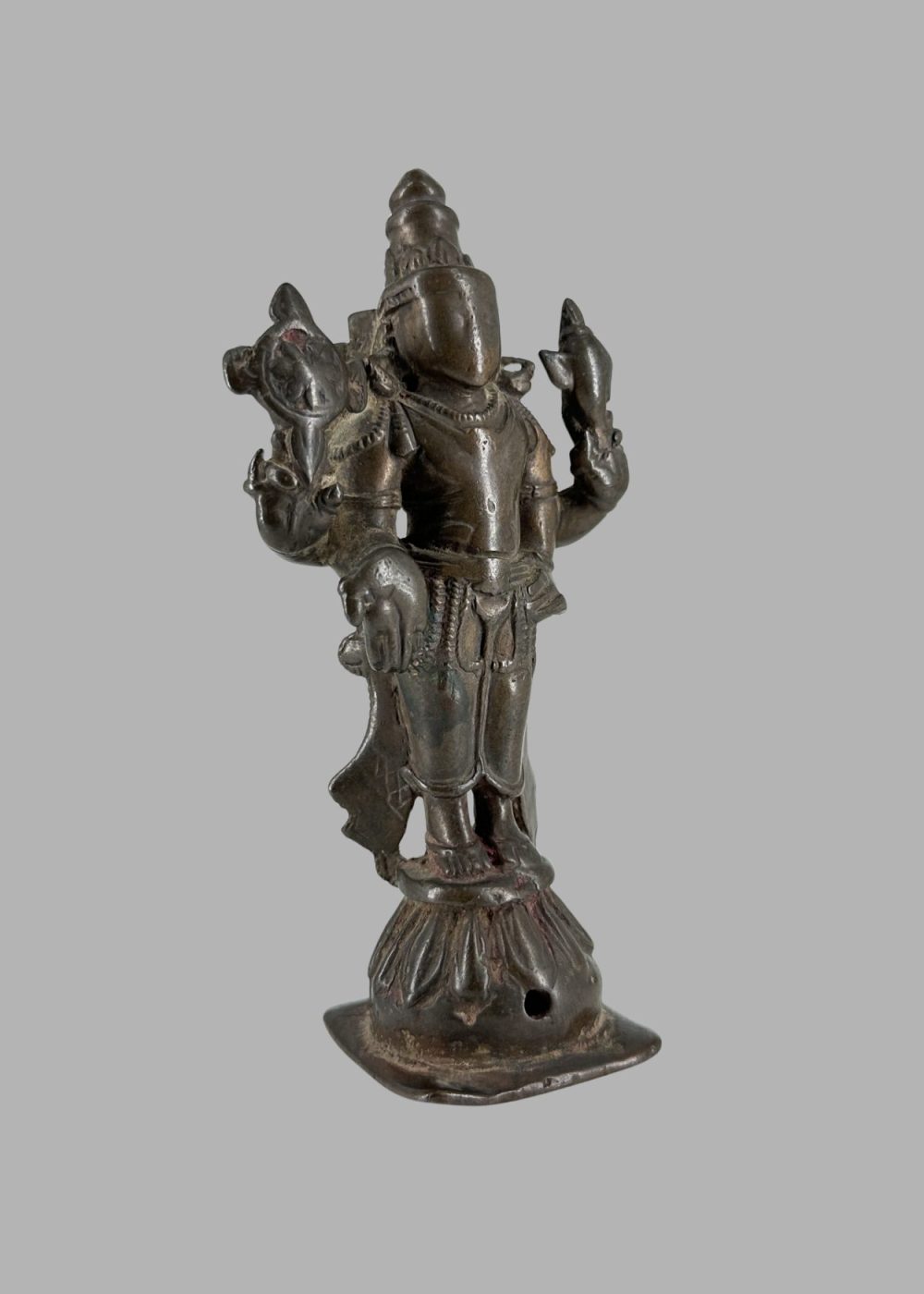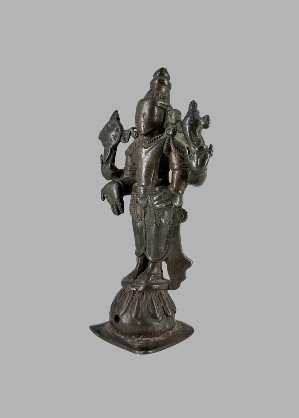 This finely cast bronze of Vishnu, the preserver deity of the Hindu Trinity, embodies divine grace and cosmic order. Depicted with four arms, he holds the chakra, shankha, gada, and padma—emblems of power, righteousness, and prosperity. The symmetrical stance, ornate crown, and delicately rendered ornaments reflect the devotional artistry and metallurgical skill of Tamil craftsmen. Such images were central to temple ritual, serving as both visual and spiritual anchors during processions and worship.