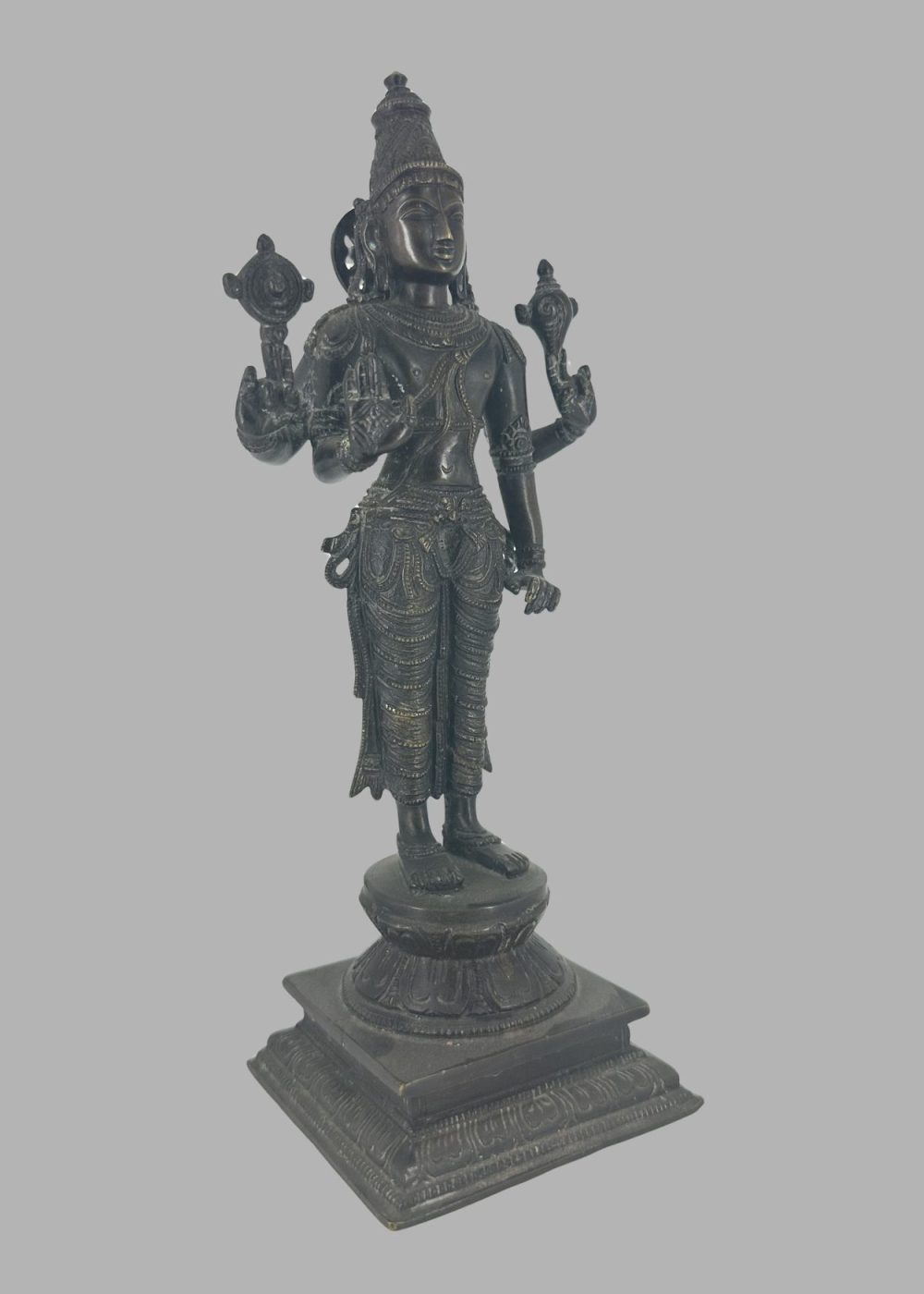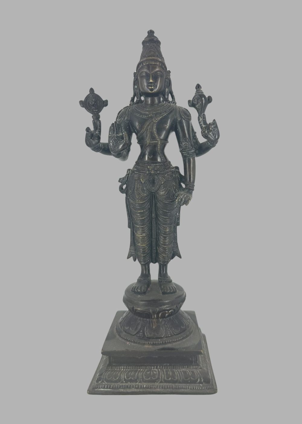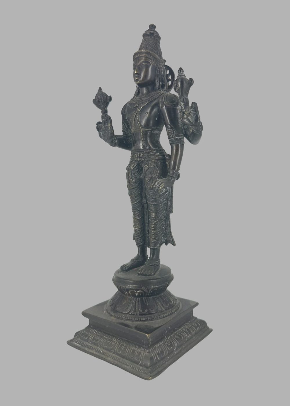 A cast bronze figure of Vishnu from Karnataka, dated to the, stands in a graceful tribhanga pose on a circular lotus base. The deity is depicted with four arms, bearing his traditional emblems—chakra, shankha, gada, and padma—symbolizing cosmic authority, protection, and divine order. Adorned with stylized jewelry and drapery, the sculpture reflects continuity with classical iconographic conventions, serving both ritual and devotional purpose in modern temple practice.