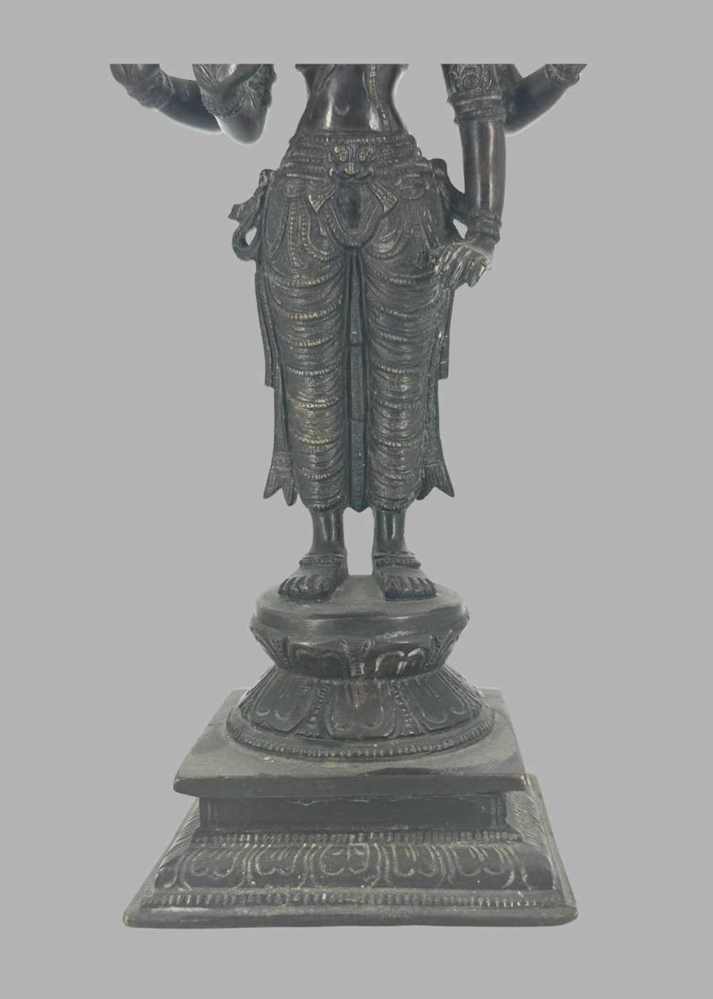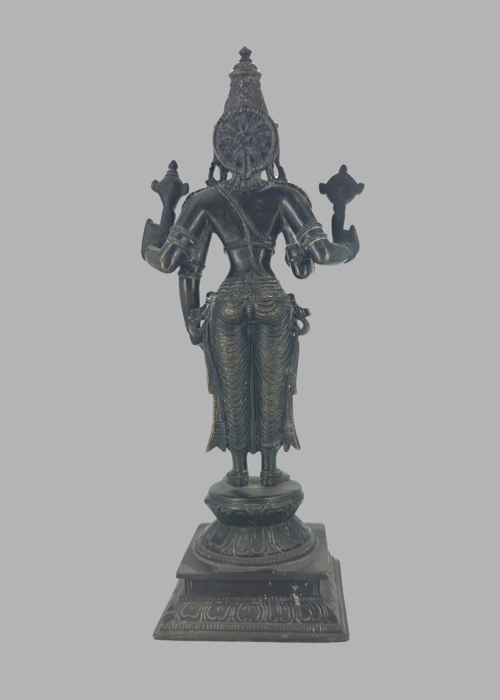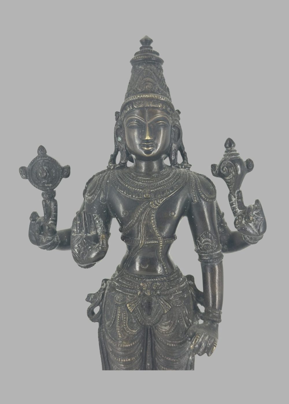 A cast bronze figure of Vishnu from Karnataka, dated to the, stands in a graceful tribhanga pose on a circular lotus base. The deity is depicted with four arms, bearing his traditional emblems—chakra, shankha, gada, and padma—symbolizing cosmic authority, protection, and divine order. Adorned with stylized jewelry and drapery, the sculpture reflects continuity with classical iconographic conventions, serving both ritual and devotional purpose in modern temple practice.
