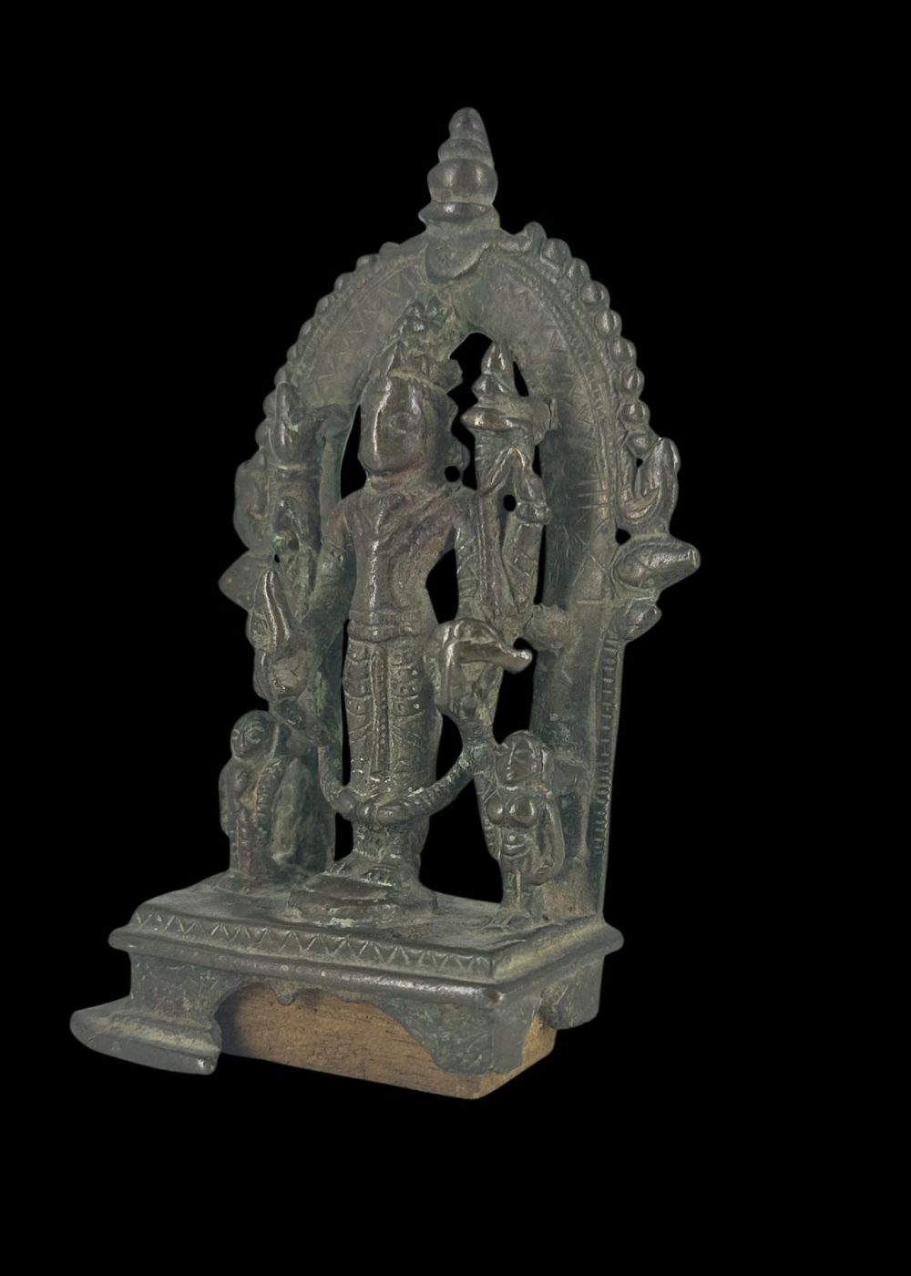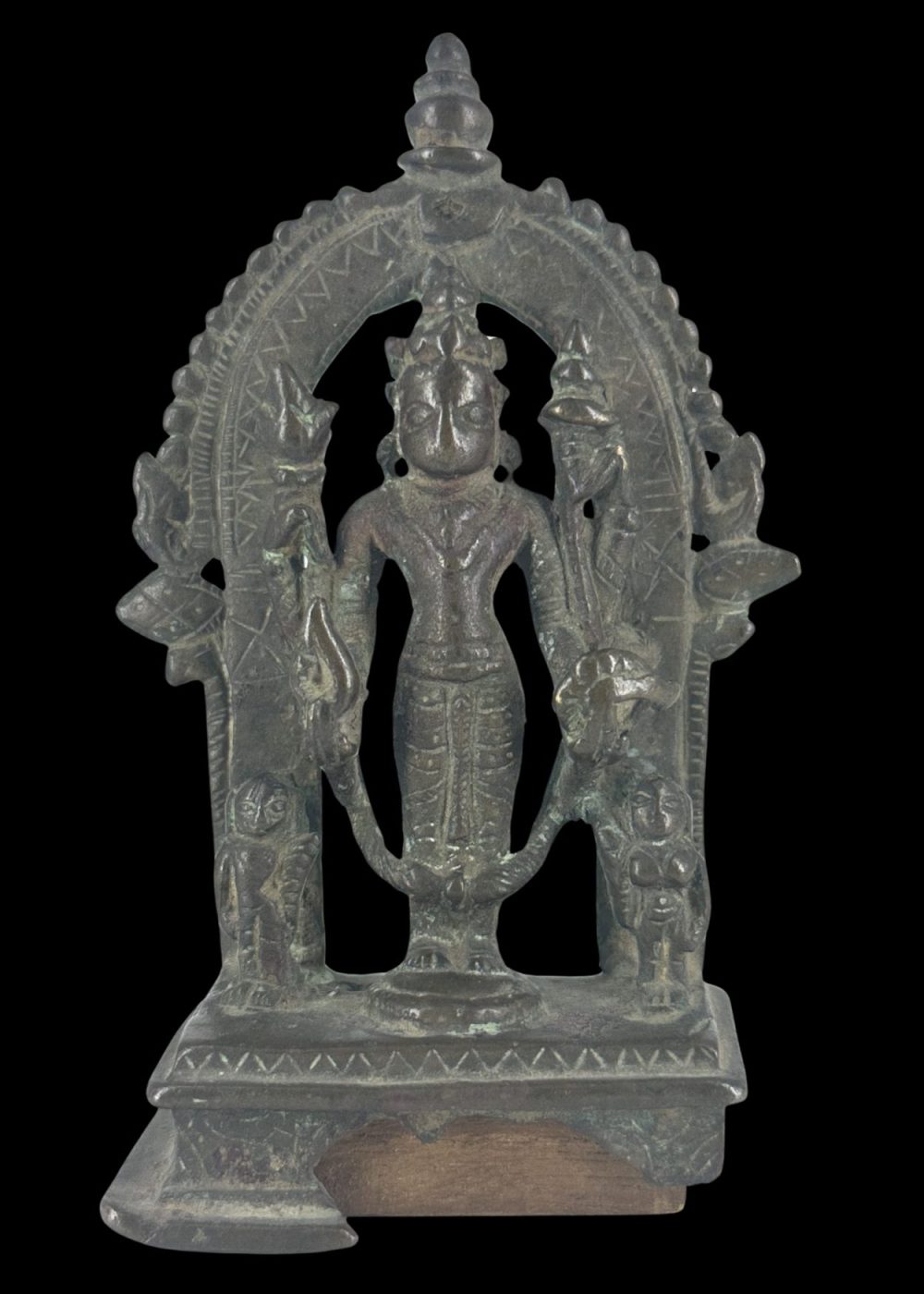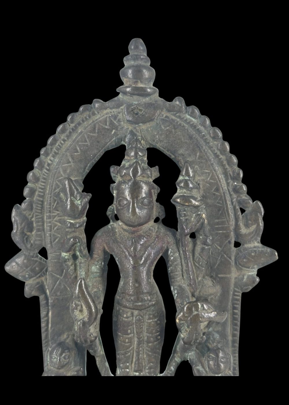 This bronze sculpture of Vishnu, dating from the, was crafted in Bengal. Vishnu is depicted in a frontal, standing posture with four arms, holding his traditional attributes: the conch (shankha), discus (chakra), mace (gada), and lotus (padma). He stands beneath an ornate arch (torana) adorned with intricate geometric patterns and stylized motifs. Flanking the deity are attendant figures and mythical beasts, possibly lions or yalis, symbolizing divine protection. The sculpture reflects the devotional art and bronze-casting expertise of medieval Bengal, blending iconographic precision with regional artistic flourishes.