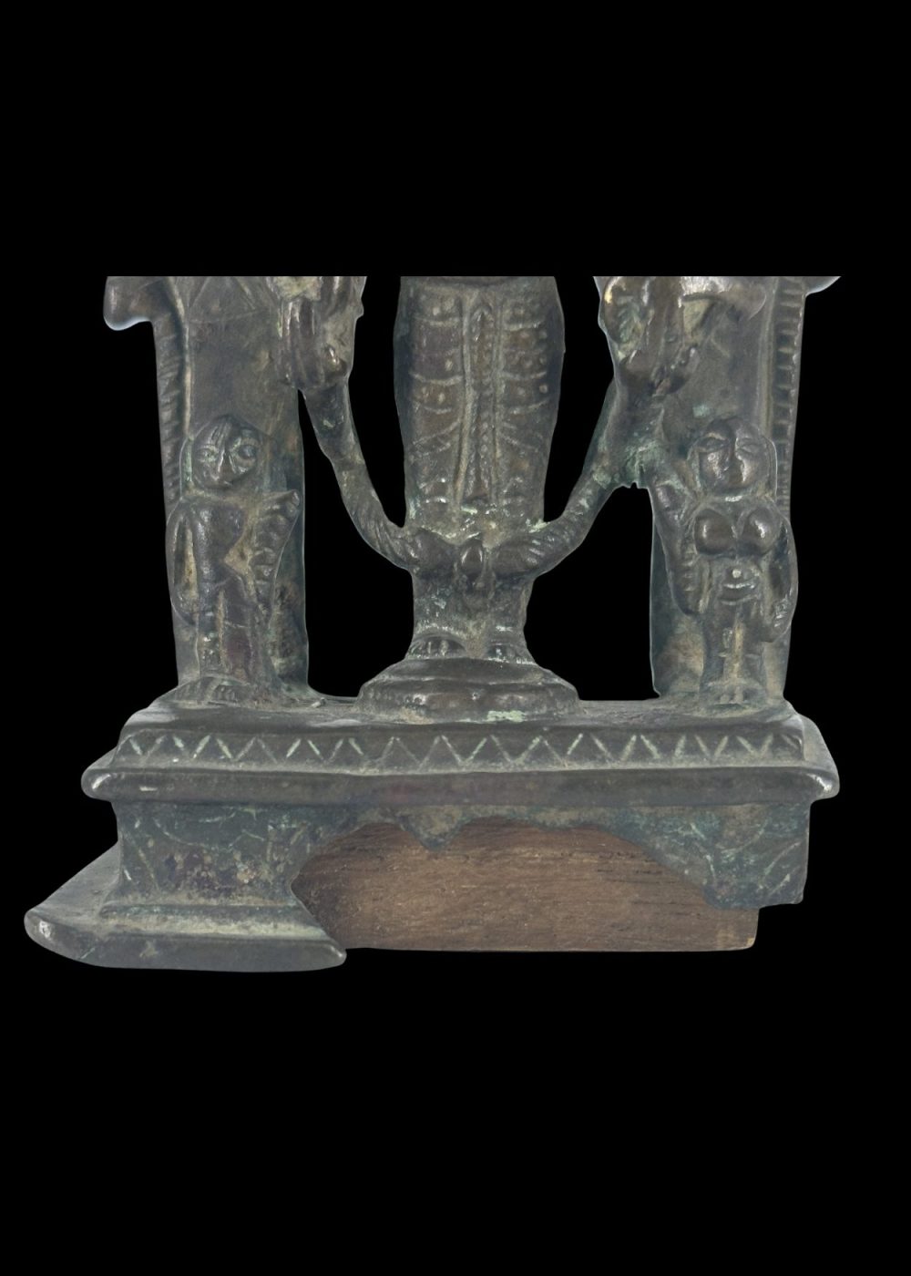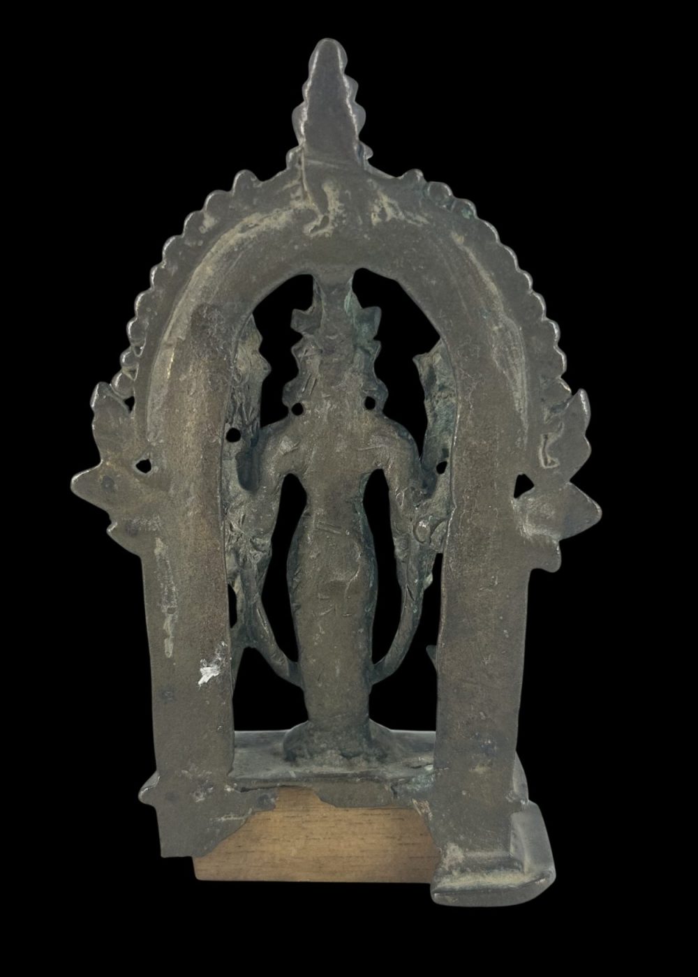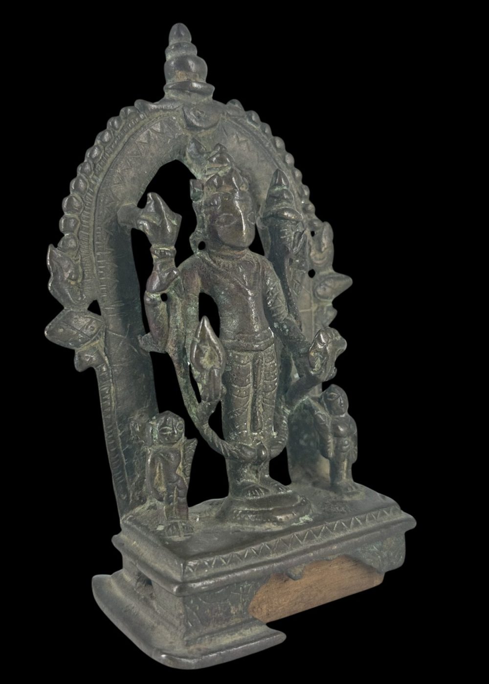 This bronze sculpture of Vishnu, dating from the, was crafted in Bengal. Vishnu is depicted in a frontal, standing posture with four arms, holding his traditional attributes: the conch (shankha), discus (chakra), mace (gada), and lotus (padma). He stands beneath an ornate arch (torana) adorned with intricate geometric patterns and stylized motifs. Flanking the deity are attendant figures and mythical beasts, possibly lions or yalis, symbolizing divine protection. The sculpture reflects the devotional art and bronze-casting expertise of medieval Bengal, blending iconographic precision with regional artistic flourishes.