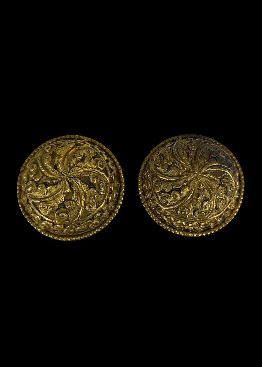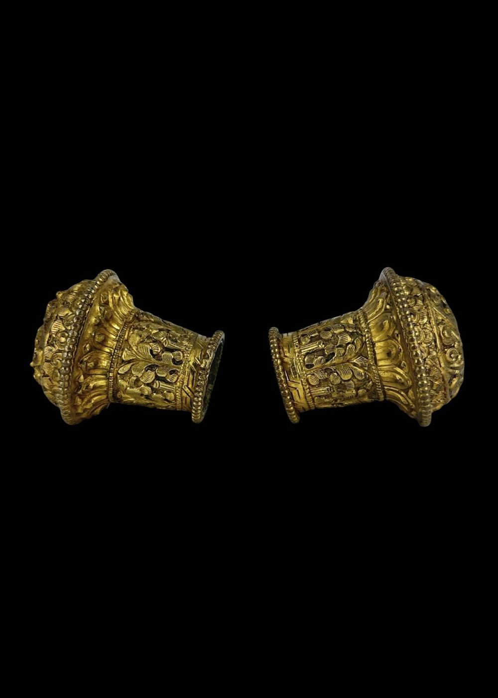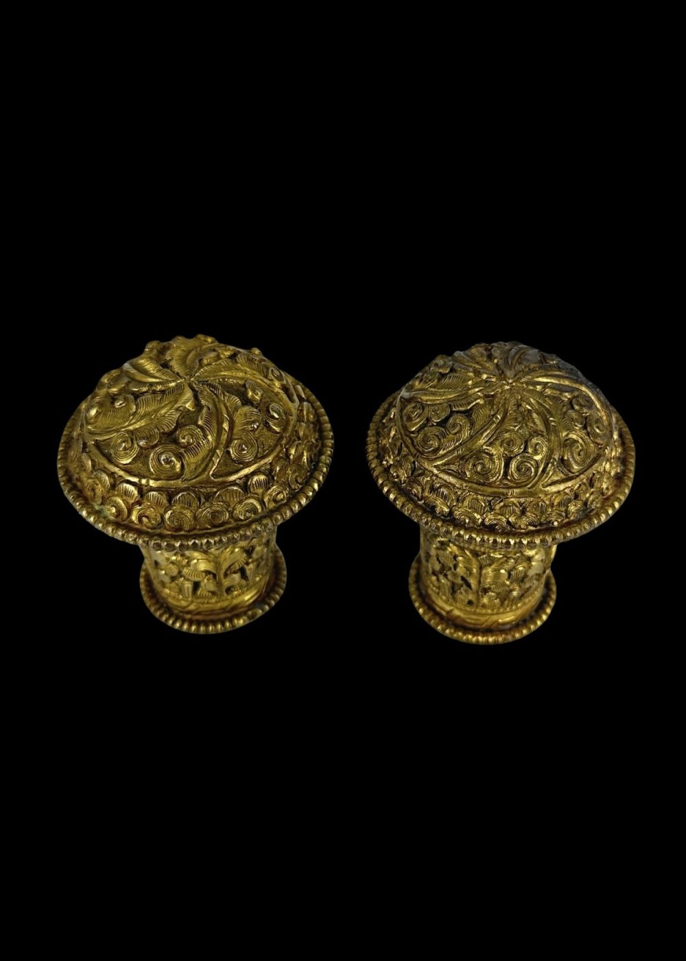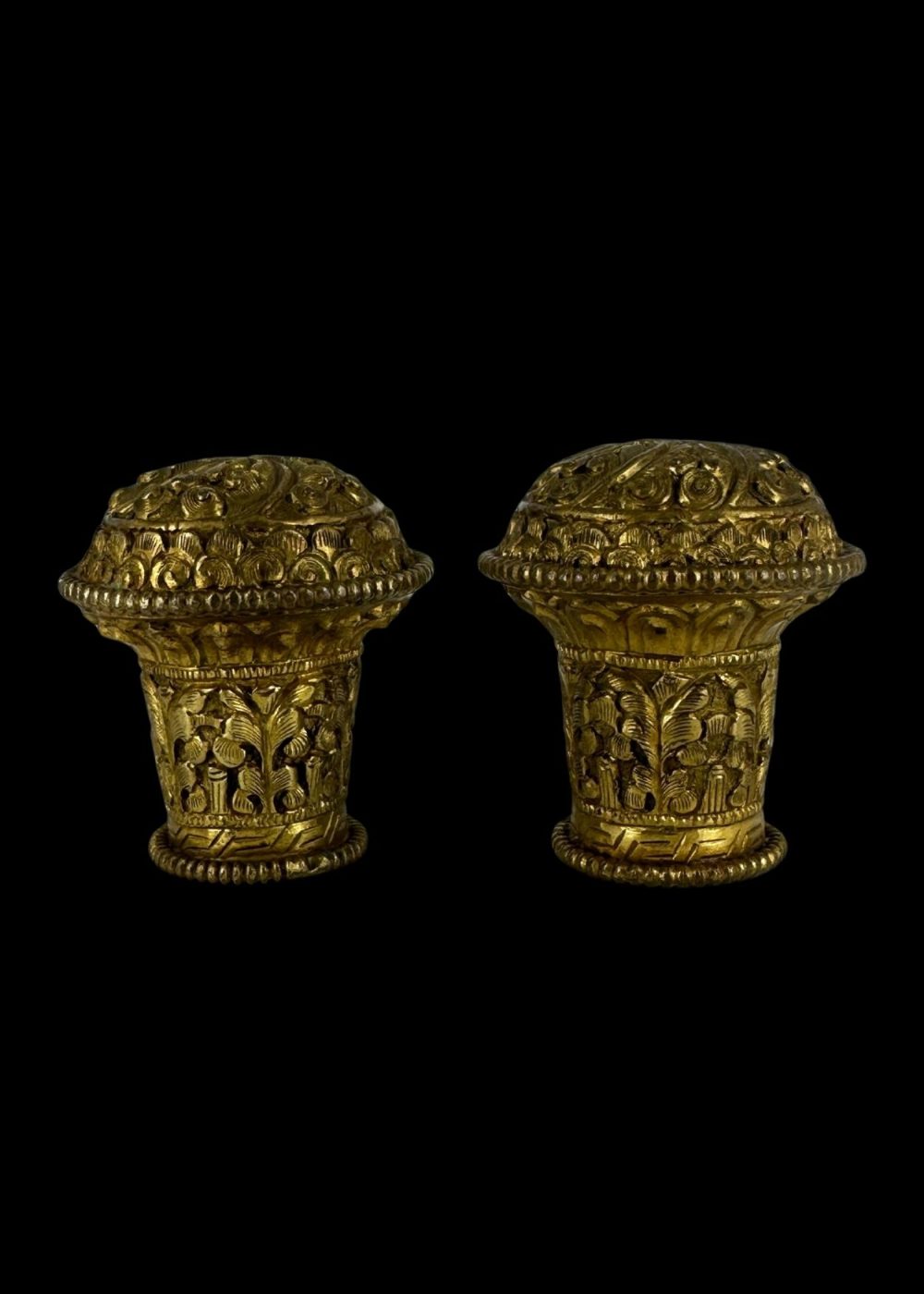This pair of ceremonial kanka holders features wide, lotus-tiered bases supporting baluster stems and gently flared dishes. Each stem is fluted and subtly swollen at the midpoint, capped with foliated collars that rise into shallow offering dishes. The undersides are ornamented with incised scrollwork, while the interior of each dish bears a delicate lotus medallion. Flame motifs and beaded borders punctuate the vertical rhythm of the design, offering rich texture and symbolic depth.A warm patina mingles with areas of fire-gilding, typical of Newar casting practice, where mercury-amalgam gilding was applied selectively to highlight sacred forms. Such restrained luminosity underscores the spiritual gravity of the objects while preserving the tactility of the bronze.