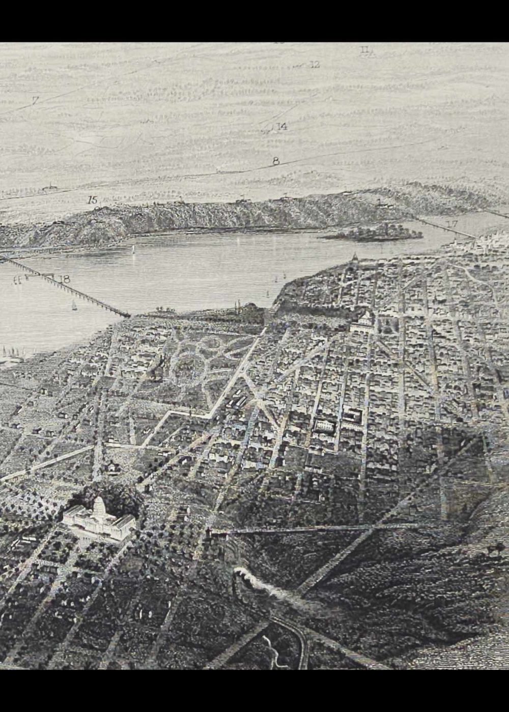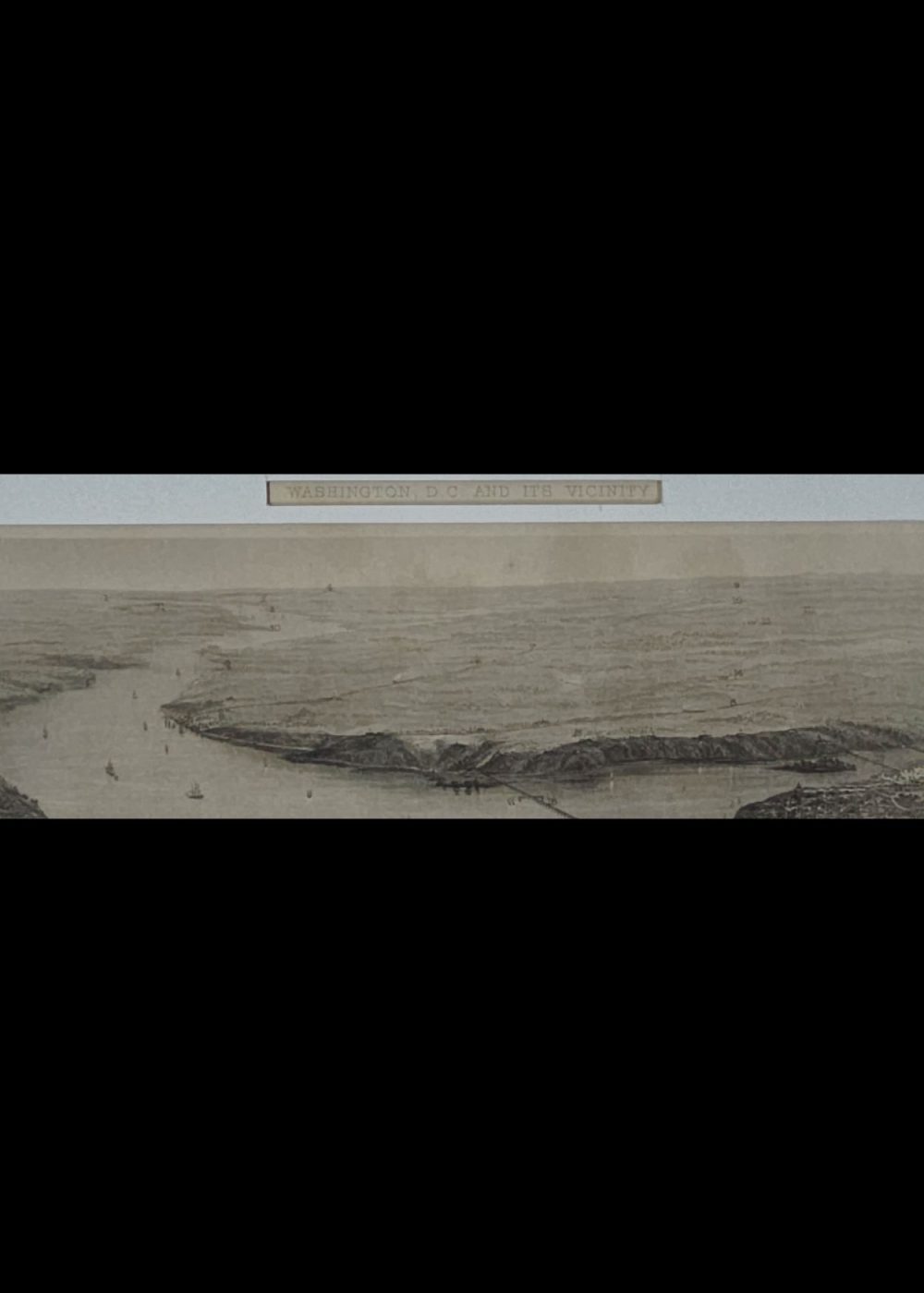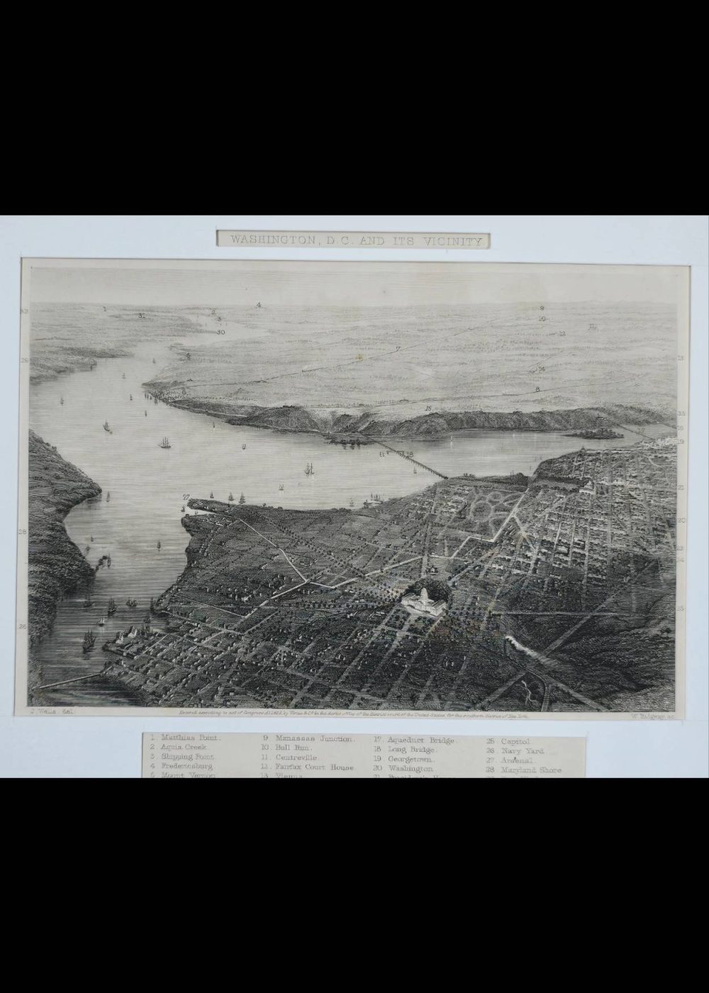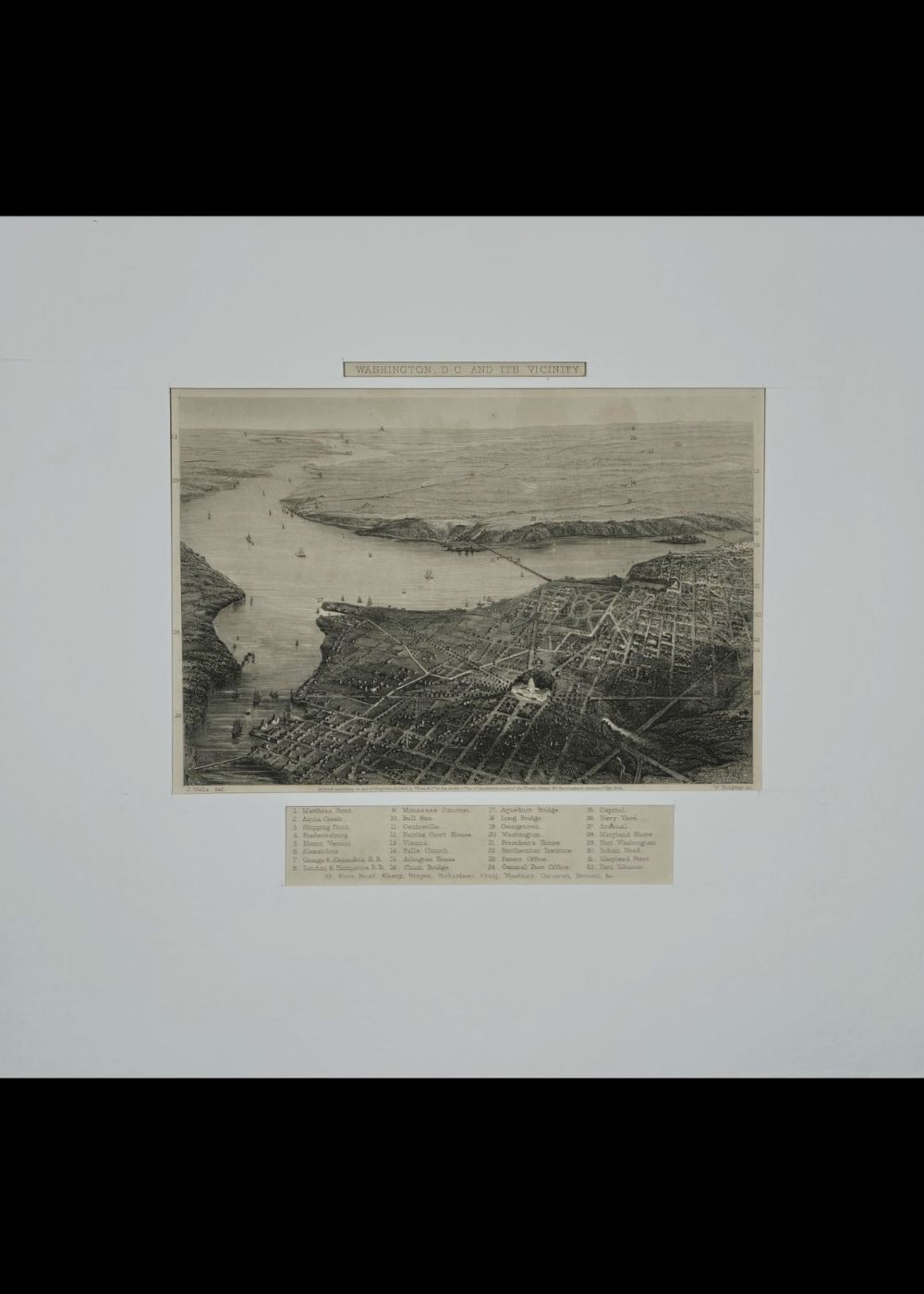 This is a vintage illustrated map titled “Washington, D.C. and Its Vicinity,” showing a bird’s-eye view of the city and surrounding areas along the Potomac River. The detailed engraving highlights significant landmarks, streets, and natural features, including the U.S. Capitol, the Washington Monument, and Arlington. A numbered index at the bottom identifies key locations such as Fort Washington, Georgetown, and various forts and junctions, reflecting the strategic and civic importance of the region during the 19th century. The map offers a historical perspective of Washington, D.C., emphasizing its layout and proximity to surrounding military and transportation hubs.